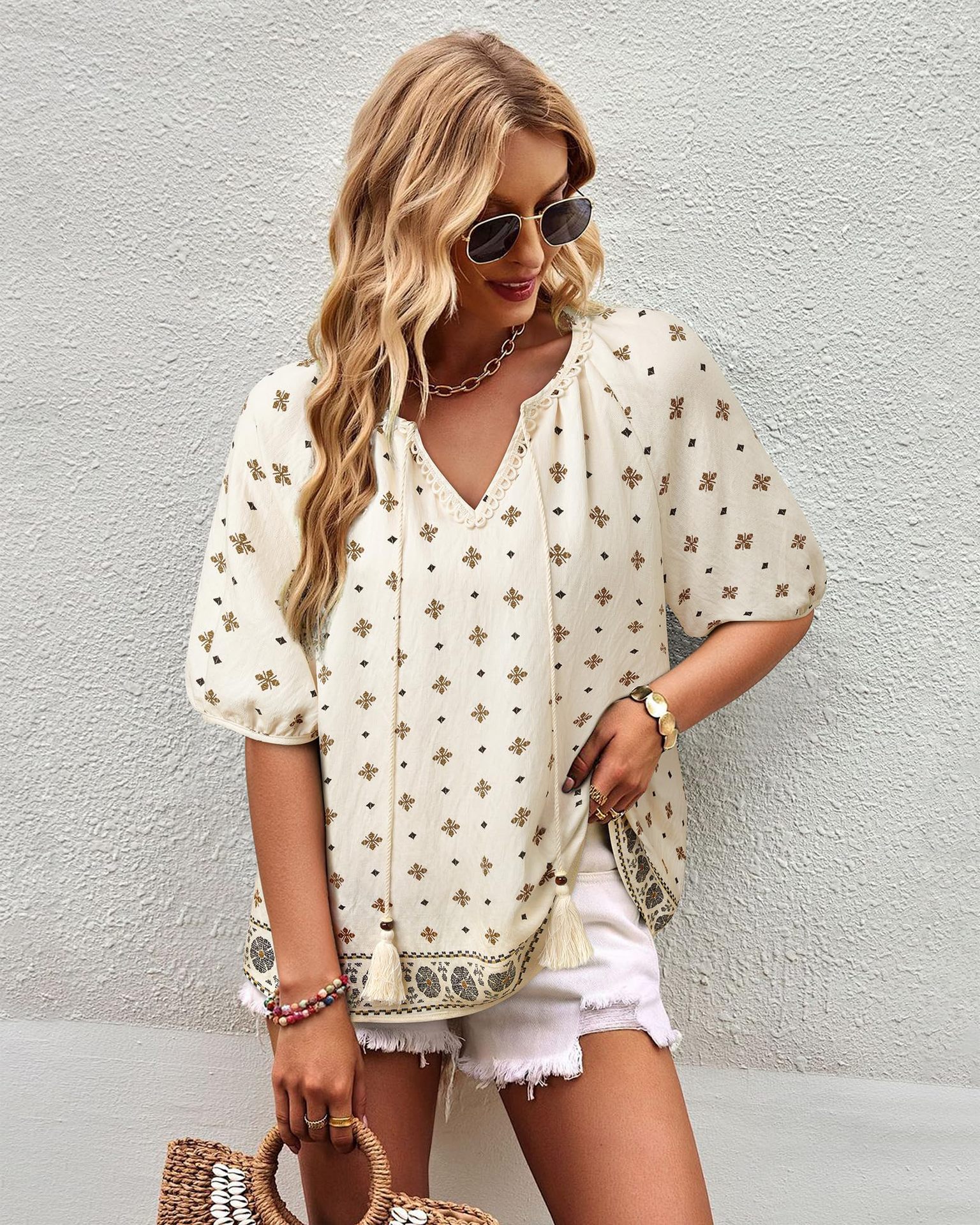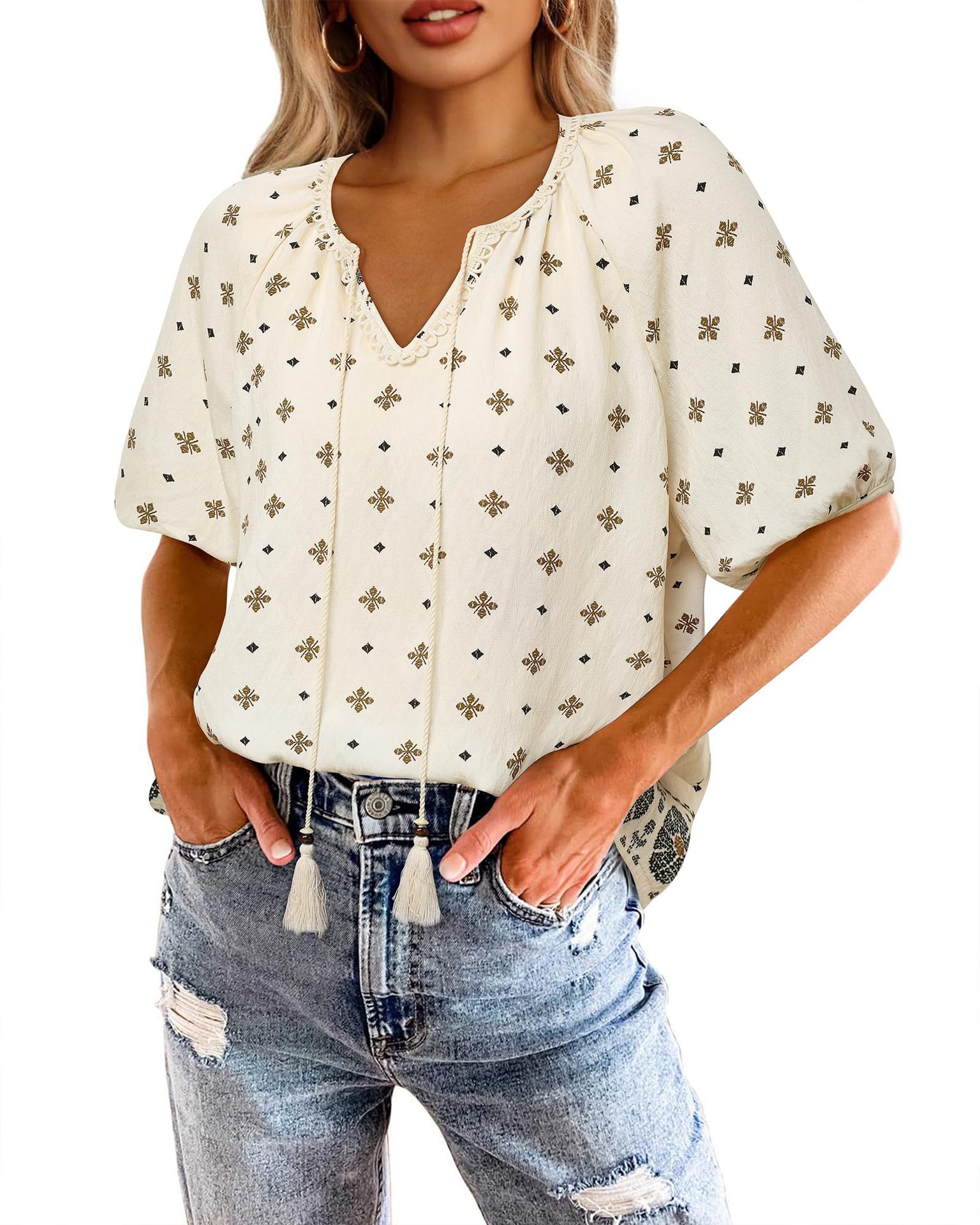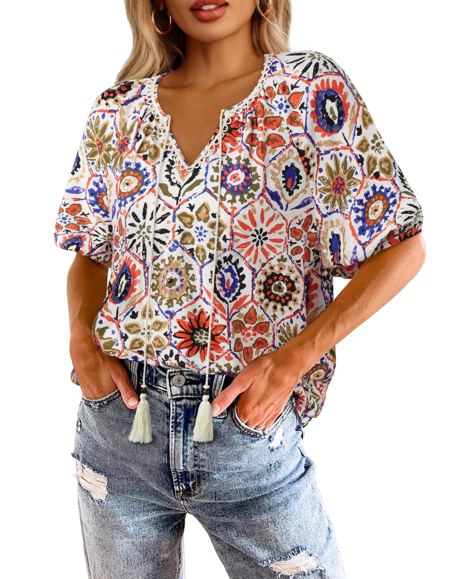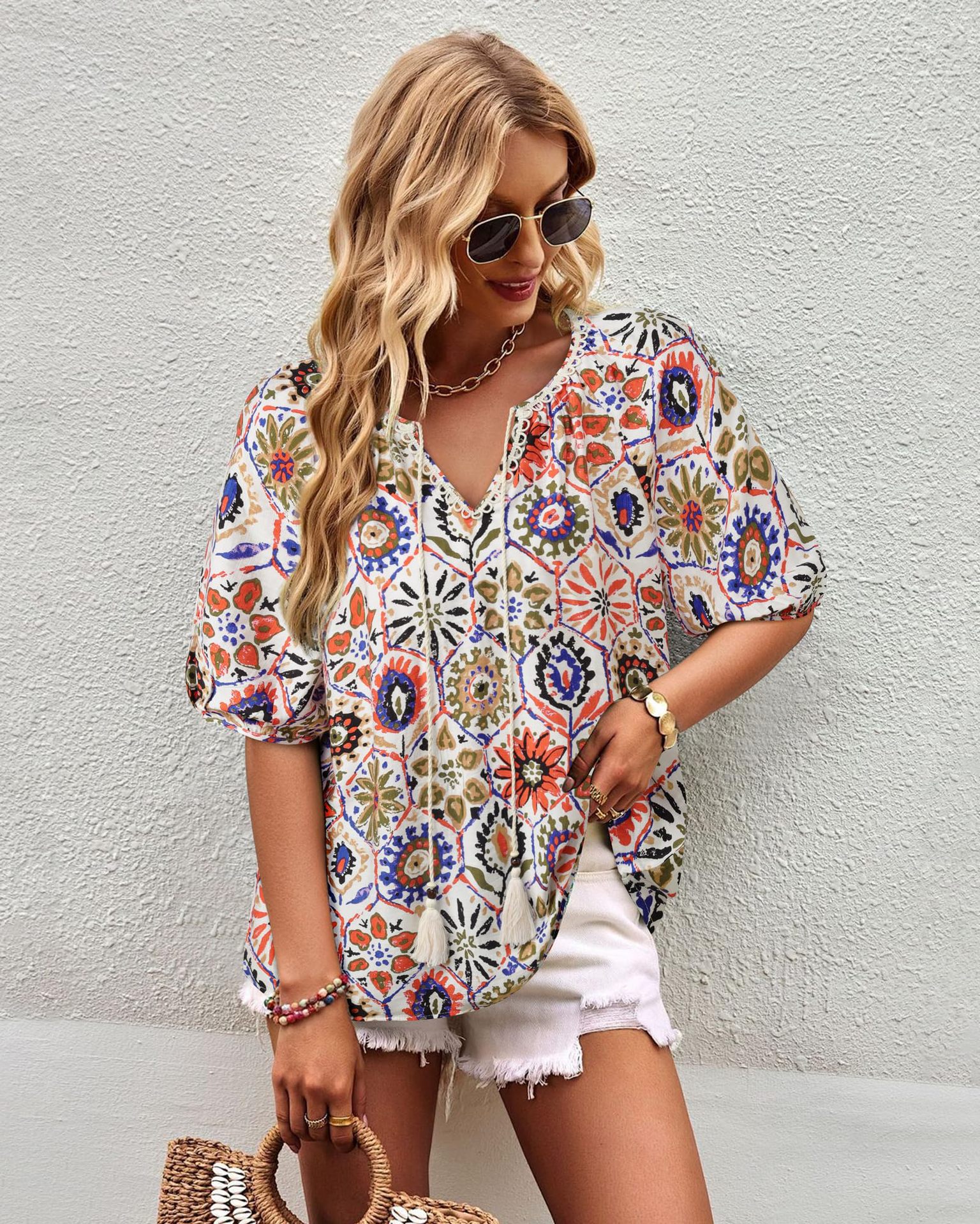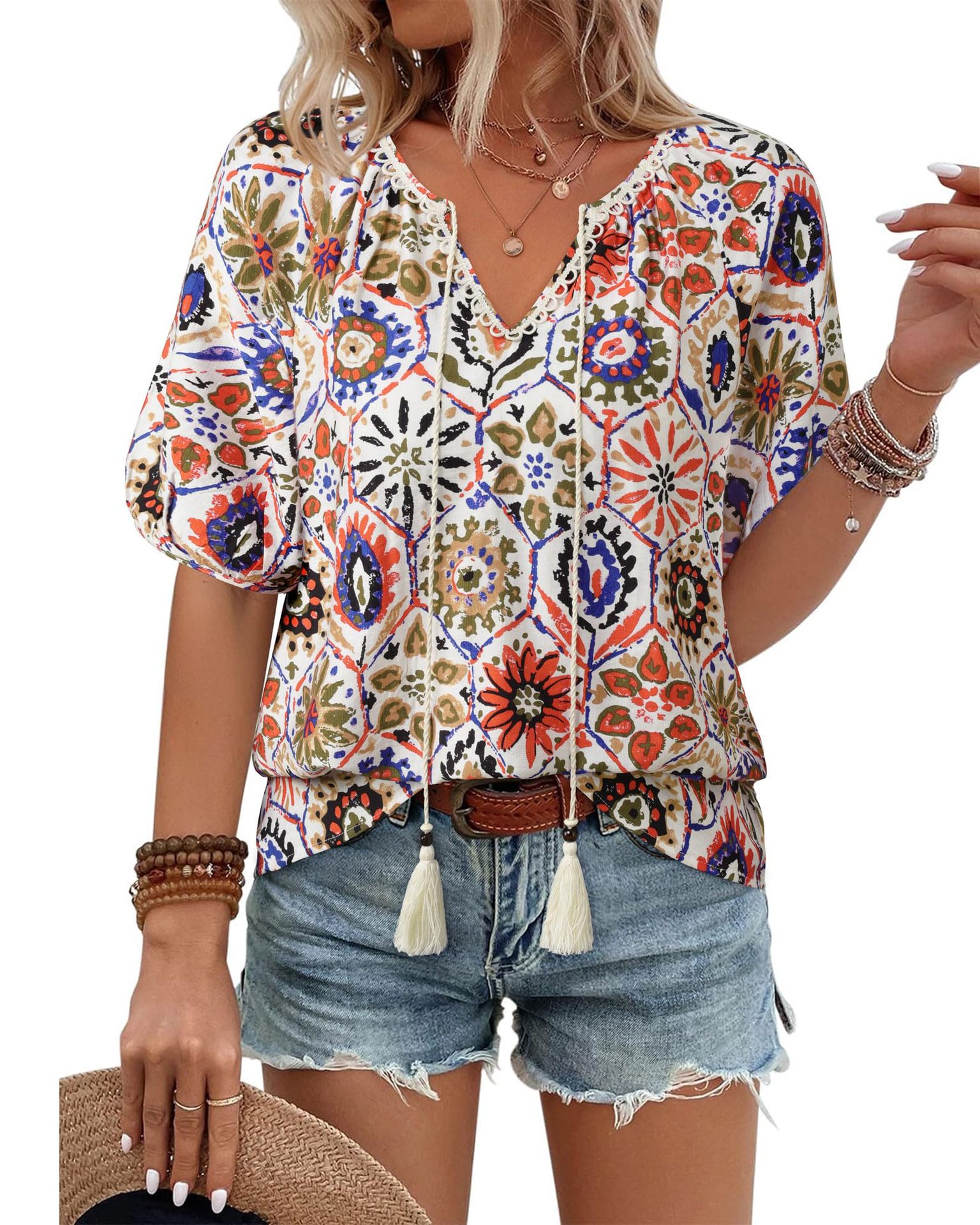 0 Review for Bohemian Casual V-neck Short-sleeve Printed Blouse