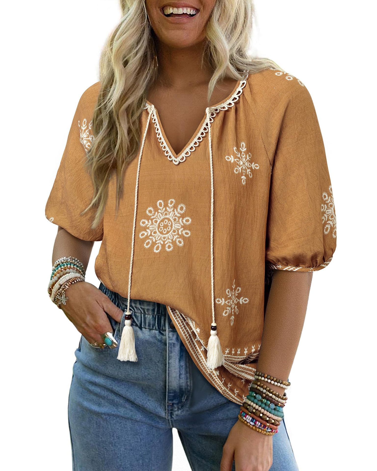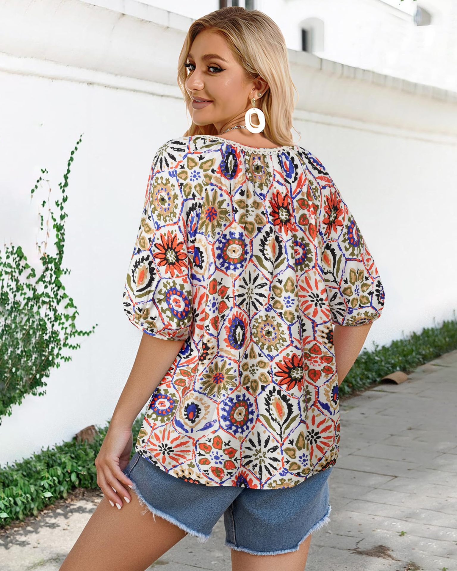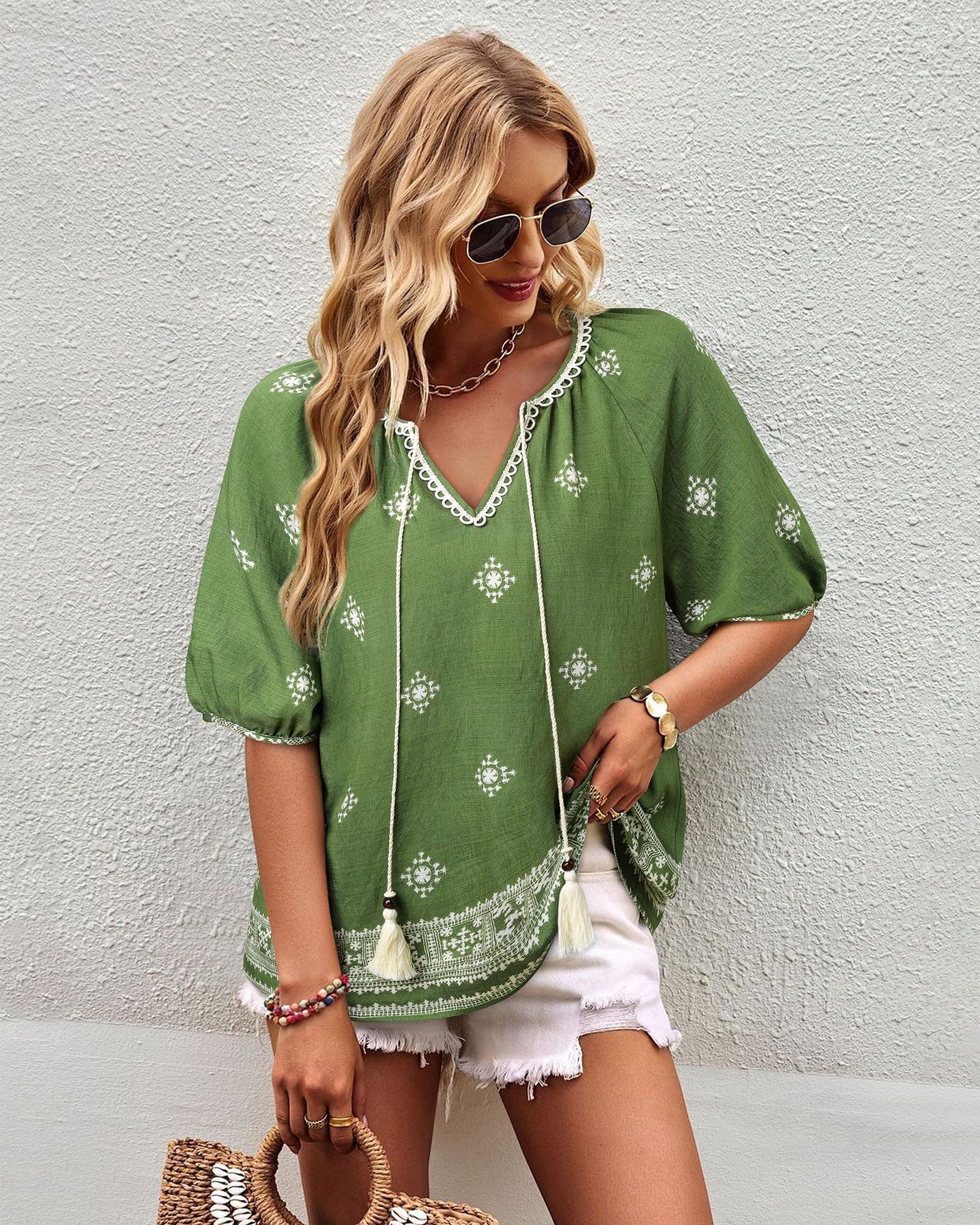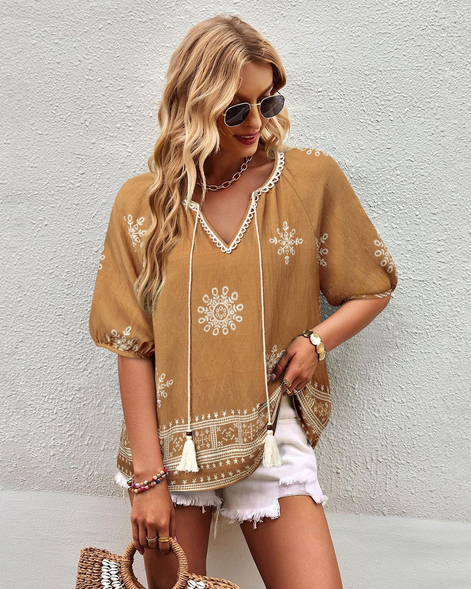 0 Review for Bohemian Casual V-neck Short-sleeve Printed Blouse