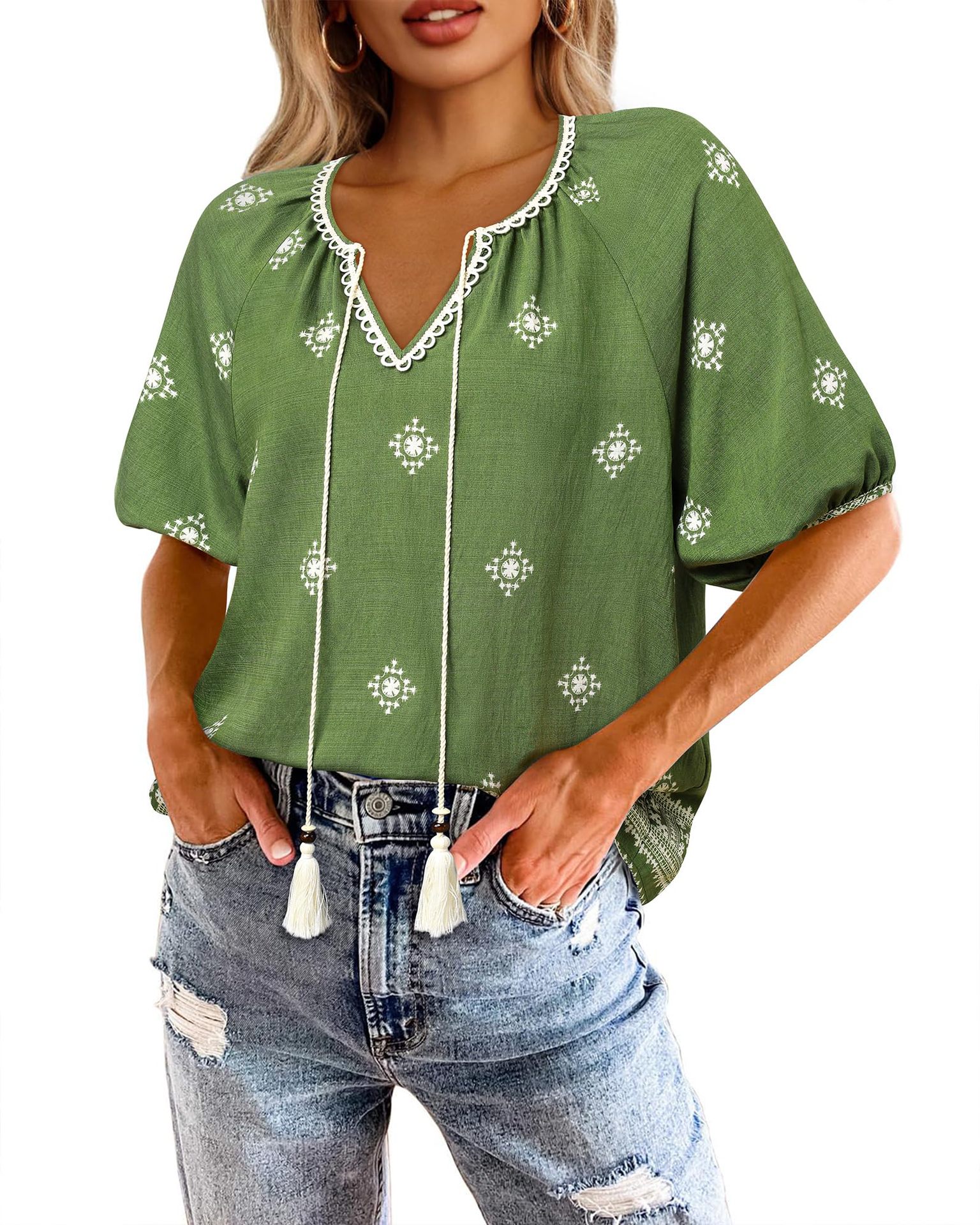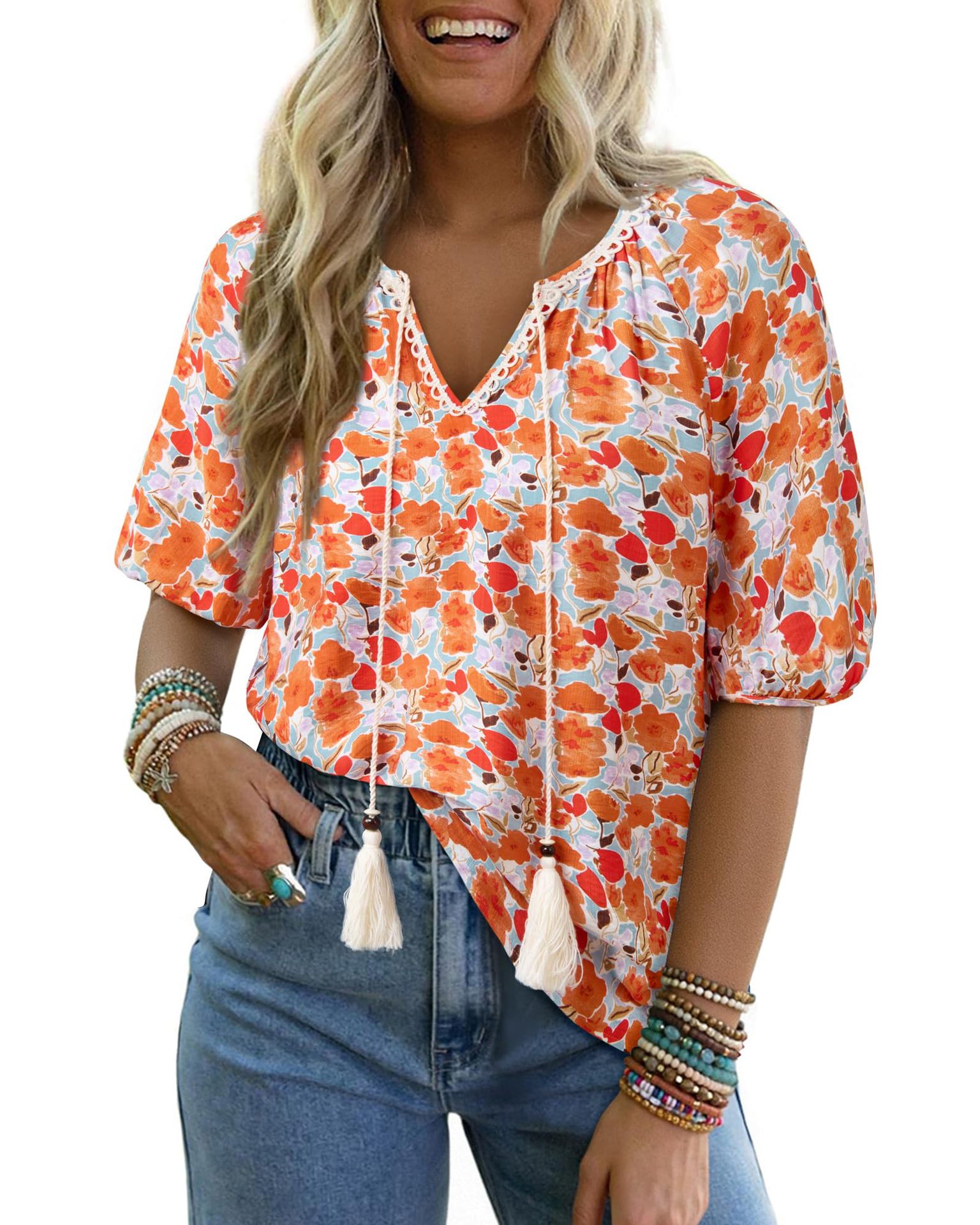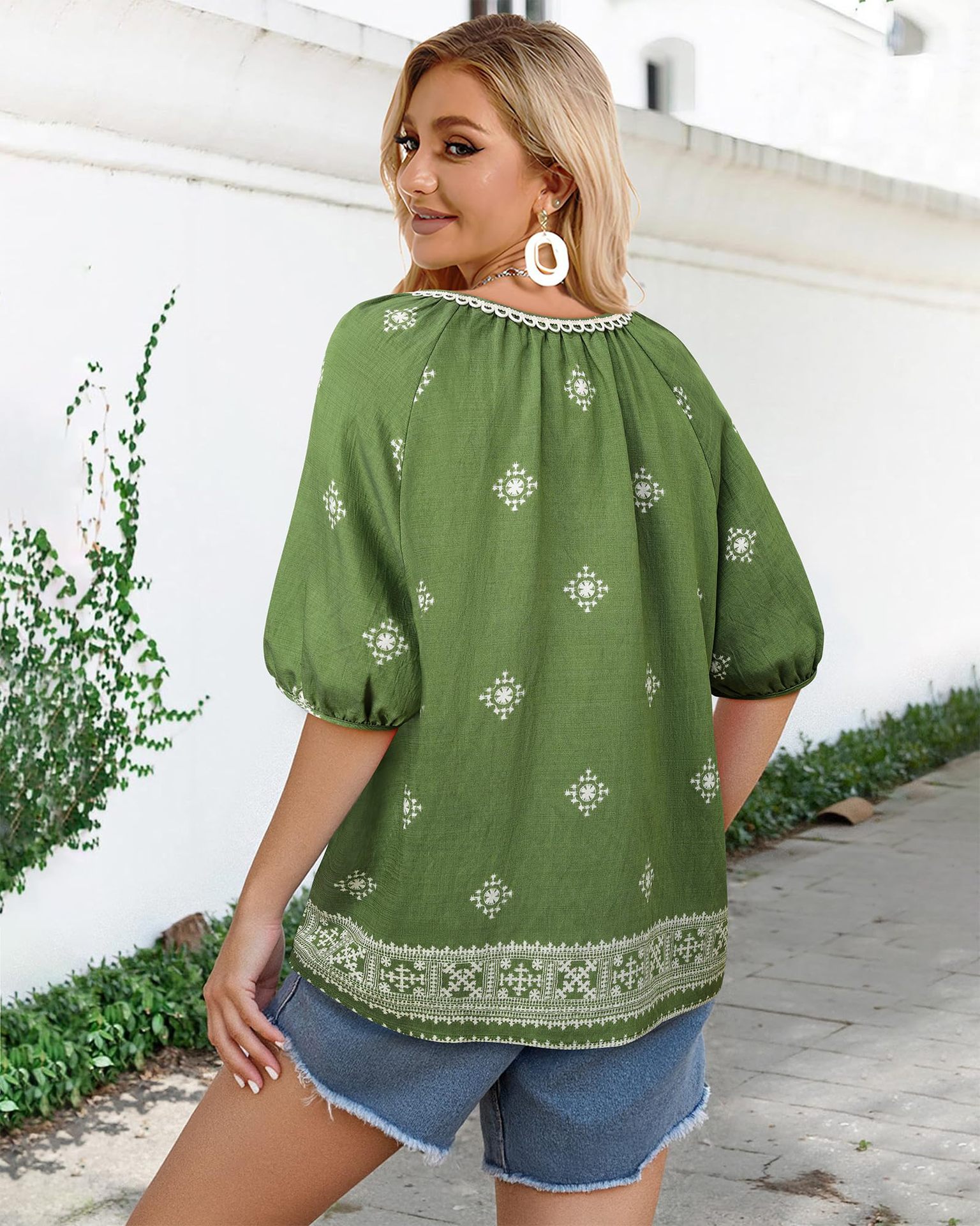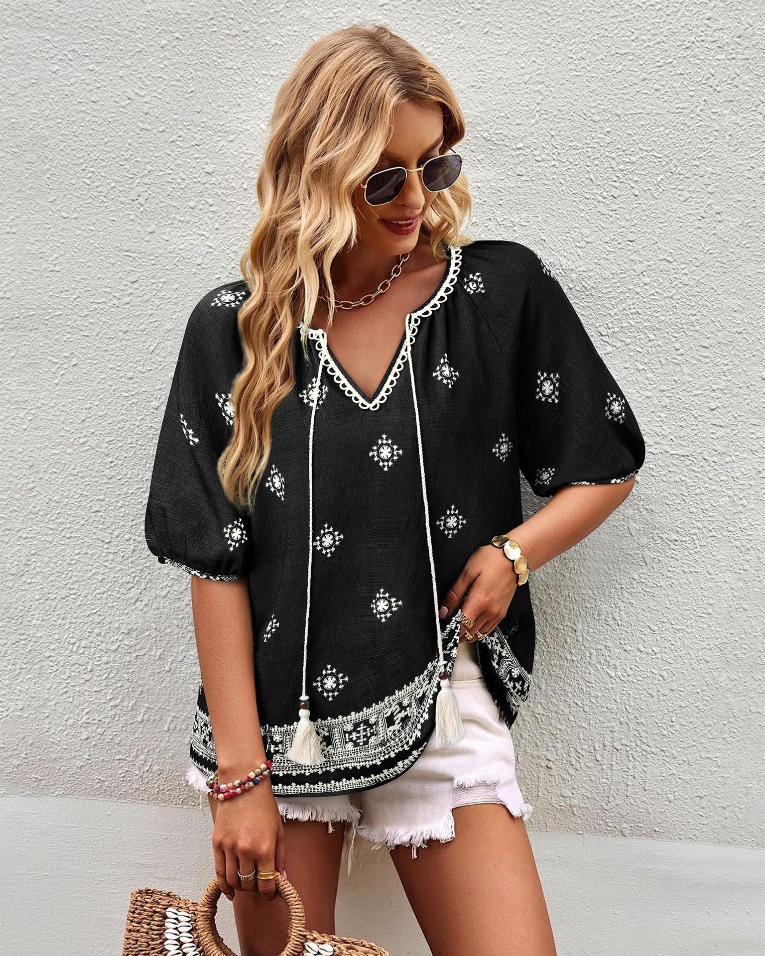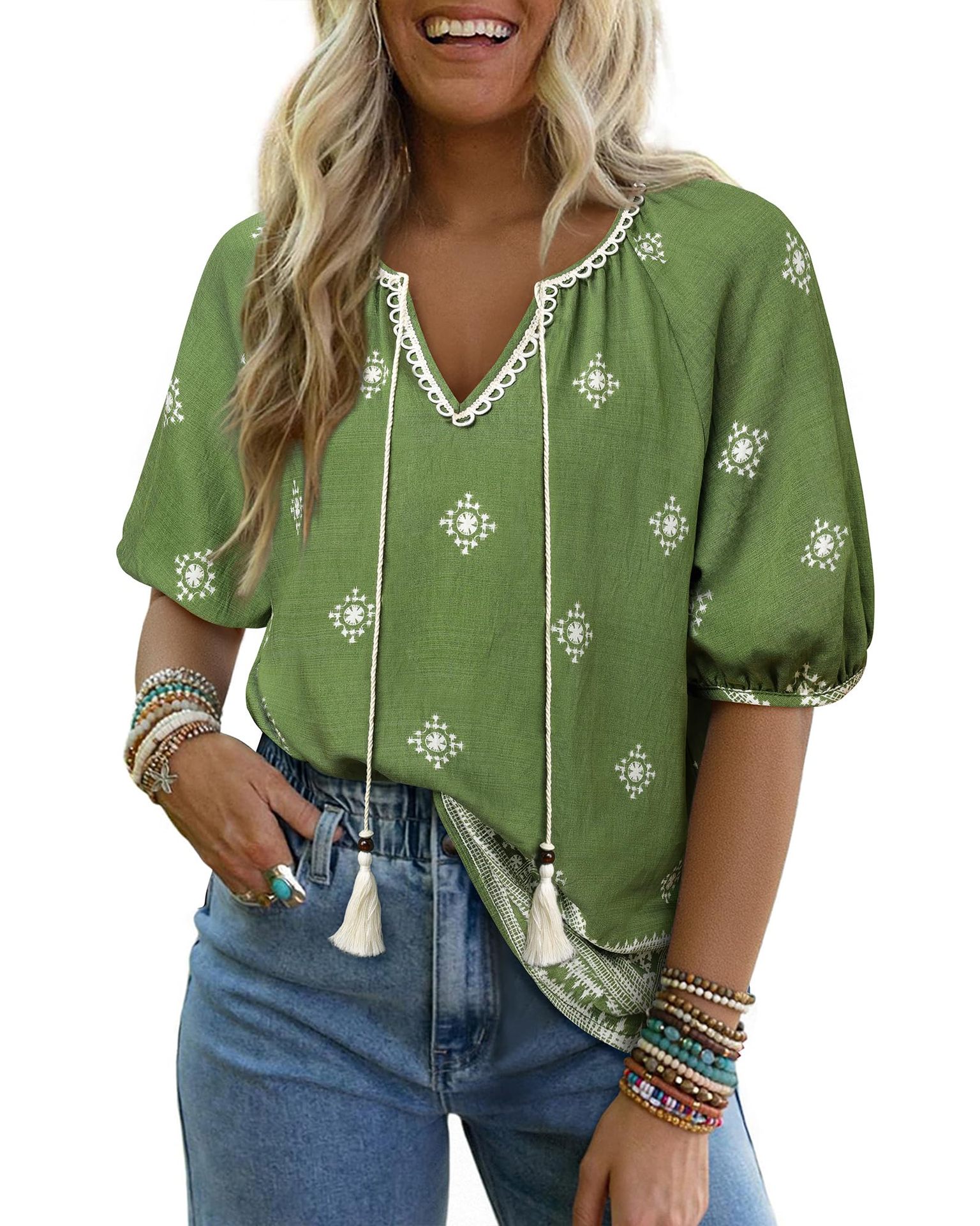 0 Review for Bohemian Casual V-neck Short-sleeve Printed Blouse