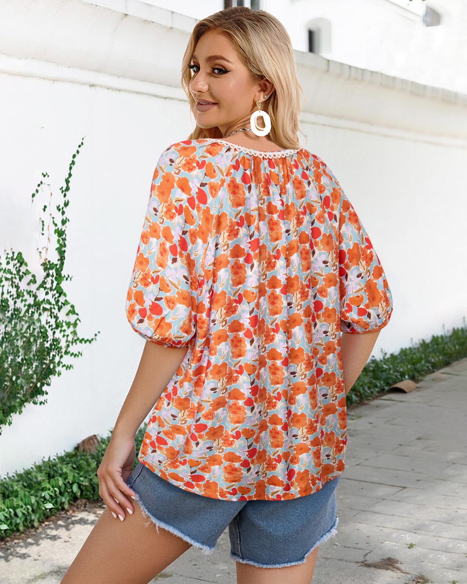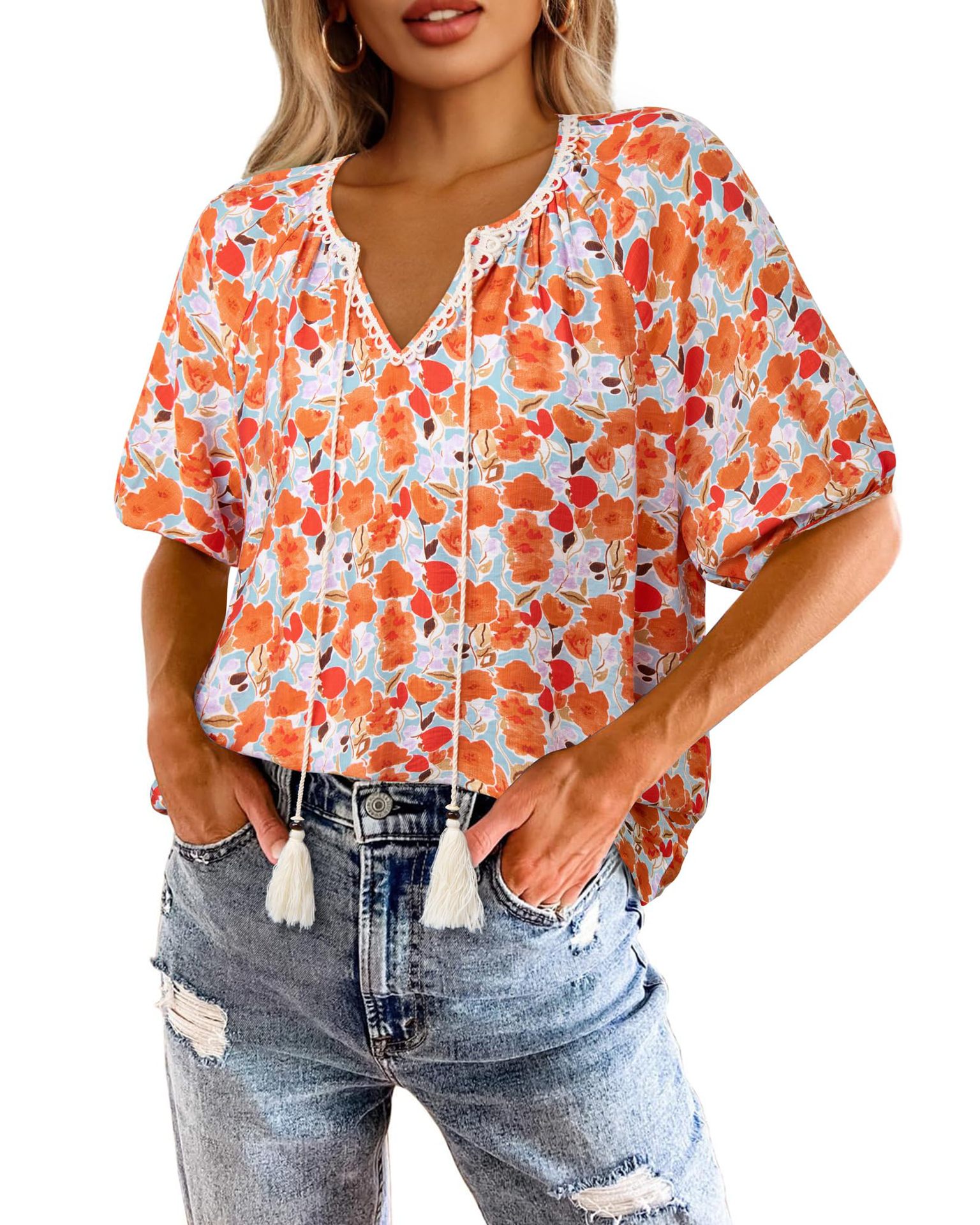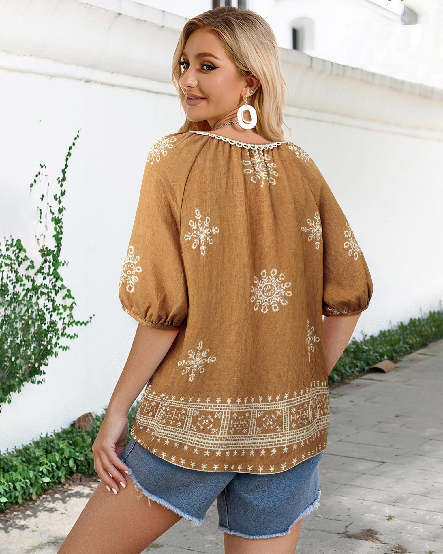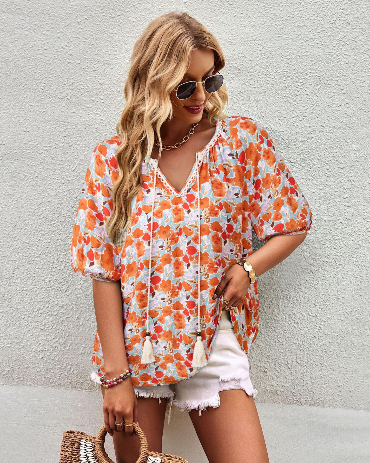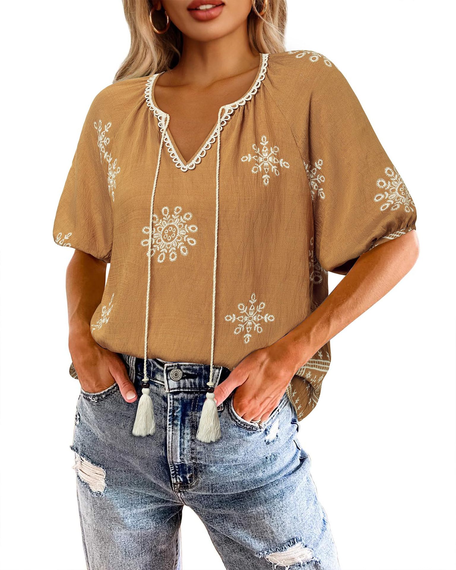 0 Review for Bohemian Casual V-neck Short-sleeve Printed Blouse
