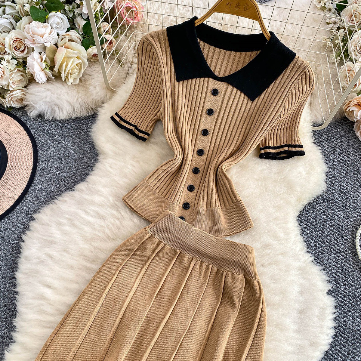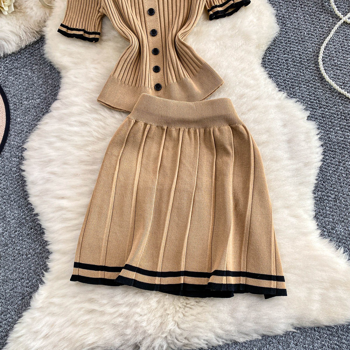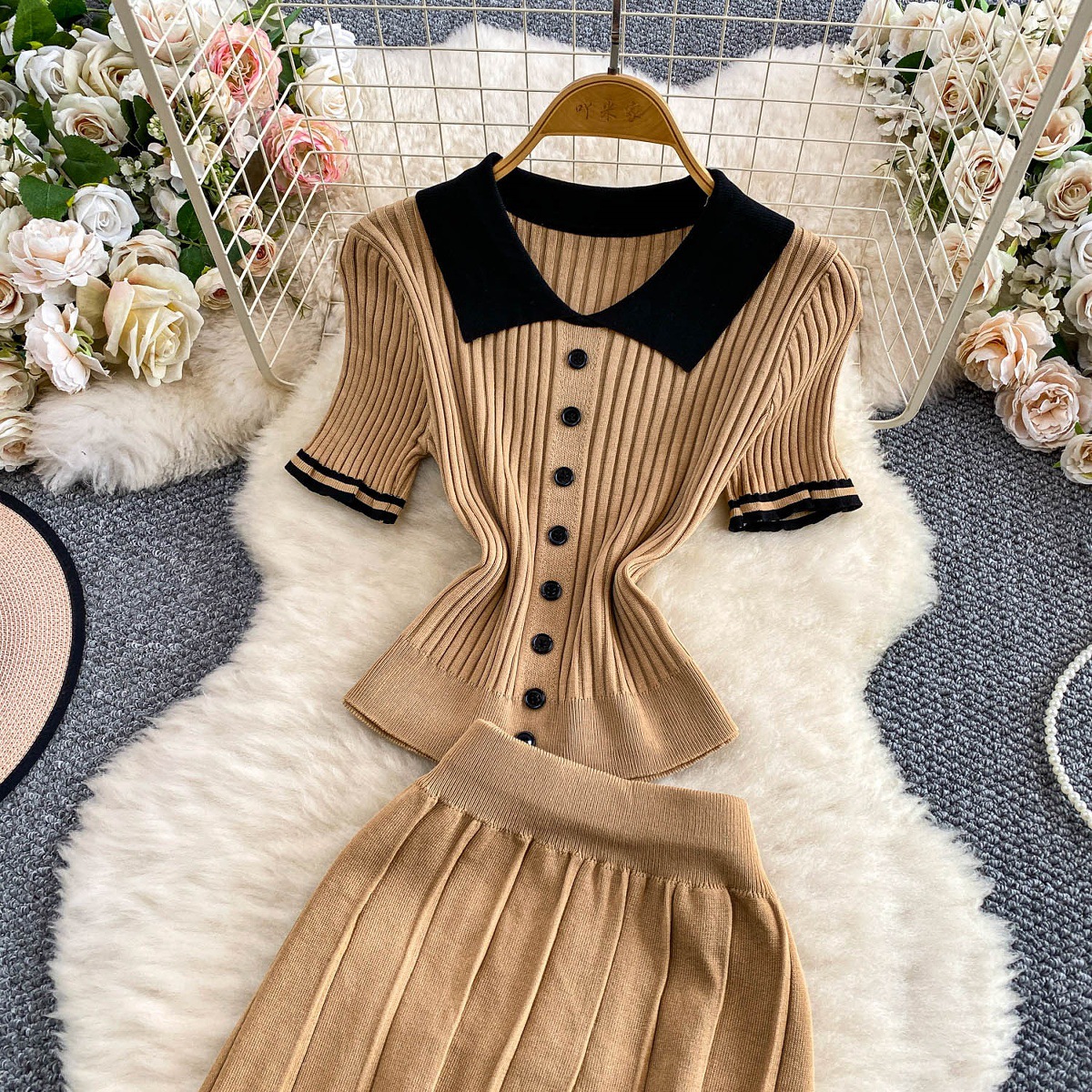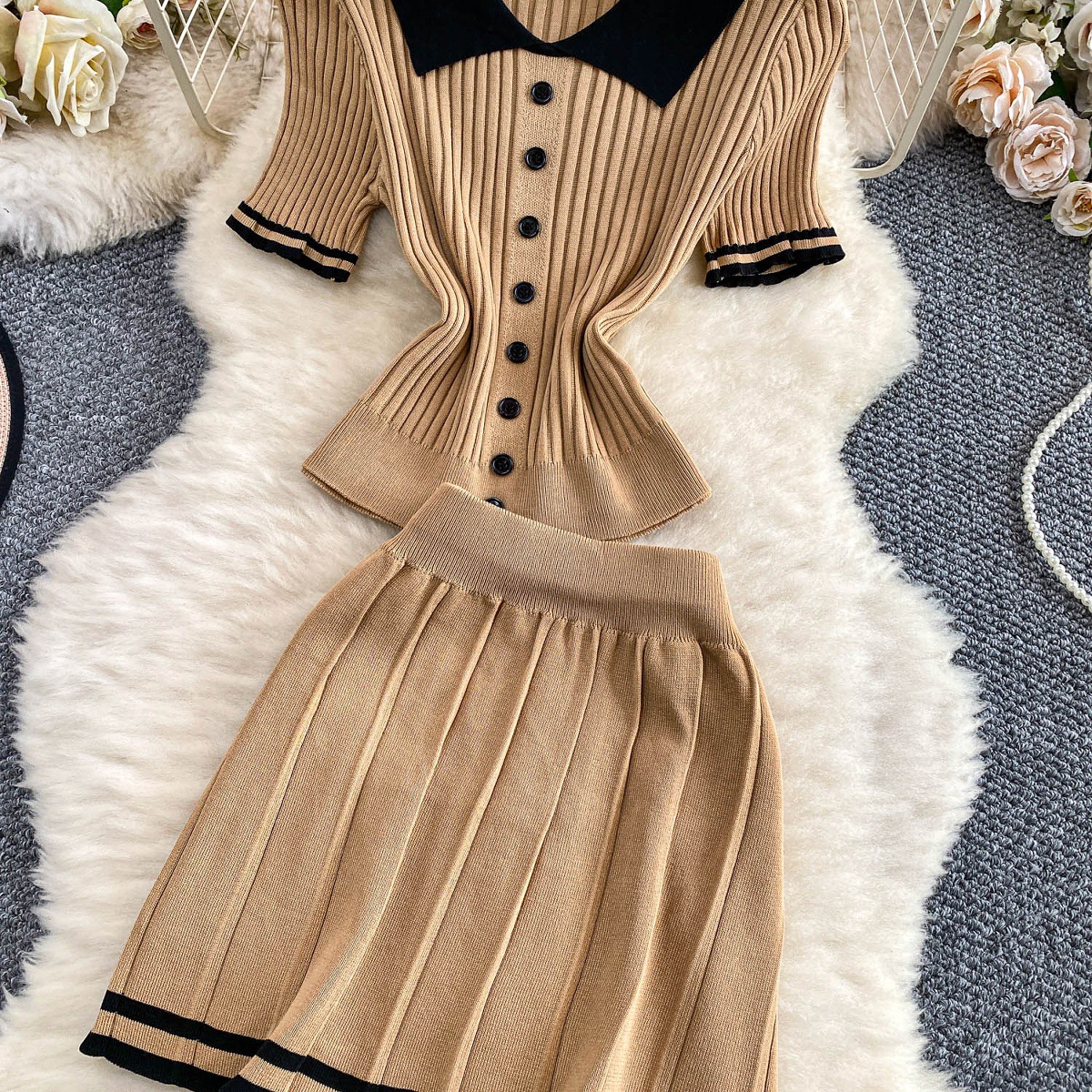 Colors: Light beige two-piece set, light brown two-piece set, black two-piece set, pink two-piece set