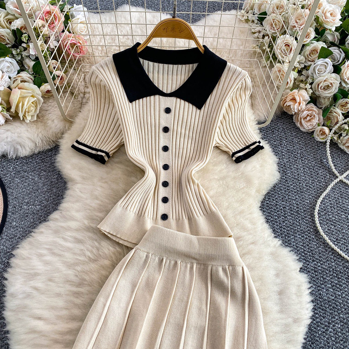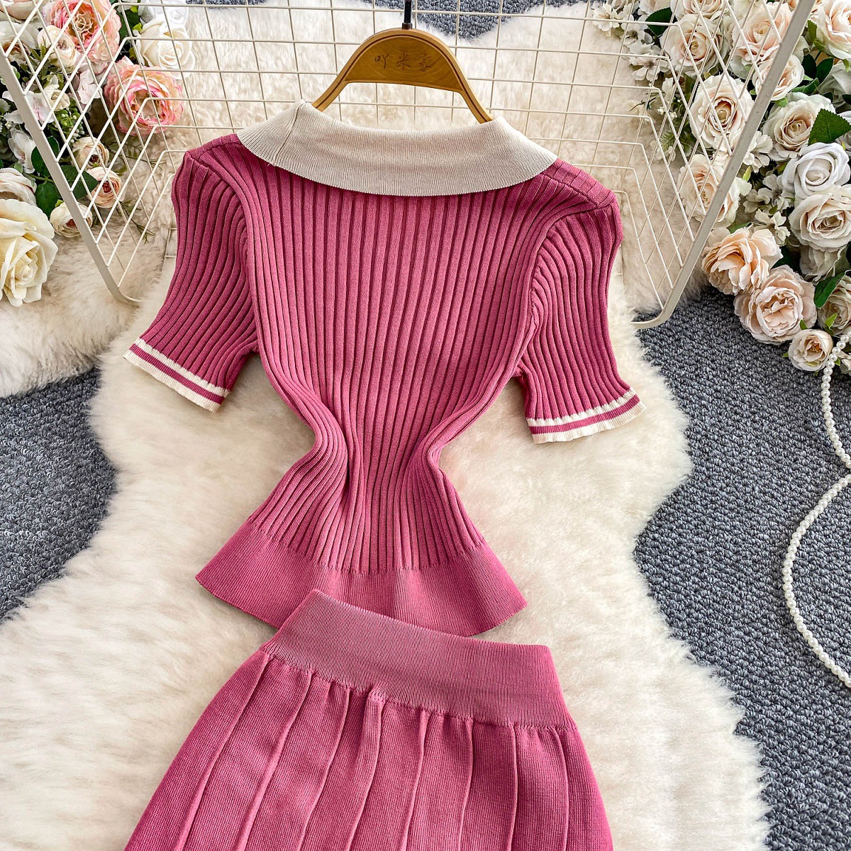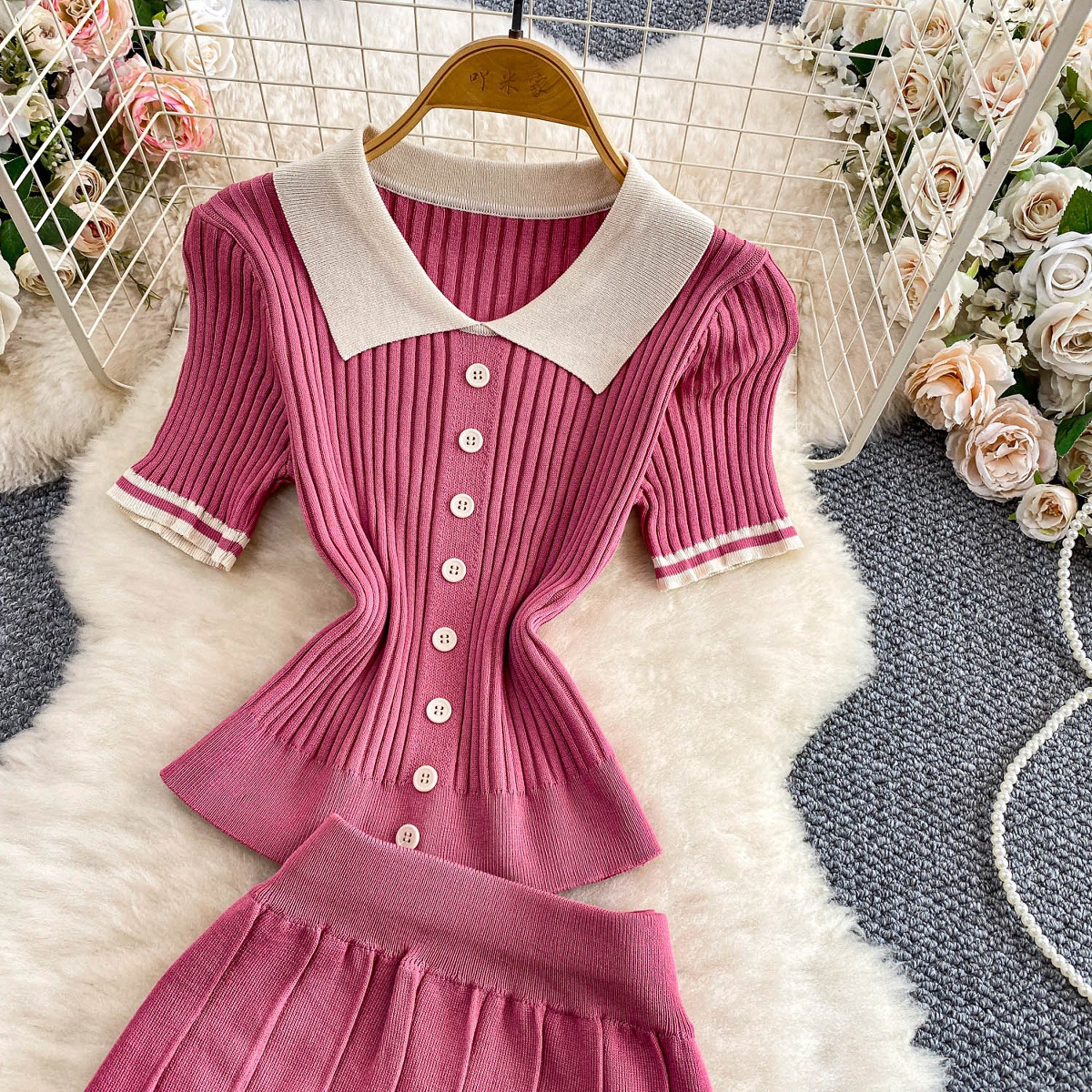 Colors: Light beige two-piece set, light brown two-piece set, black two-piece set, pink two-piece set