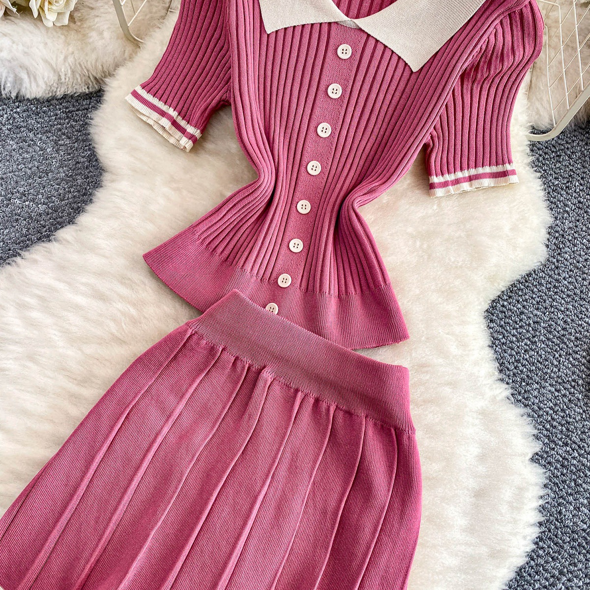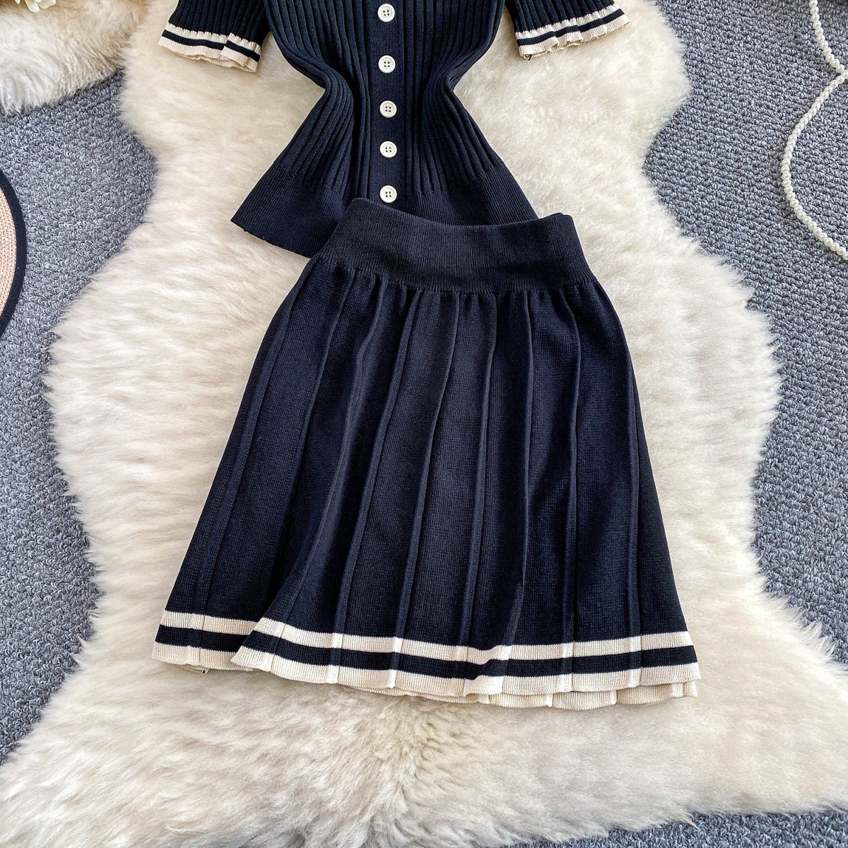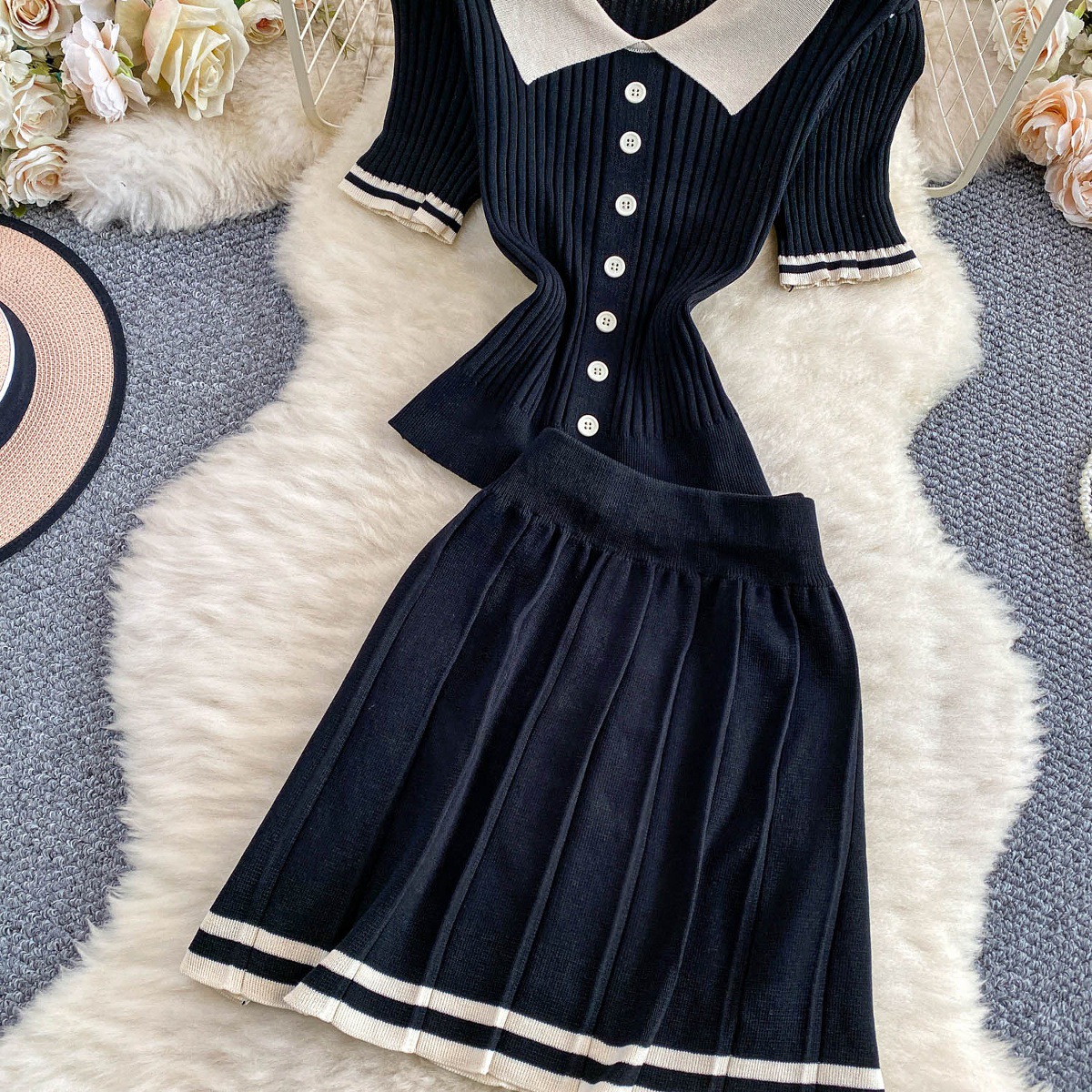 0 Review for Contrast-color Button-front Top With A High-waisted Skirt