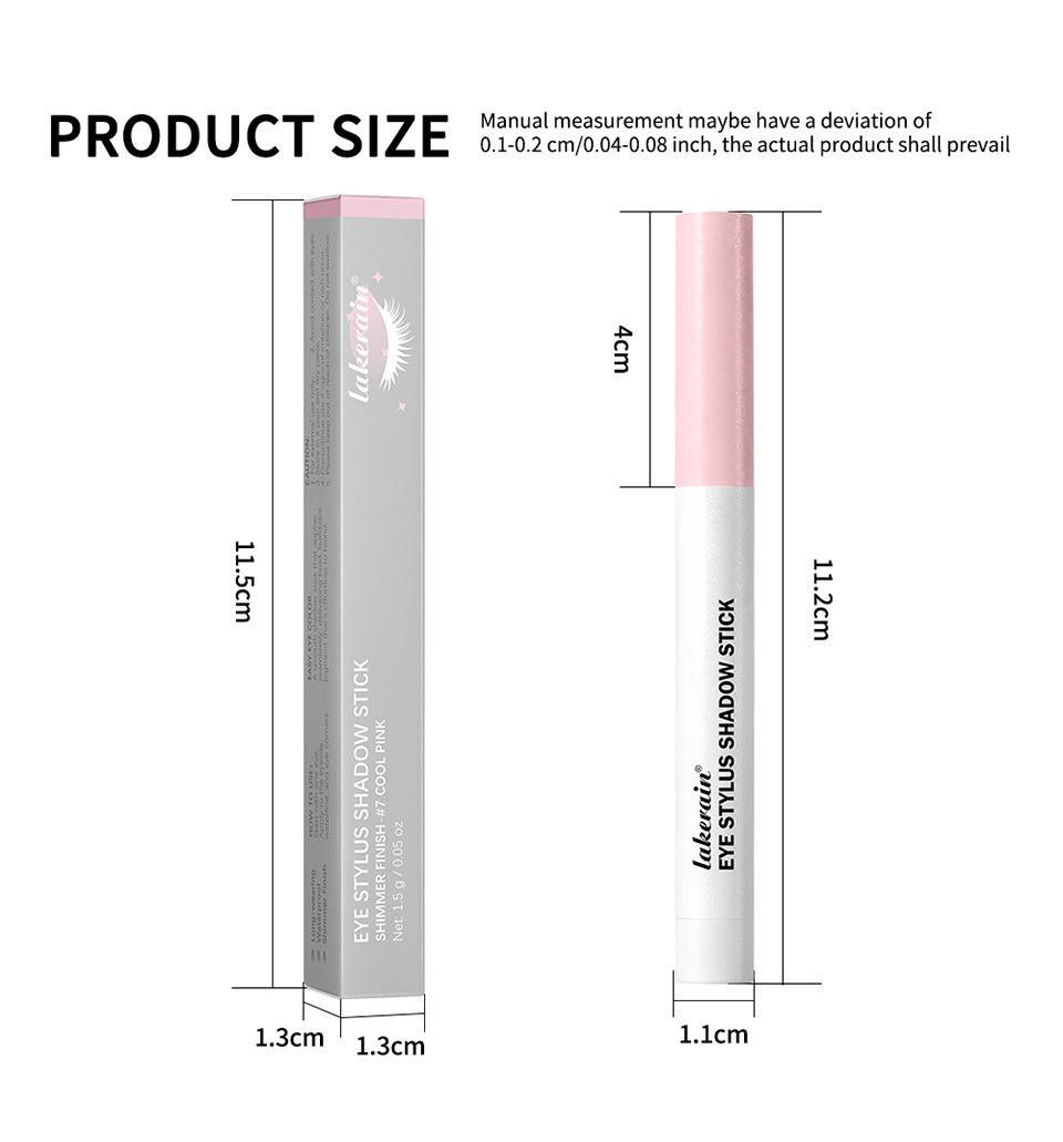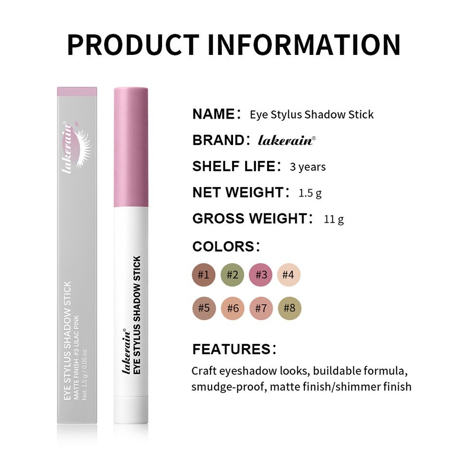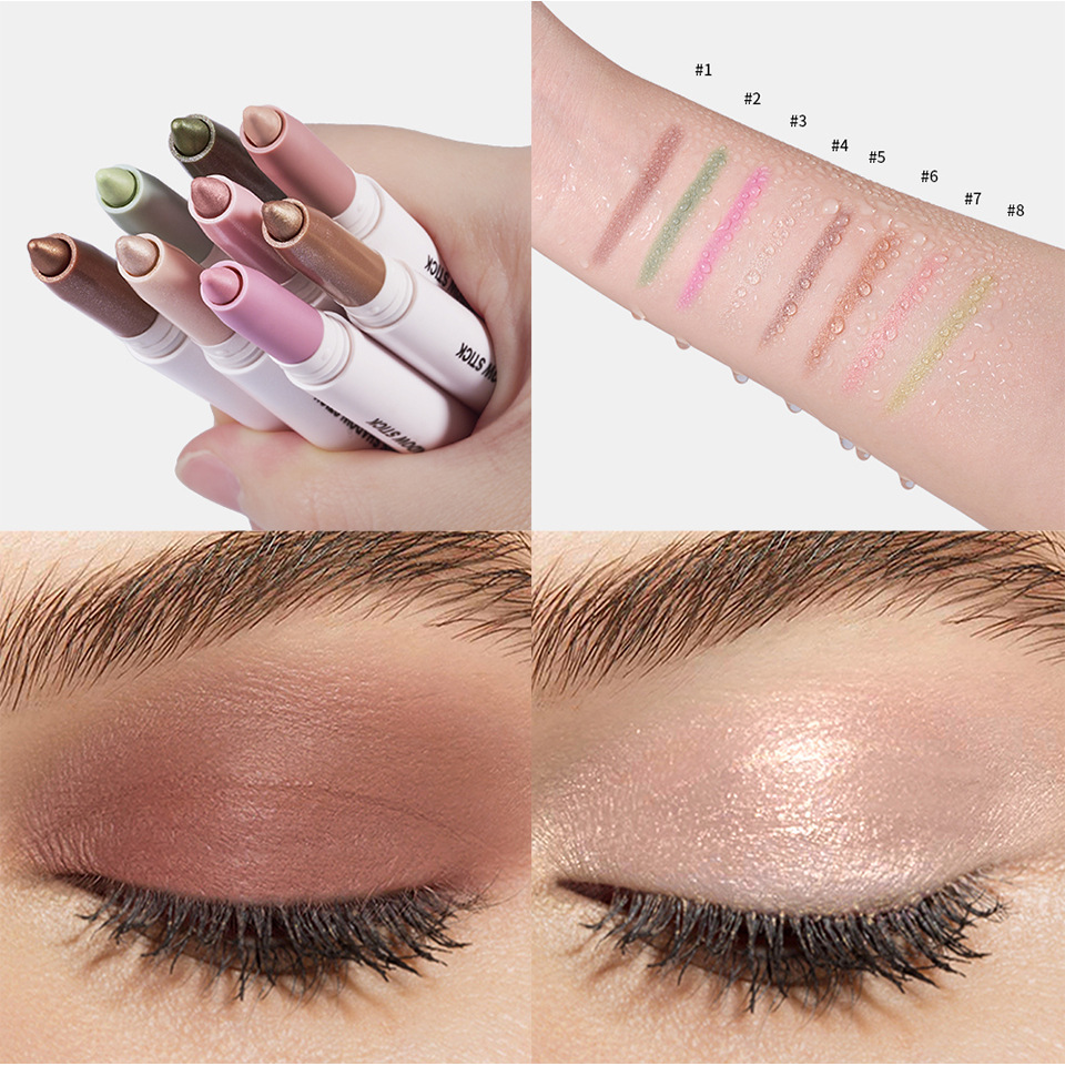 Color Variations: (Matte) Long-Lasting Cream Eyeshadow Pencil #1 Taupe, (Matte) Long-Lasting Cream Eyeshadow Pencil #2 Mint Green, (Matte) Light Lavender-Pink Long-Lasting Eyeshadow Pencil No. 3, (Shimmer) Soft Pearl Long-Lasting Eyeshadow Pencil No. 4, (Shimmer) Long-Lasting Cream Eyeshadow Pencil #5 Plum Bronze, (Shimmer) Long-Lasting Cream Eyeshadow Pencil #6 Neutral, (Shimmer) Long-Lasting Cream Eyeshadow Pencil #7 Cool Pink, (Shimmer) Long-Lasting Cream Eyeshadow Pencil #8 Golden Olive