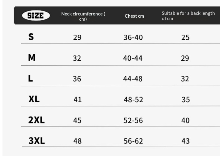 Size: s [suggested weight 3 ~ 5kg] m [suggested weight 6 ~ 8kg] l [suggested weight 9 ~ 11kg] XL [suggested weight 12 ~ 16kg] 2XL [suggested weight 16 ~ 20kg] 3XL [suggested weight 21 ~ 26kg]