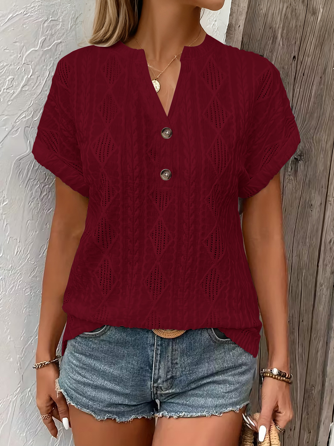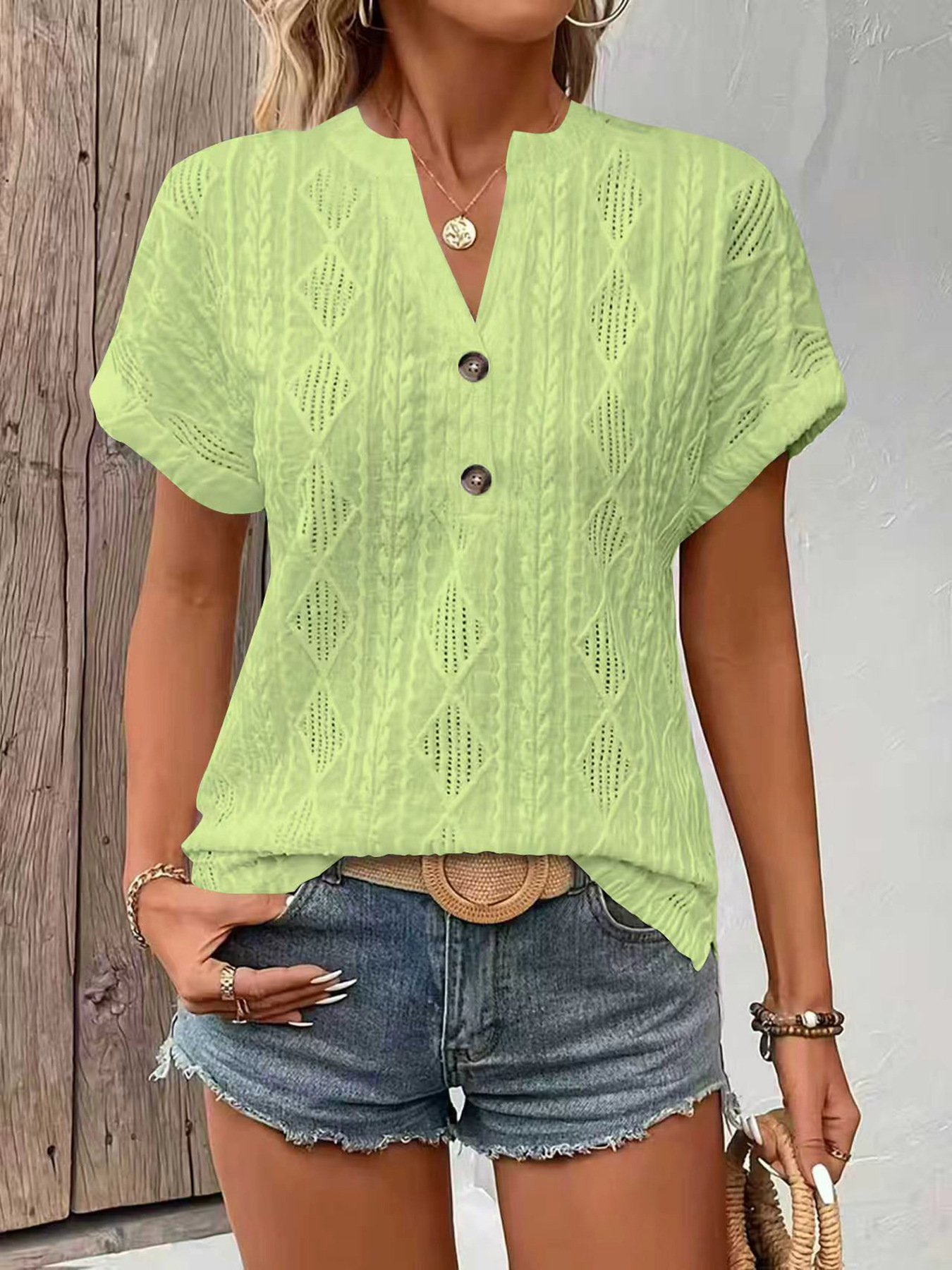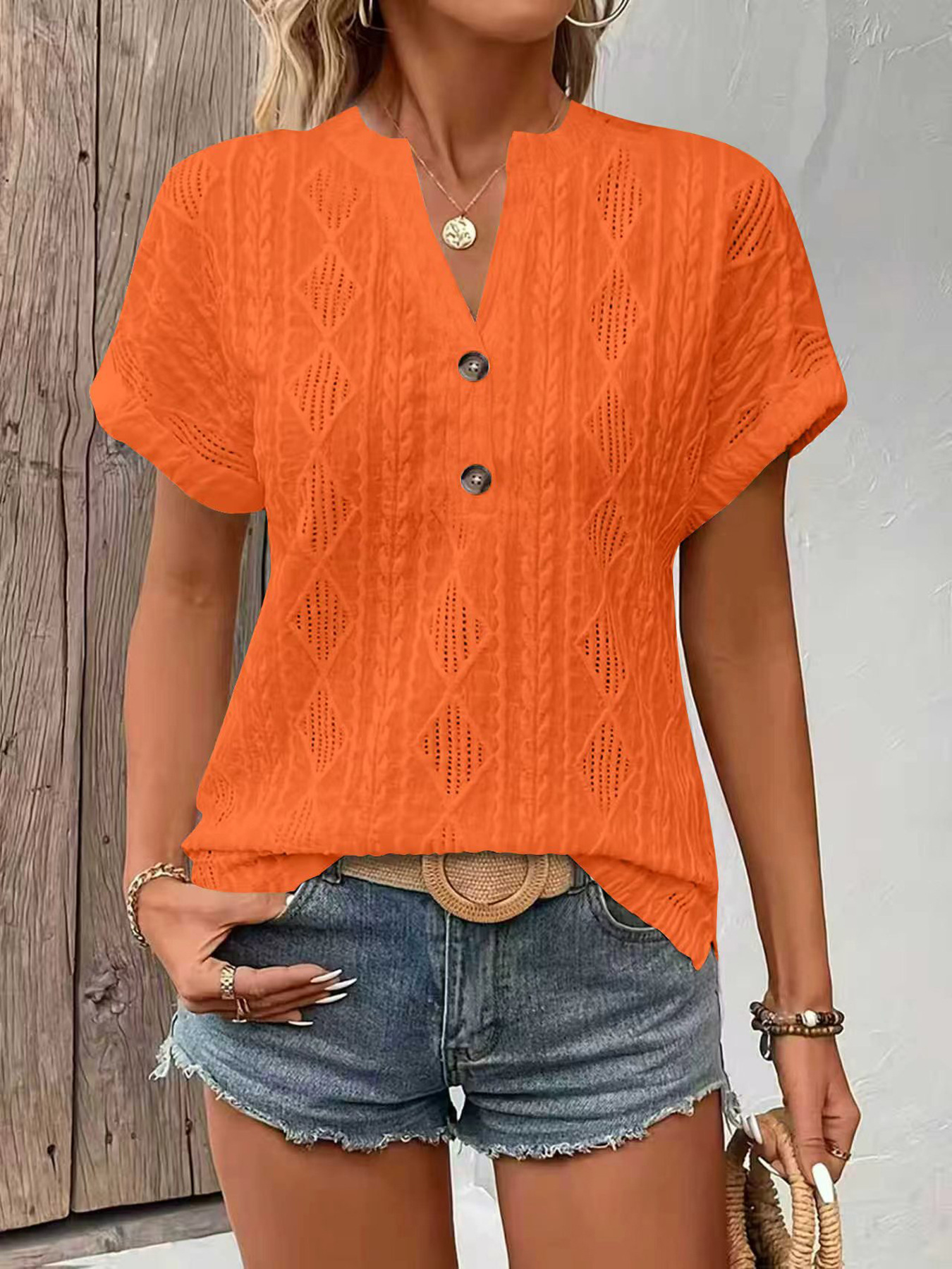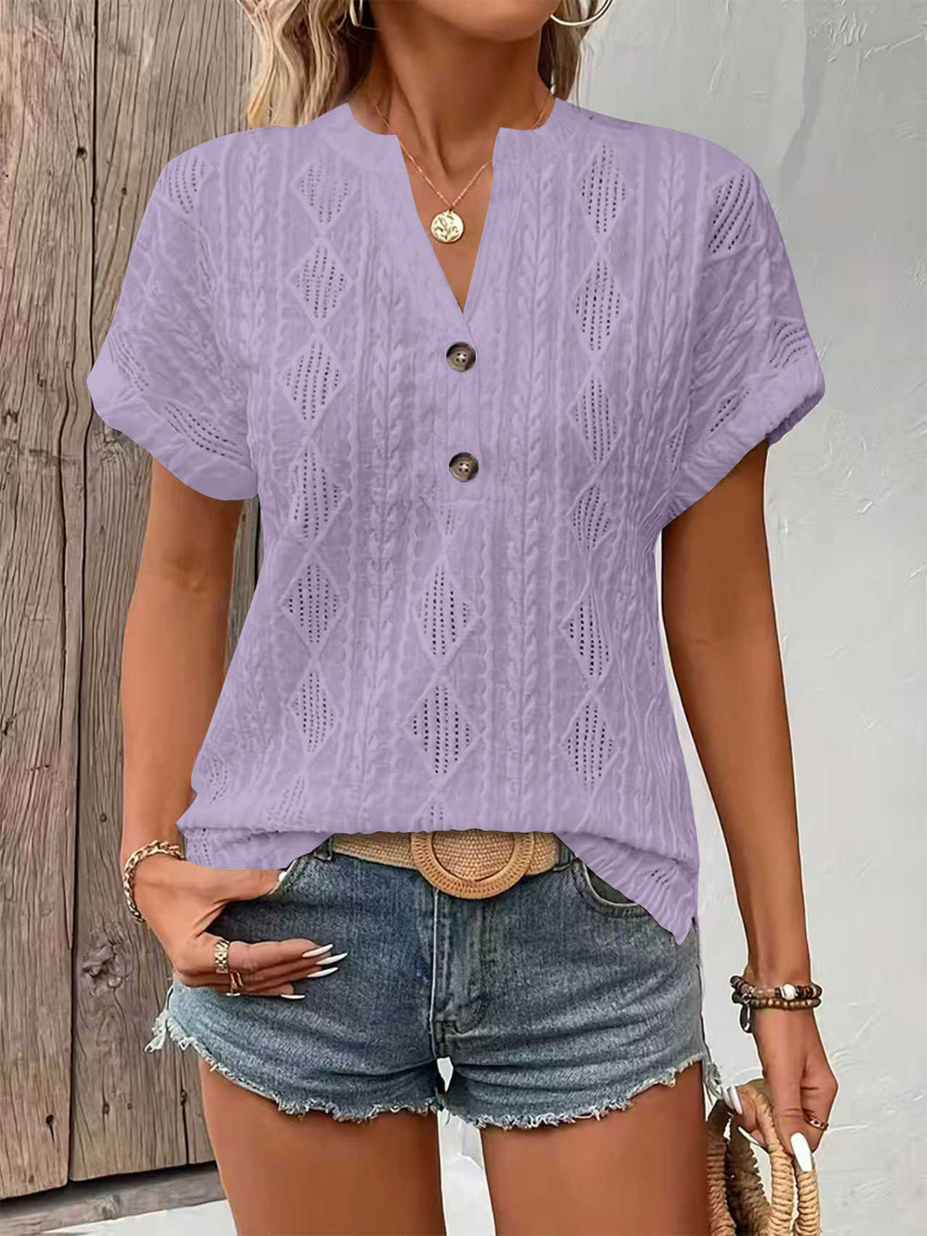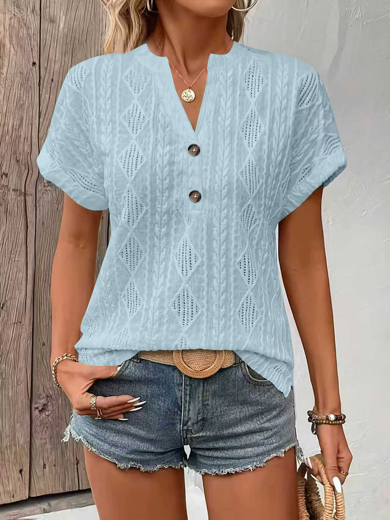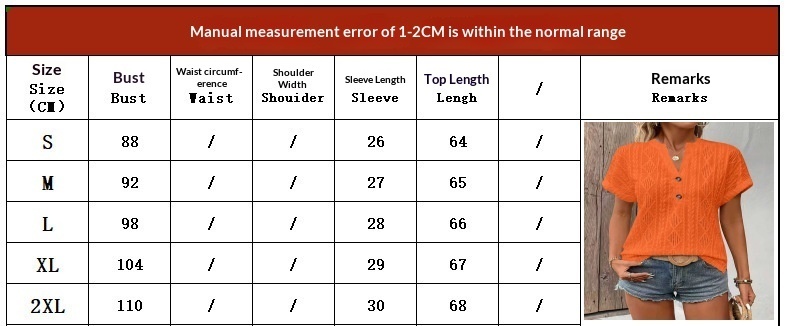 0 Review for Fashionable Casual Solid-Color Buttoned V-Neck T-Shirt For Women