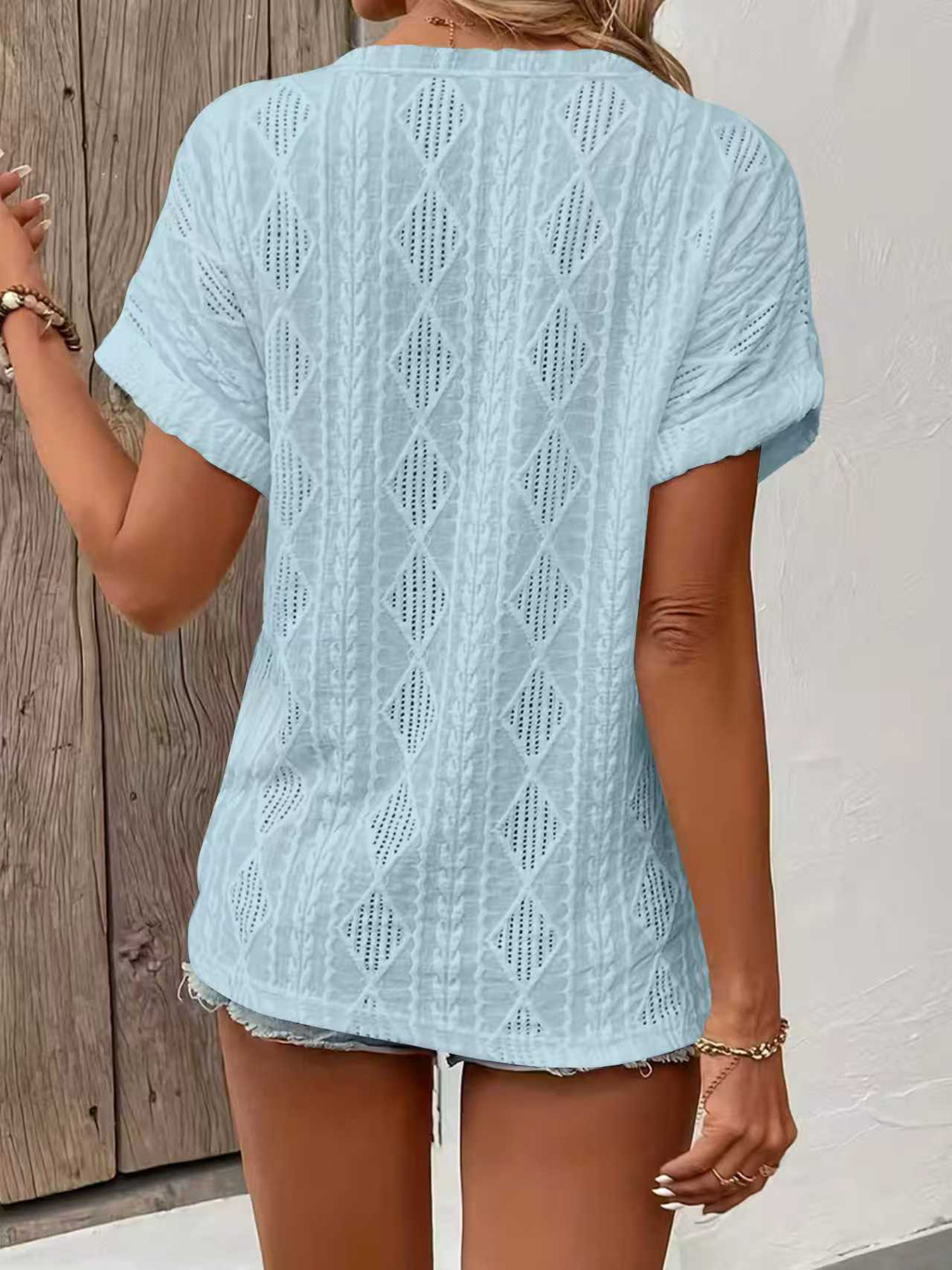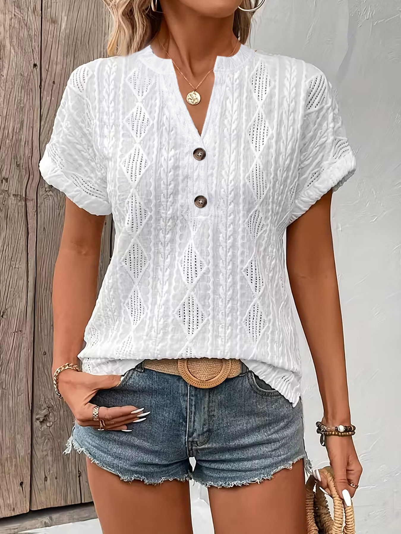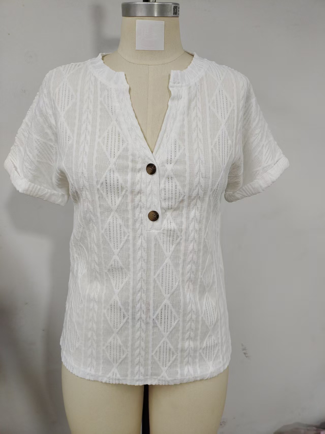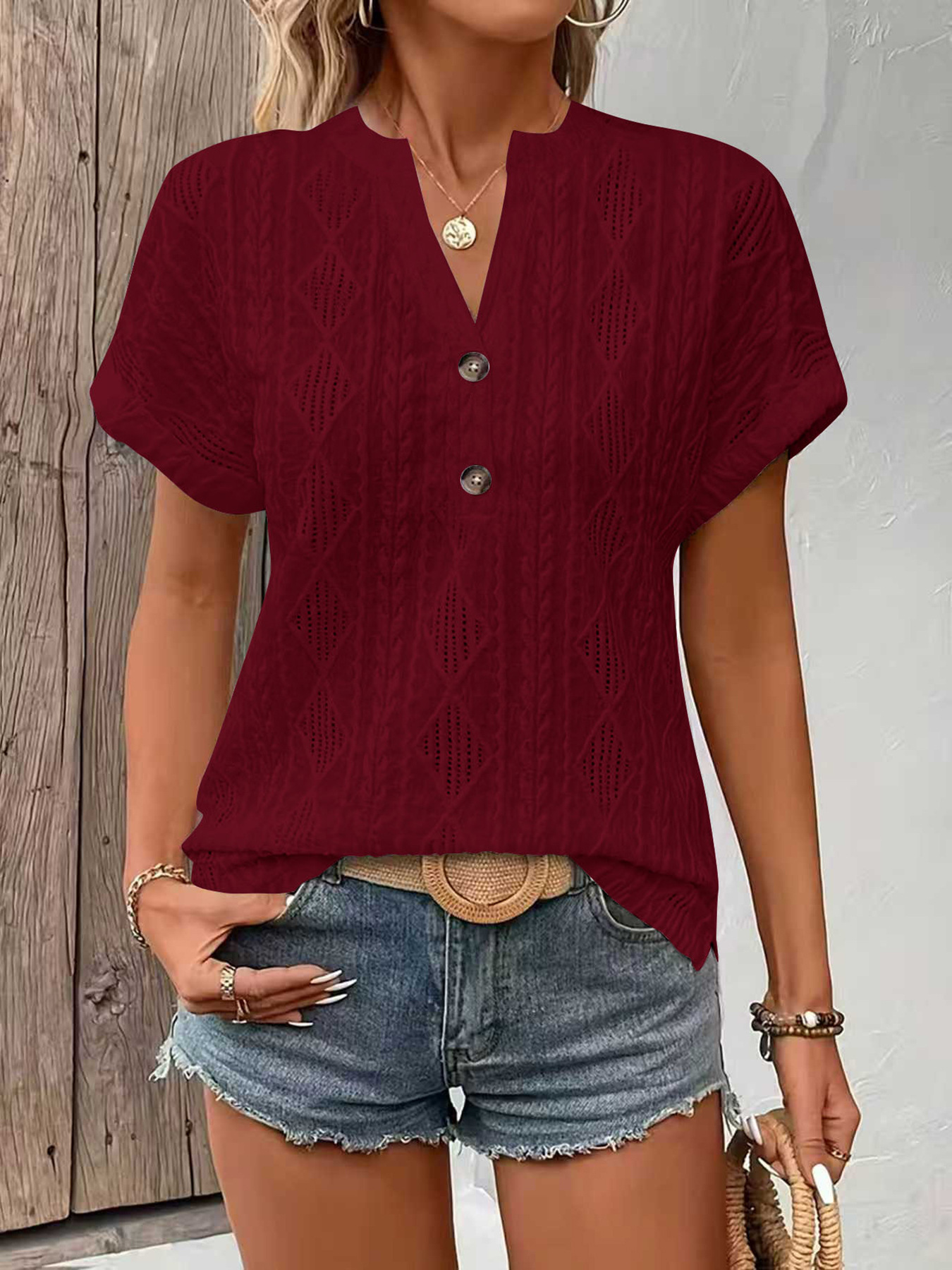 0 Review for Fashionable Casual Solid-Color Buttoned V-Neck T-Shirt For Women