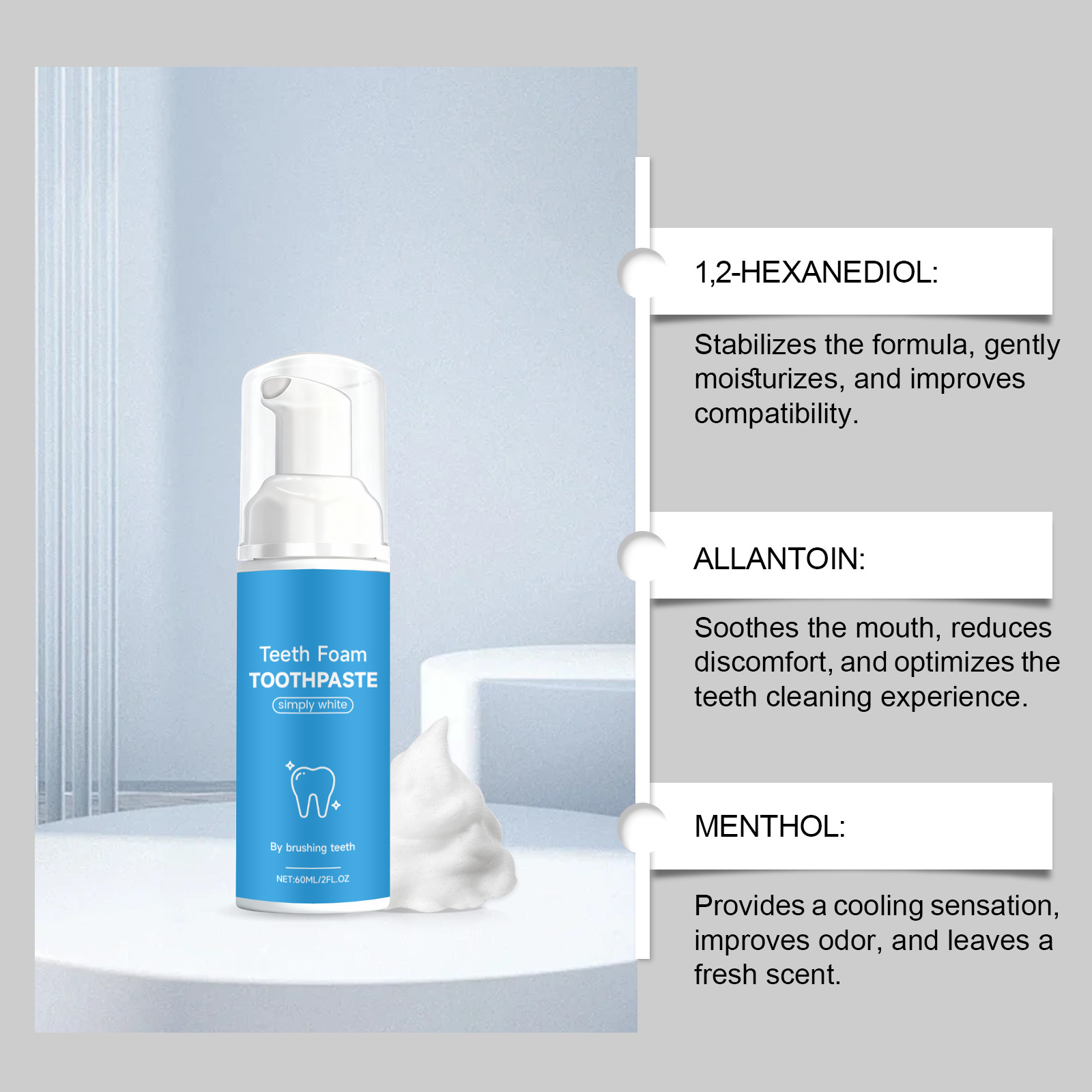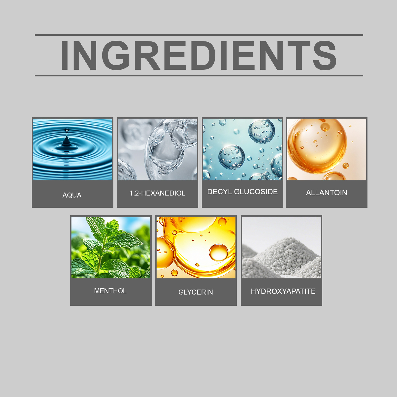 Ingredients: water, hydroxyapatite, glycerin, decyl glucoside, 1,2- hexanediol, allantoin, menthol.