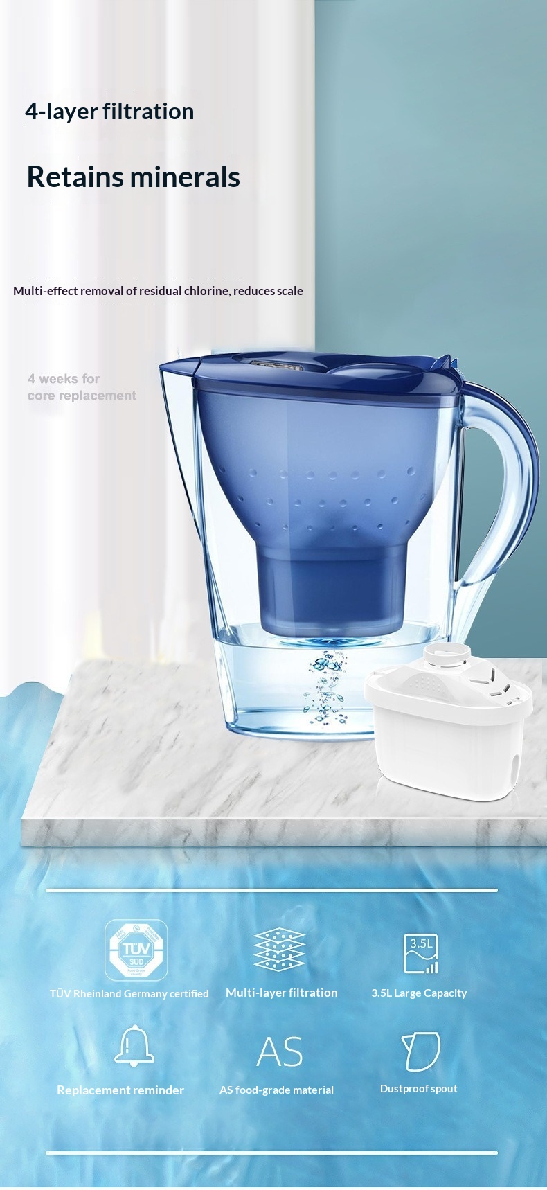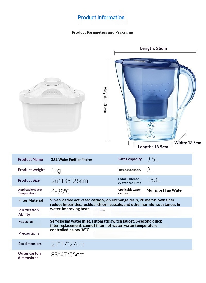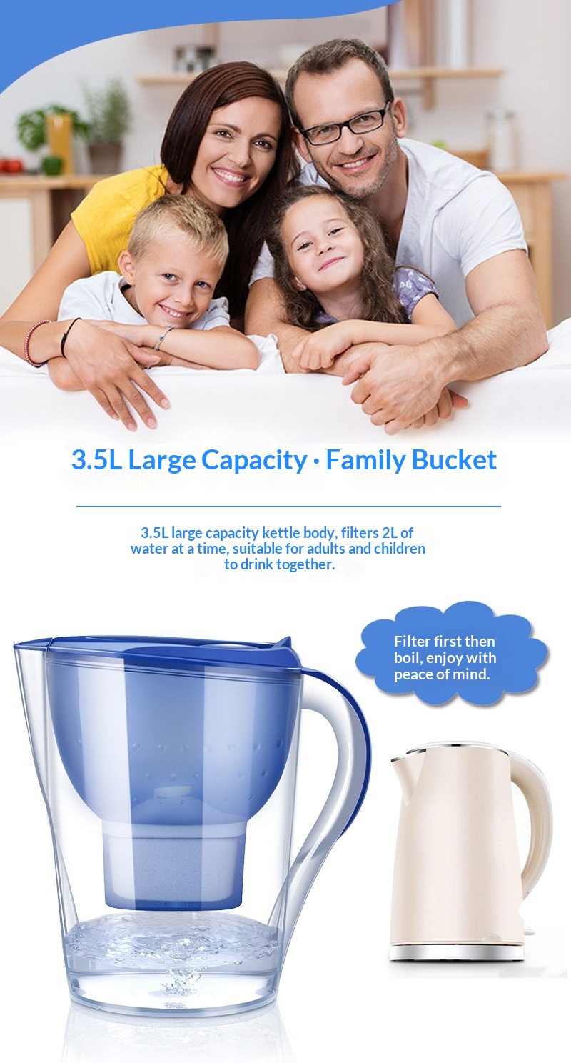 Colors: 3.5L blue pitcher with 1 filter core