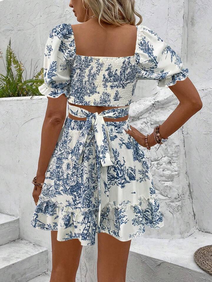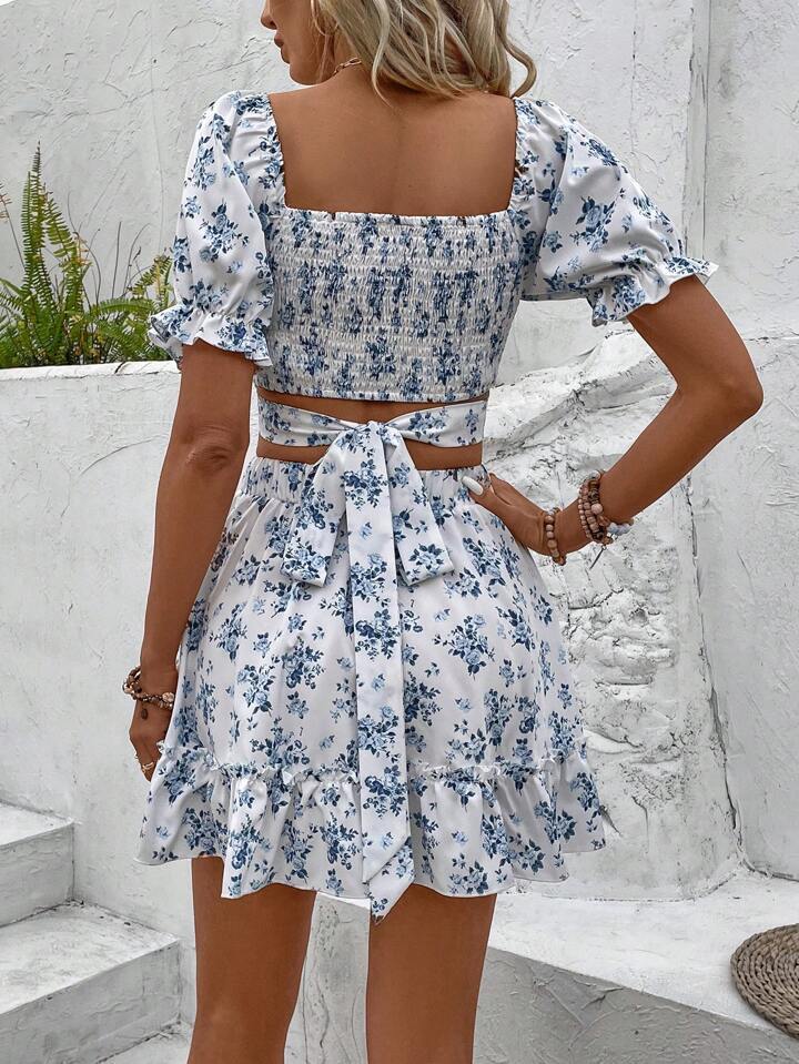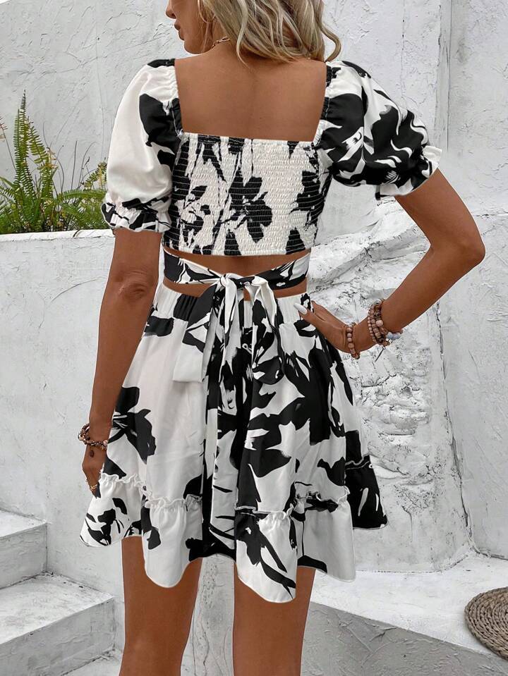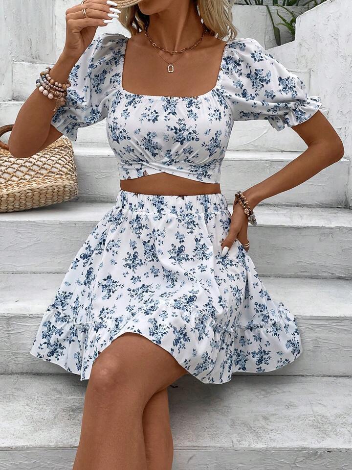 0 Review for French-style Floral Print Dress Vacation-style Set Short Skirt
