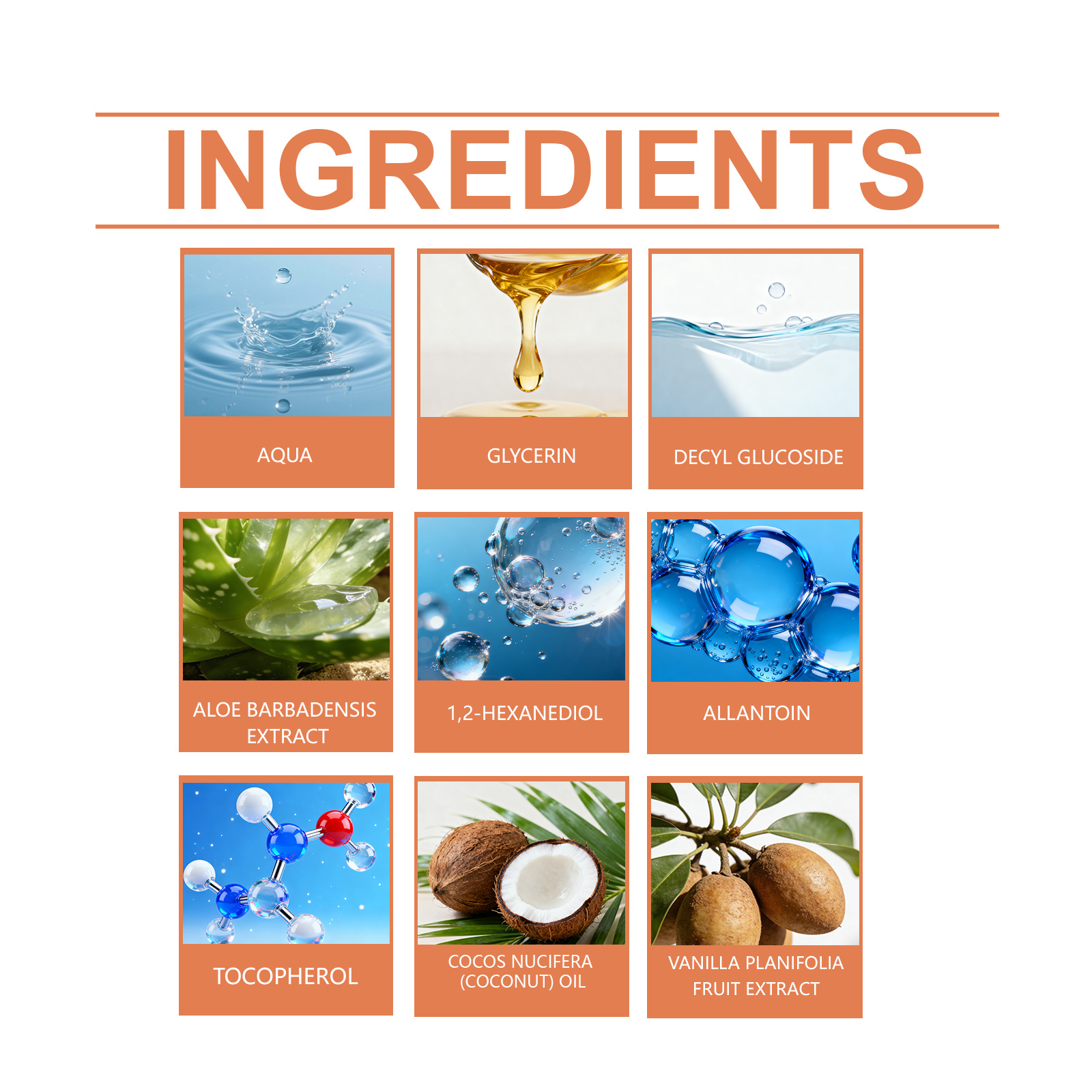 Product ingredients: Water, decyl glucoside, glycerin, 1,2-hexanediol, aloe vera extract from Calafate, allantoin, arginine, coconut oil, fruit extract from Pachira aquatica.