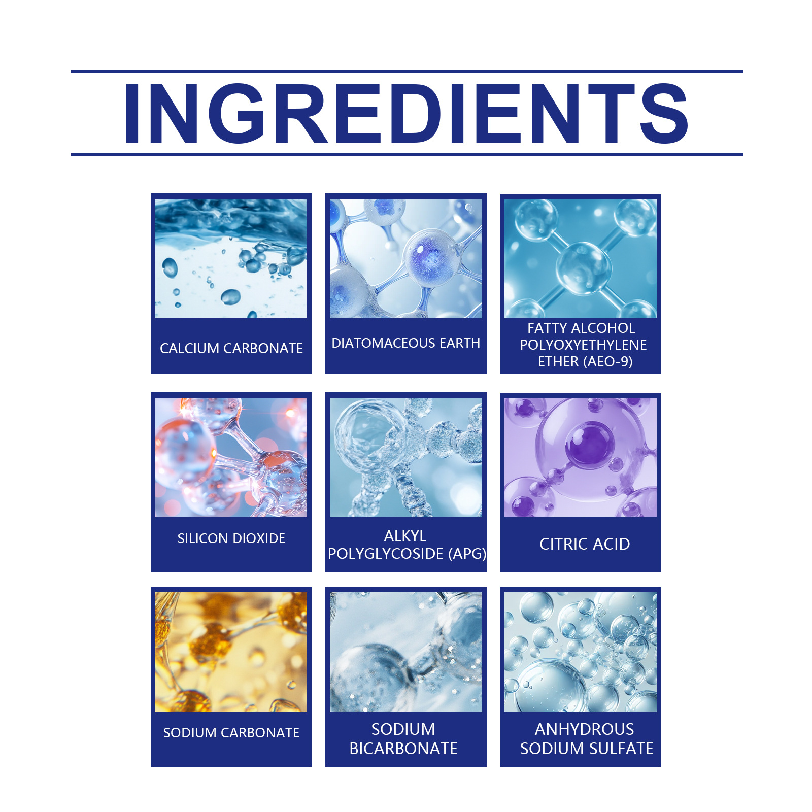 Ingredients: calcium carbonate, diatomite, fatty alcohol polyoxyethylene ether (AEO-9), silicon dioxide, alkyl glycoside (APG), citric acid, sodium carbonate, sodium bicarbonate and anhydrous sodium sulfate.