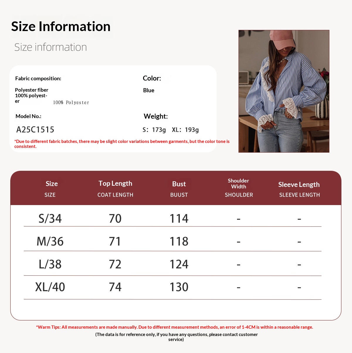Korean-style Elegant, Effortless Striped Lace-Patchwork Womens Shirt