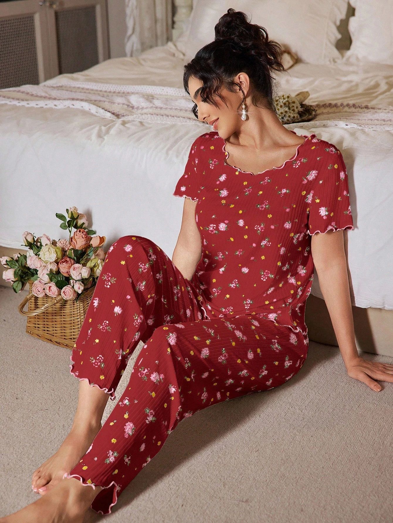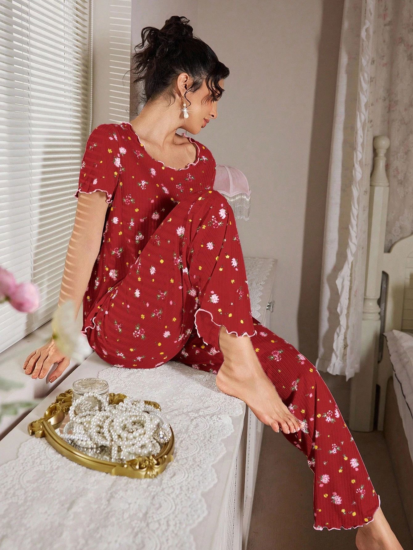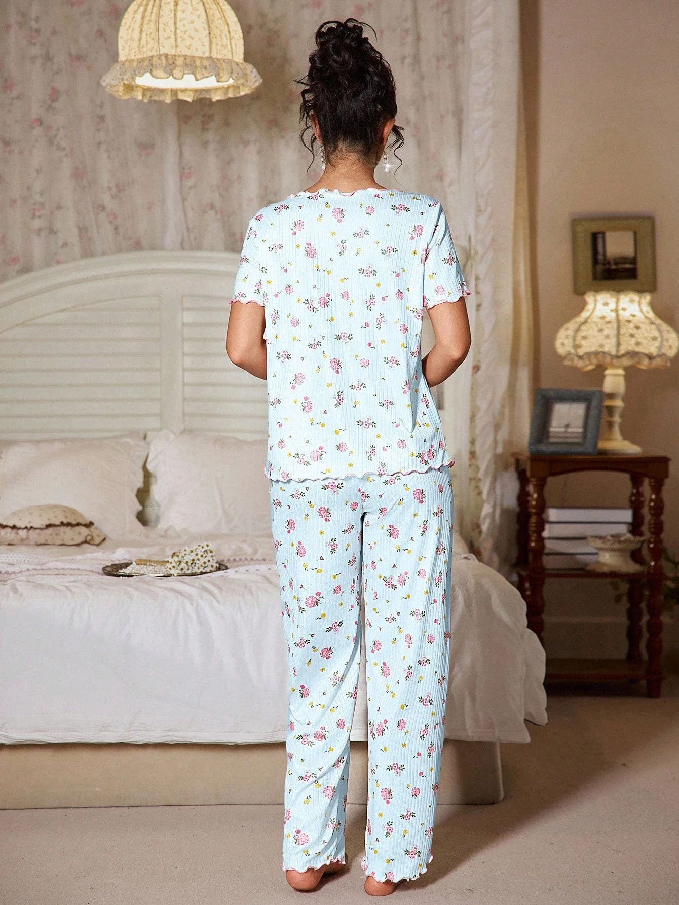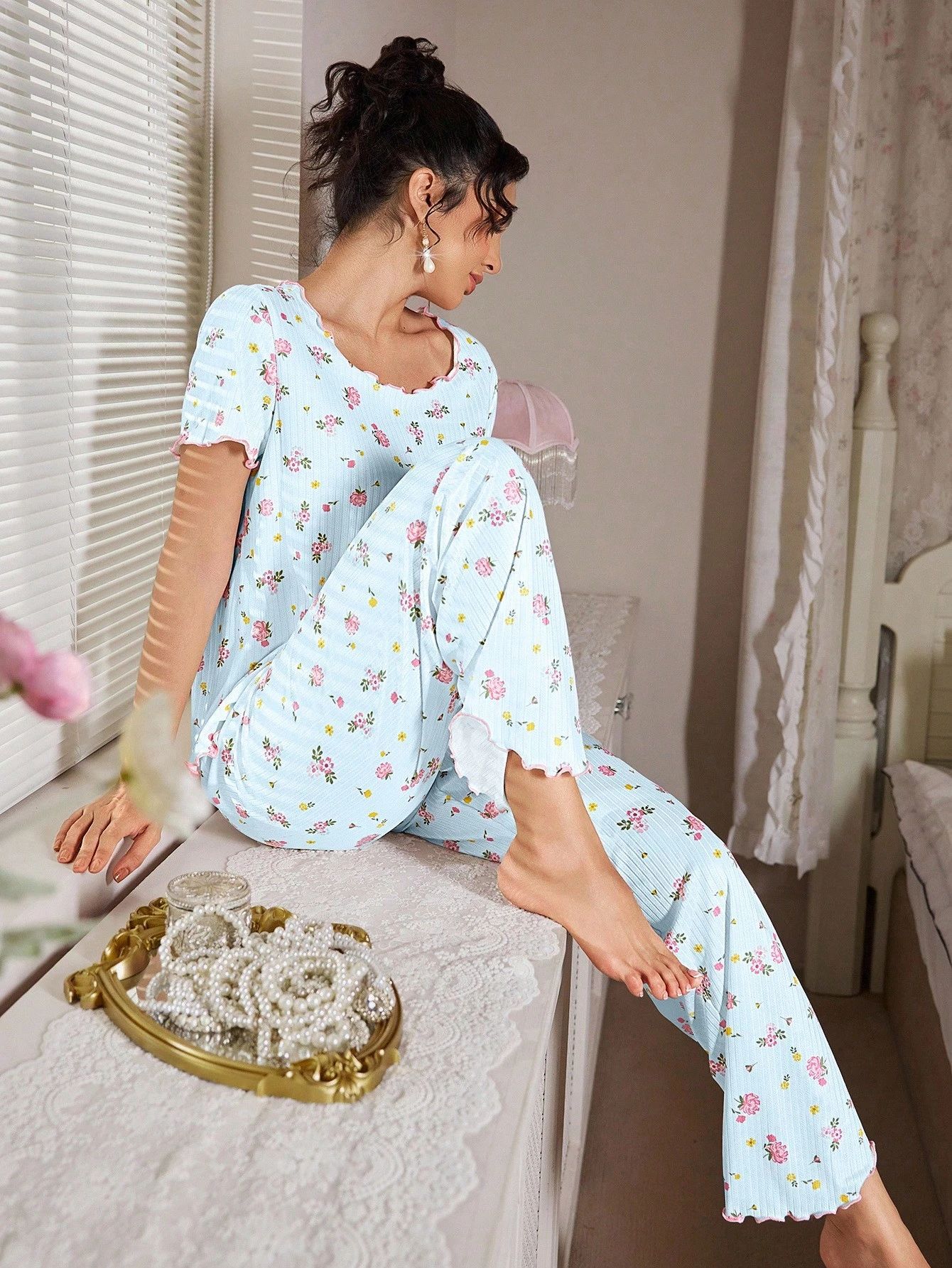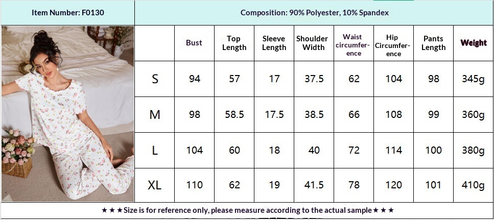 0 Review for Loose Womens Pajamas Floral Short-Sleeve Pants Two-Piece Set