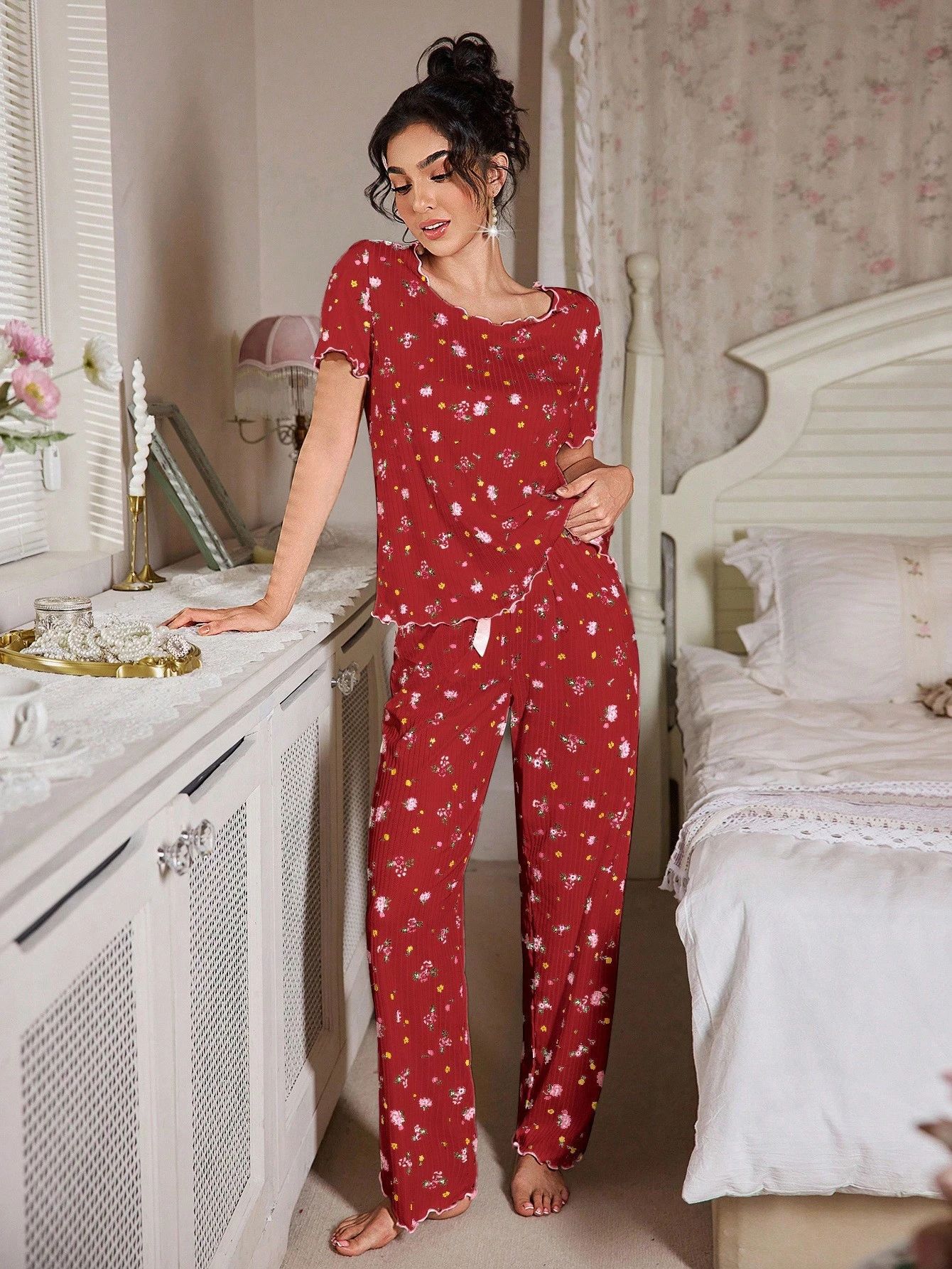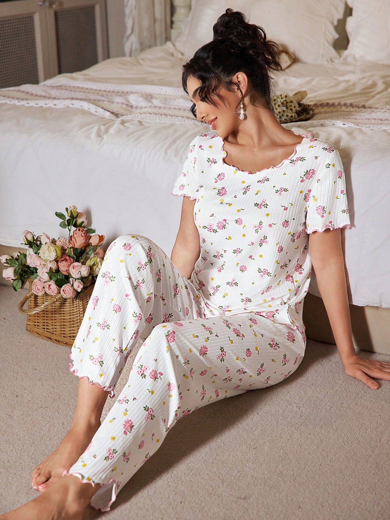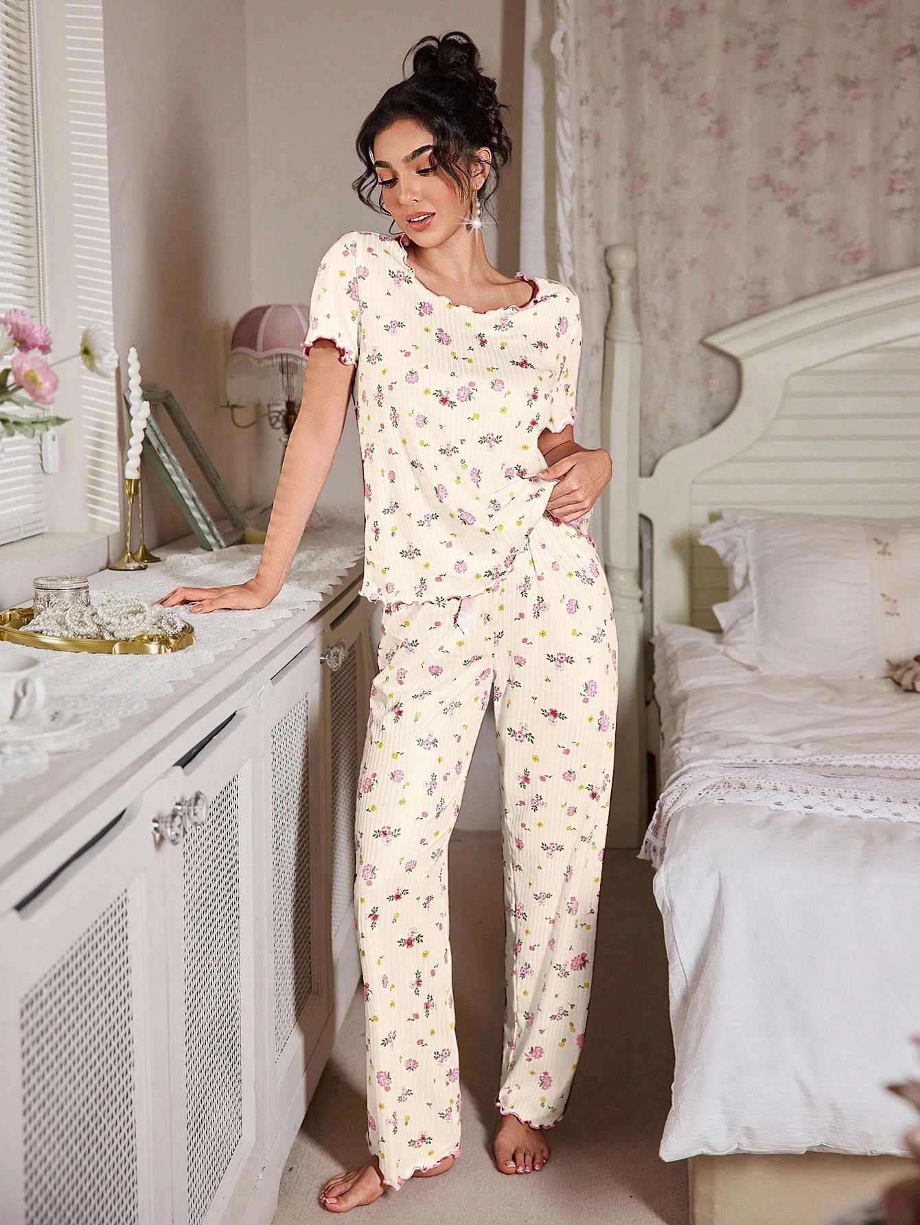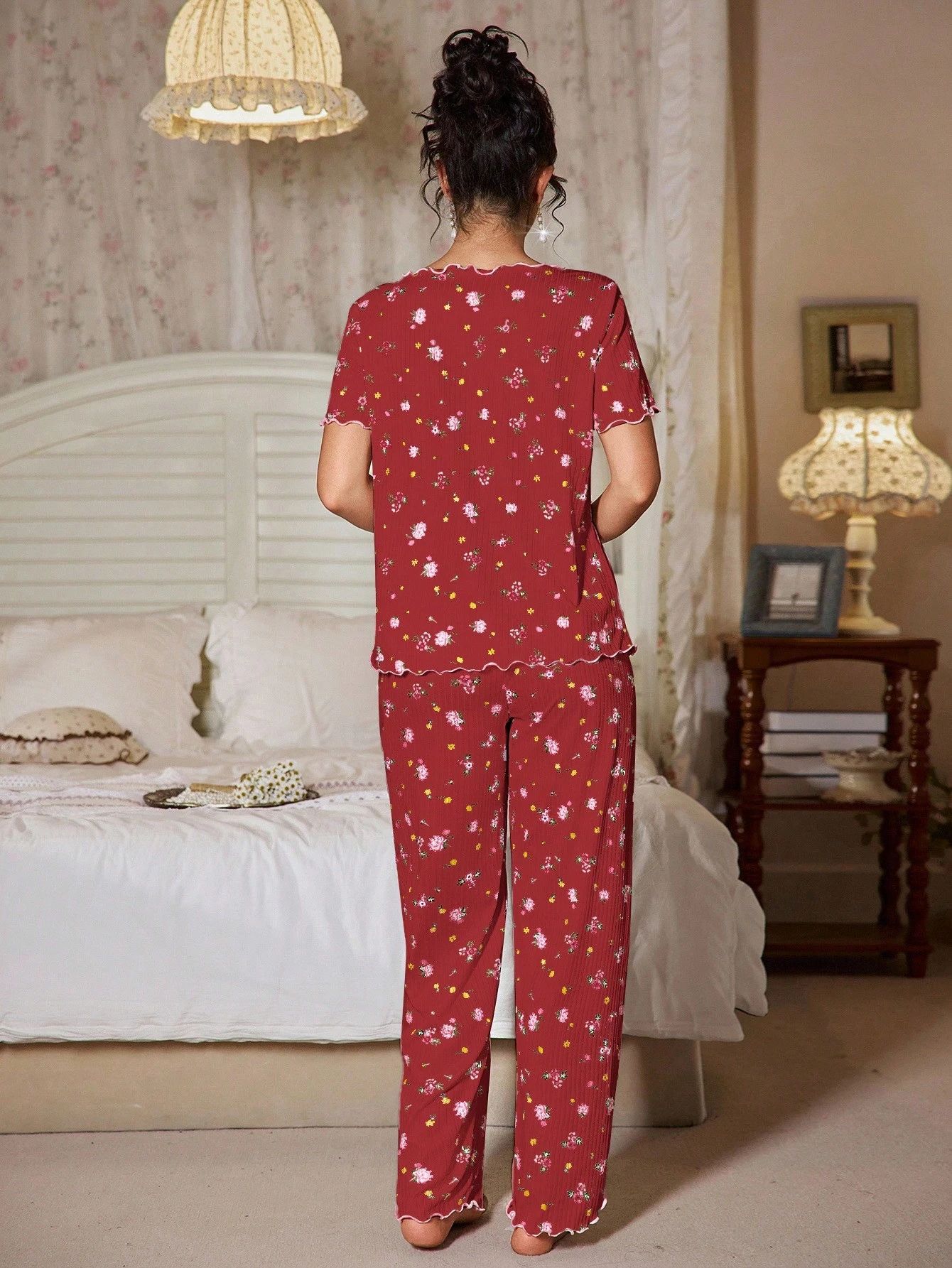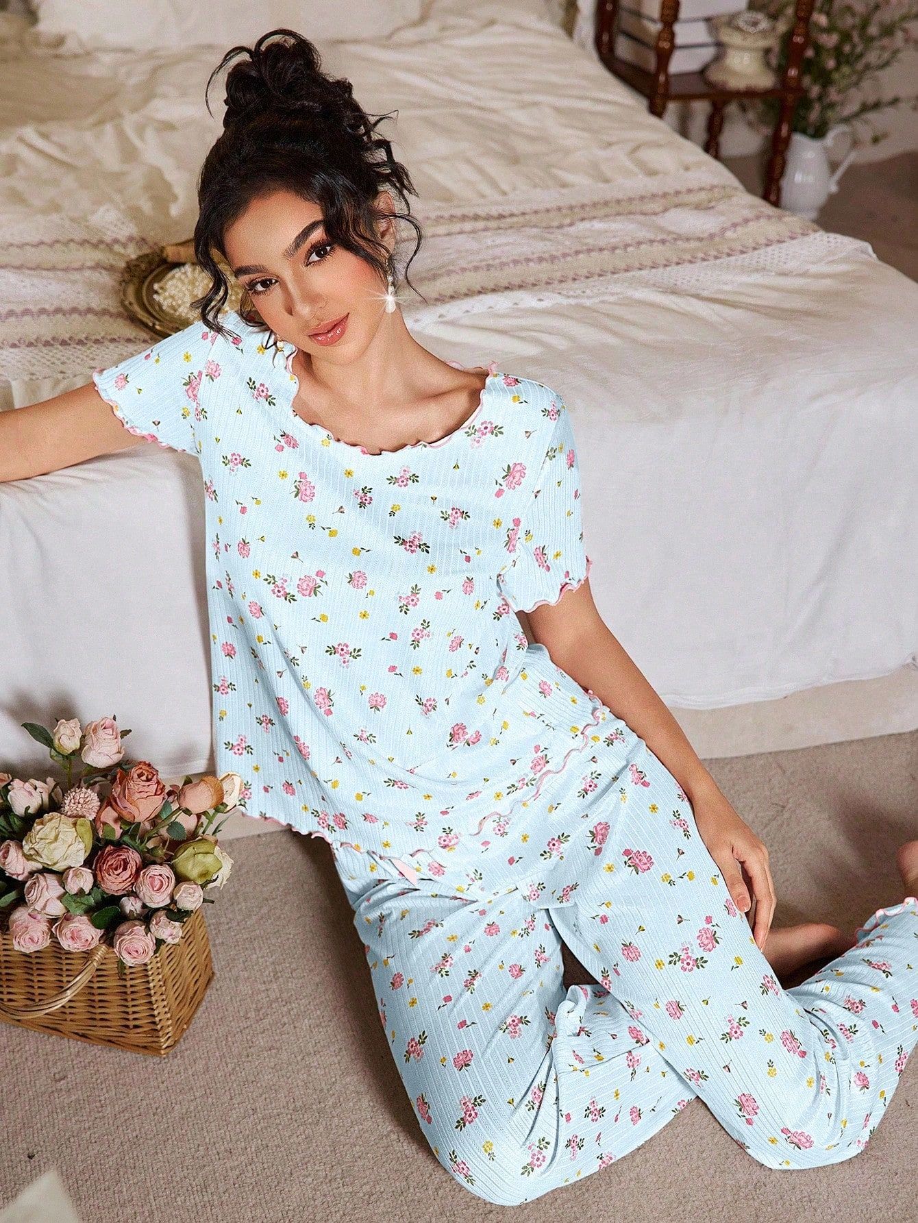 0 Review for Loose Womens Pajamas Floral Short-Sleeve Pants Two-Piece Set