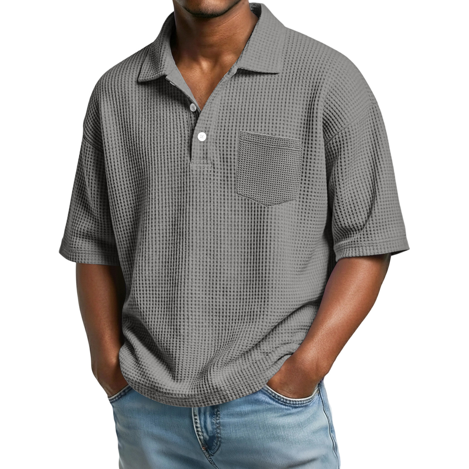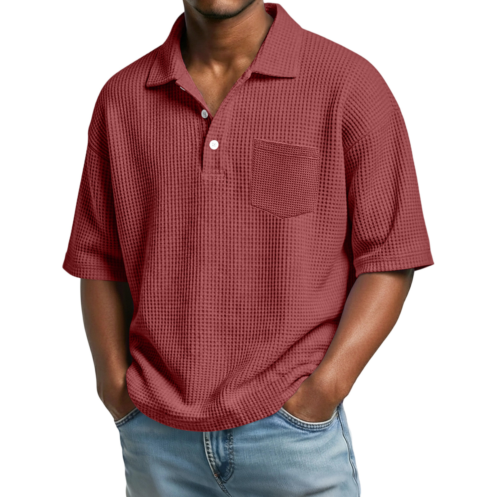 0 Review for Men's Waffle-Weave Solid Color Short-Sleeve Lapel Polo Shirt