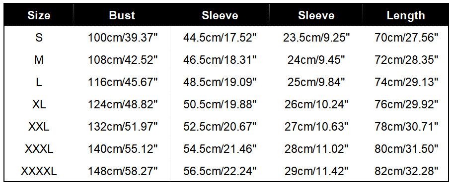 Sizes: S, M, L, XL, XXL, XXXL, XXXXL