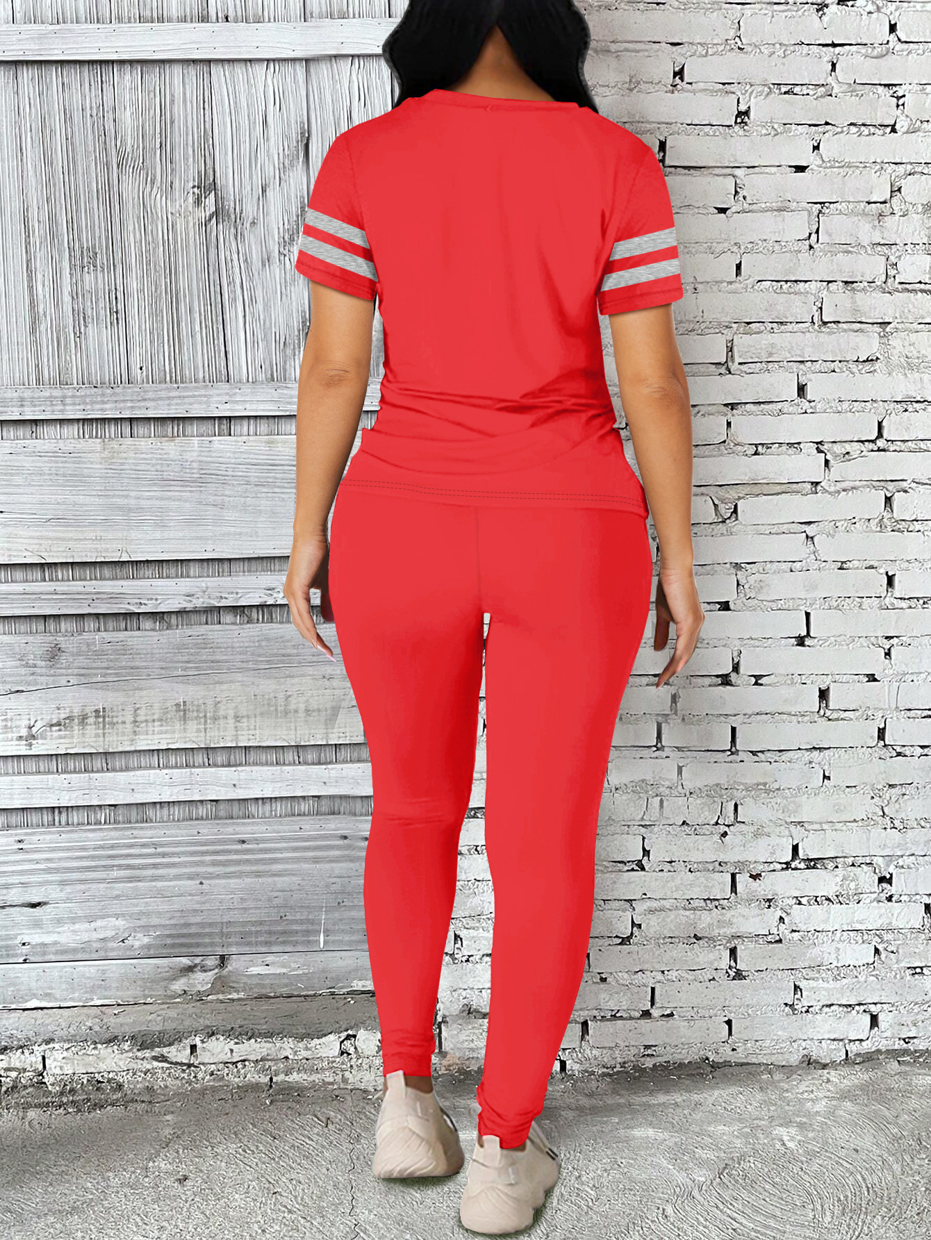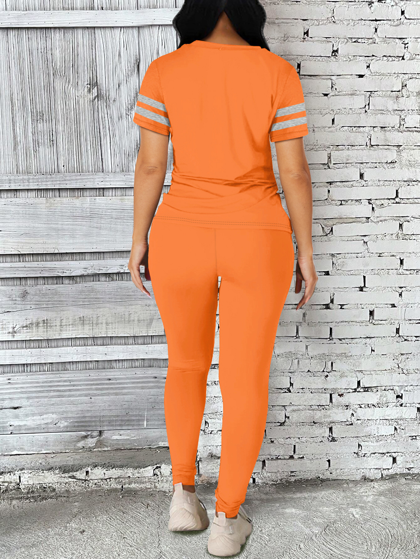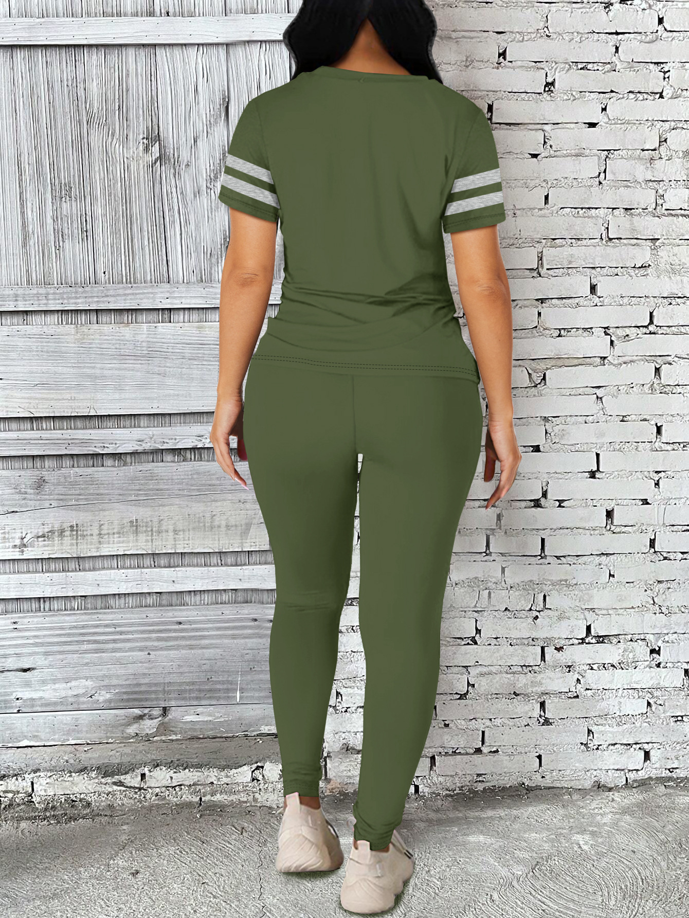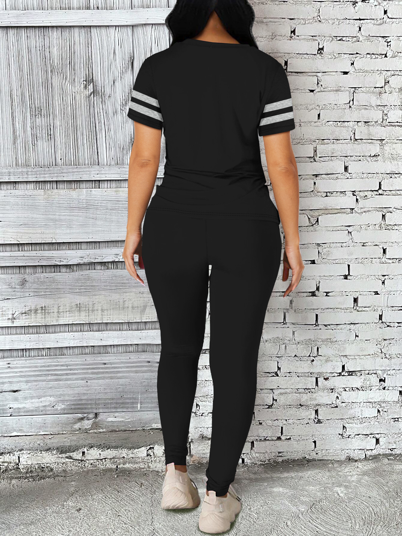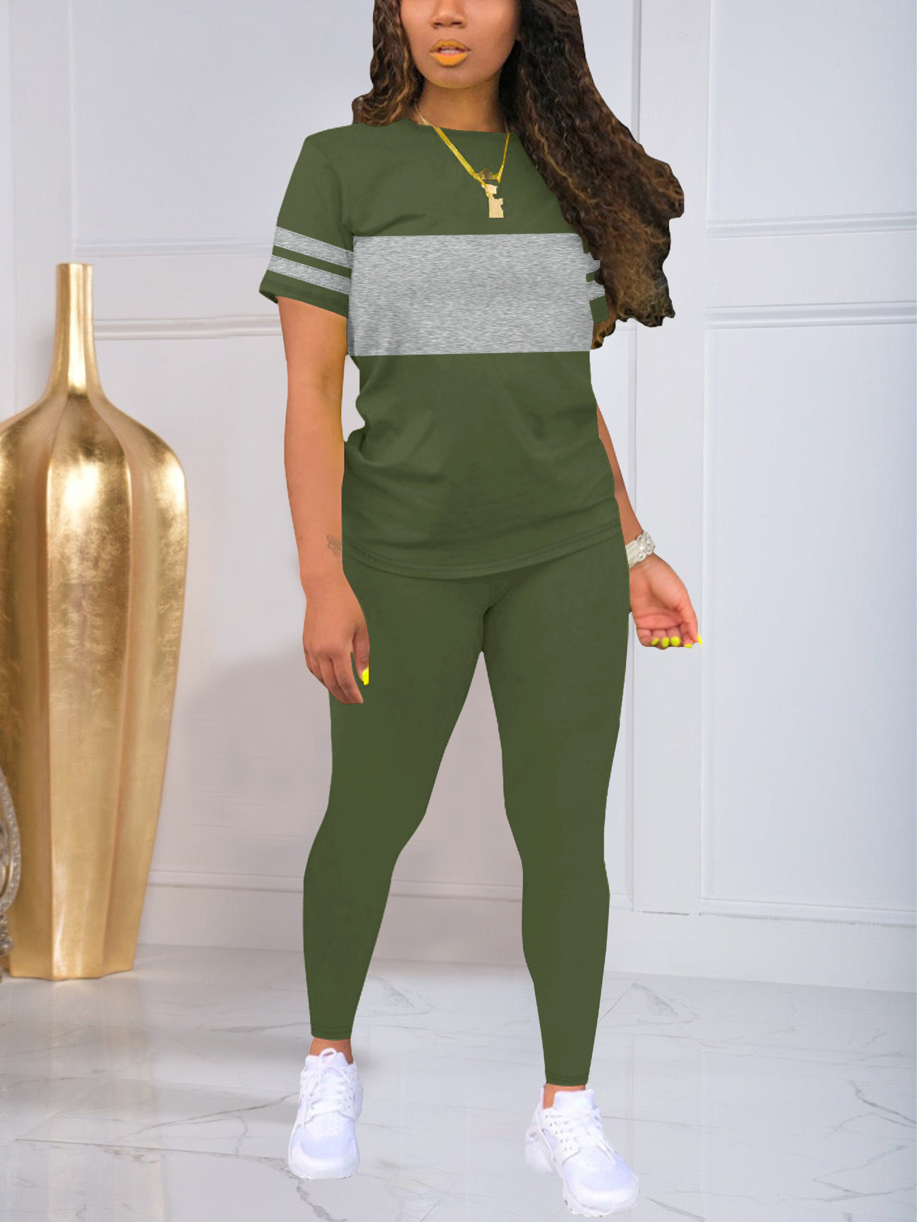 New Stylish Crew-Neck Short-Sleeve Color-Block Top And Pants Set Womens Two-Piece Outfit
