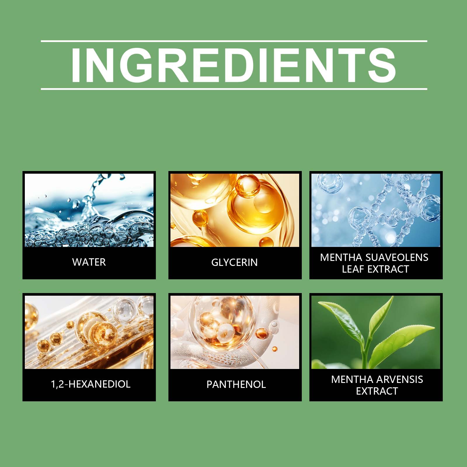 Ingredients: water, glycerin, 1,2- hexanediol, zinc ricinoleate, tea (CAMELLIA SINENSIS) extract.