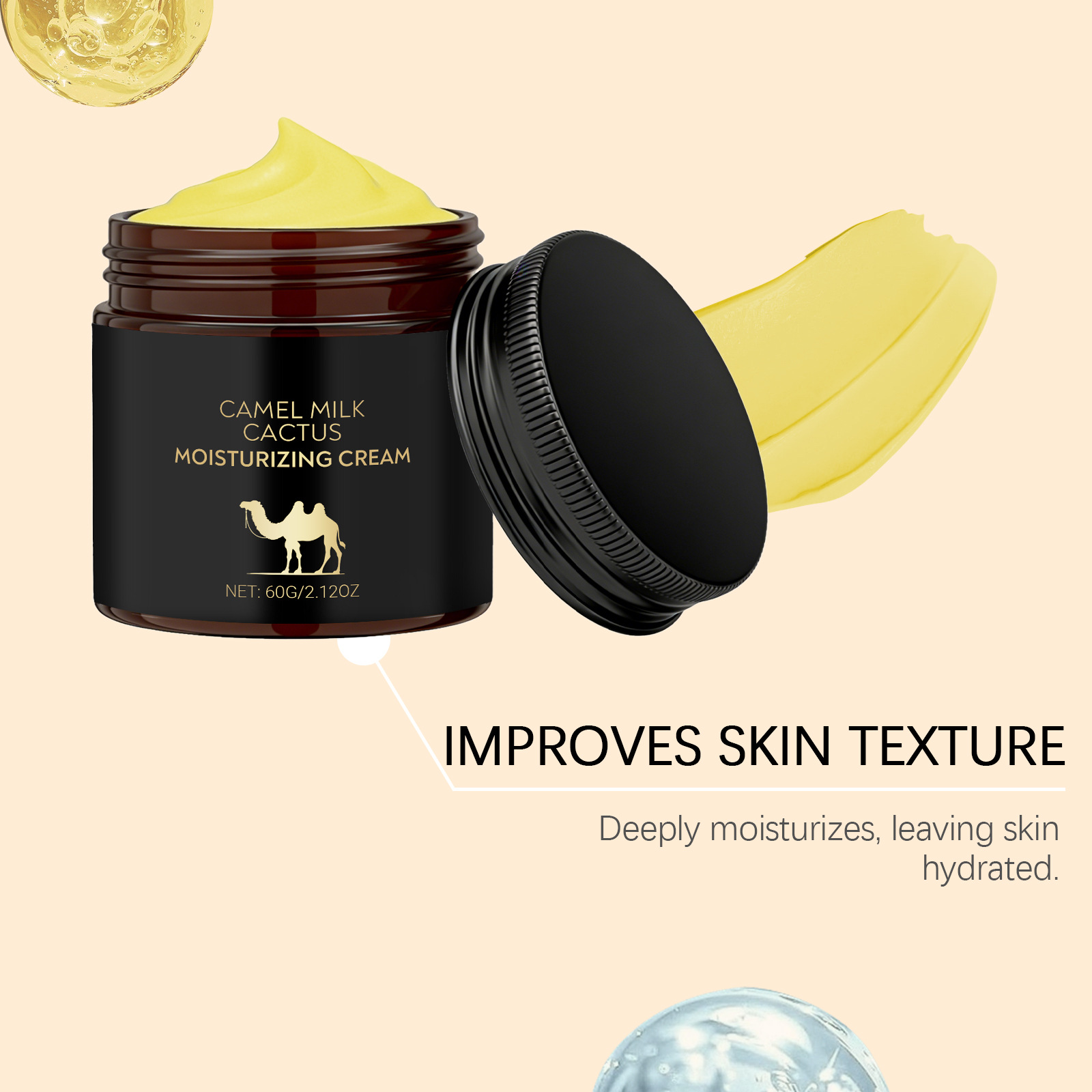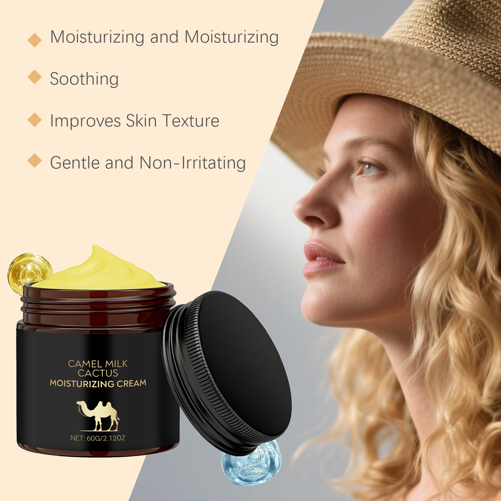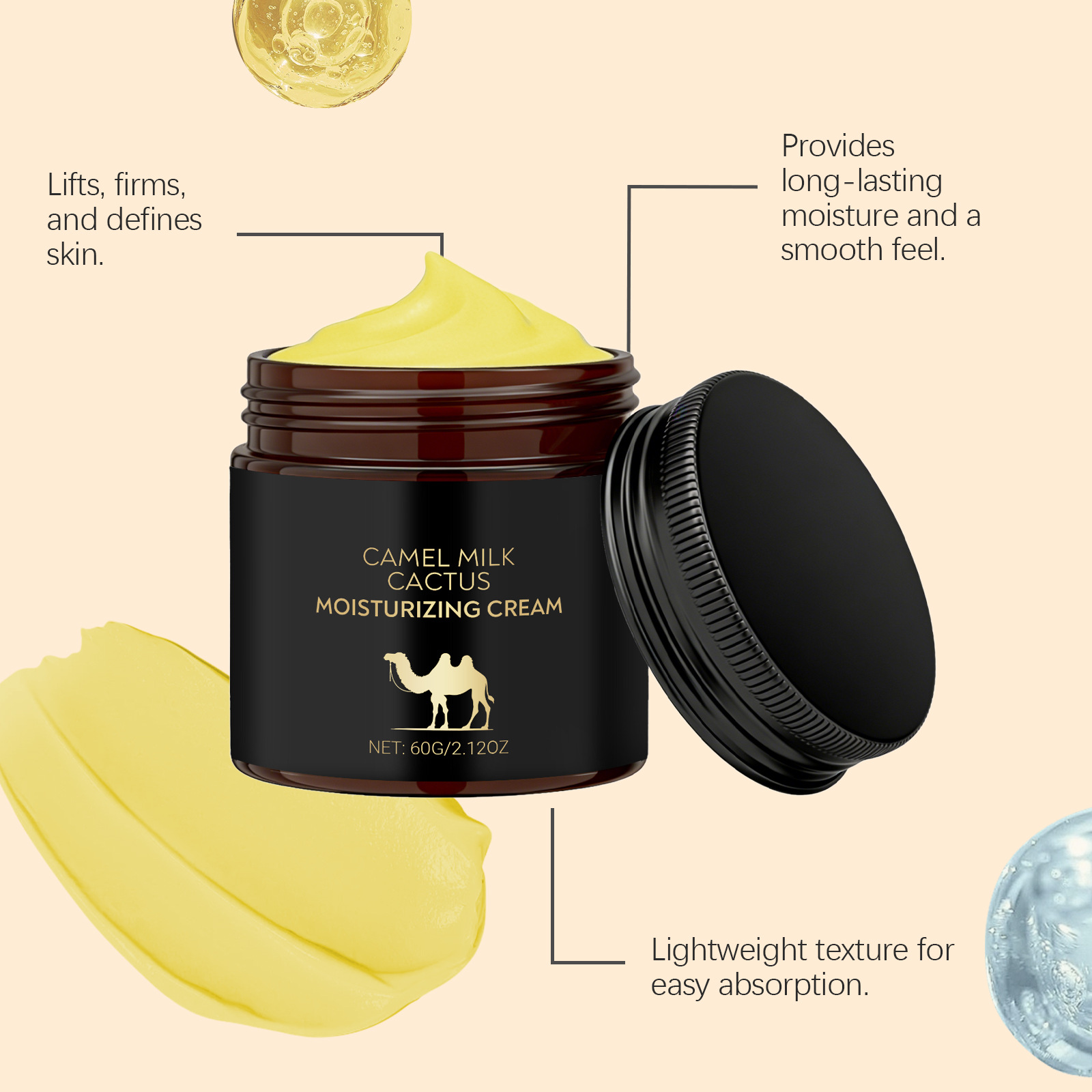 Ingredients: water, mineral oil, glycerin, glyceryl stearate, 1,2- hexanediol, carbomer, arginine, allantoin, retinol, hyaluronic acid, tocopherol (vitamin E), cactus extract and camel milk extract.