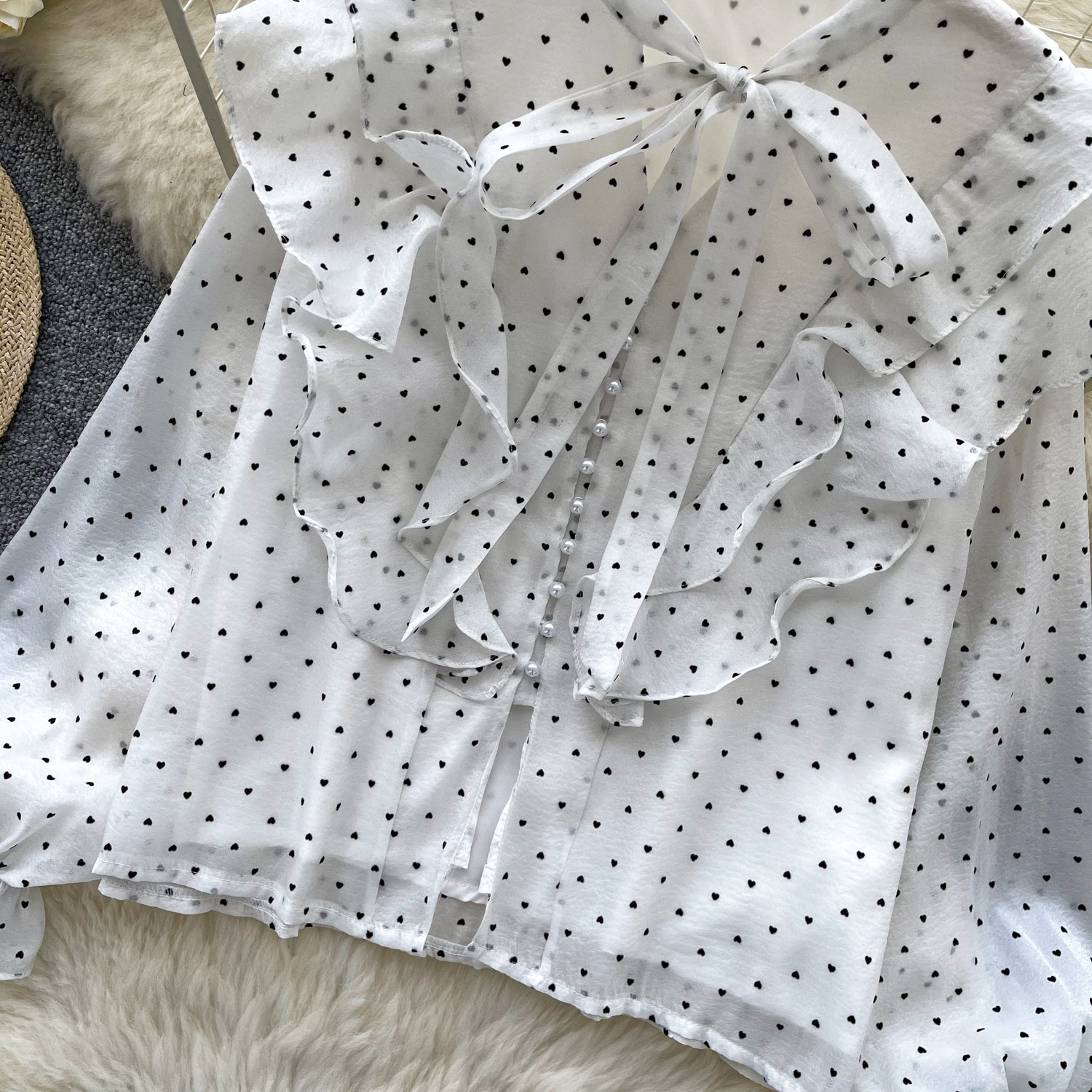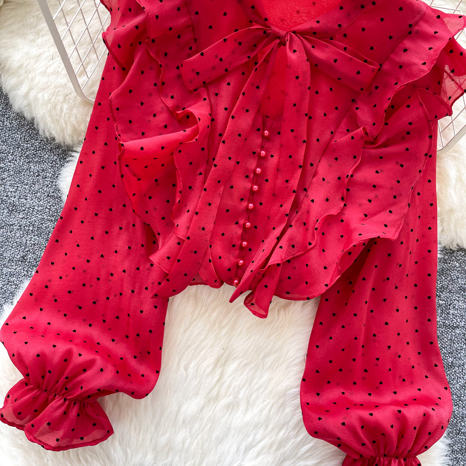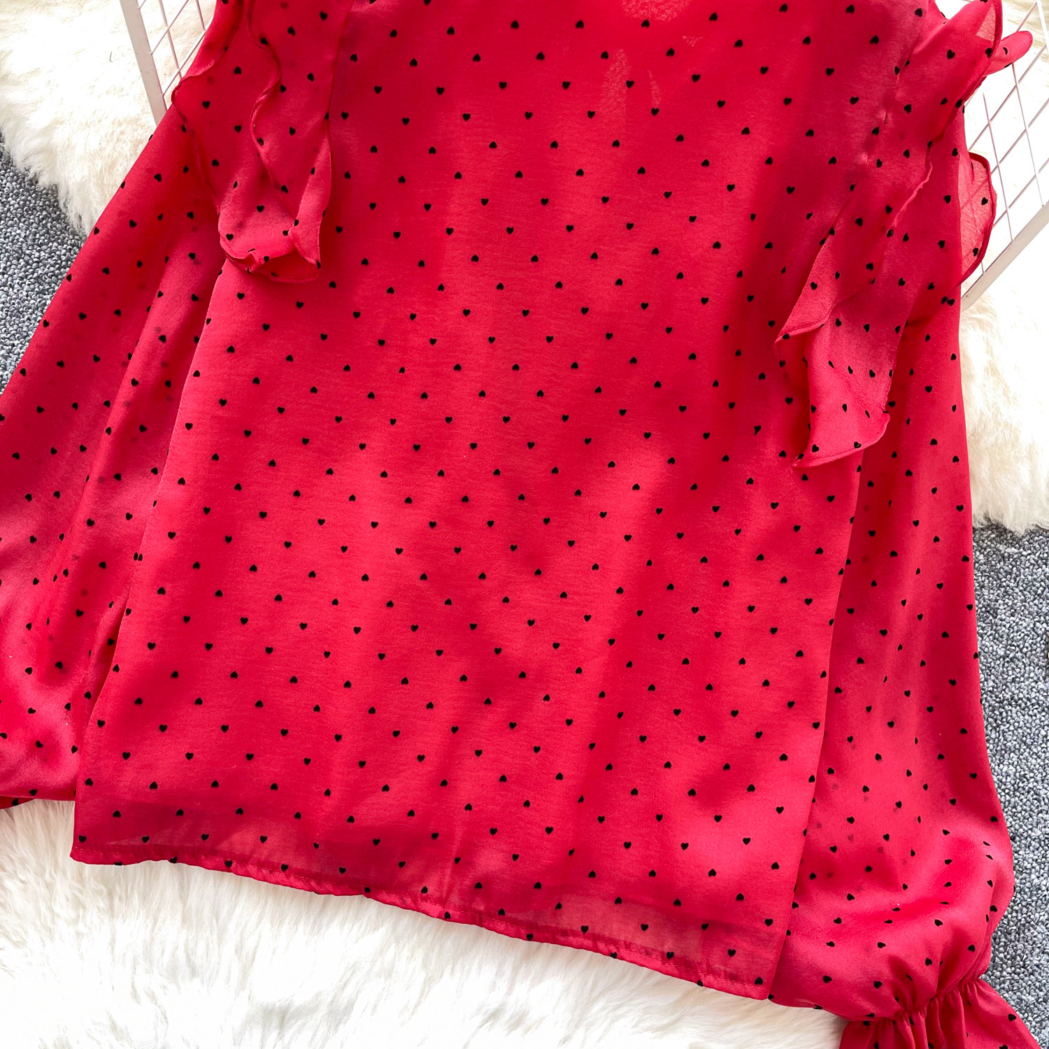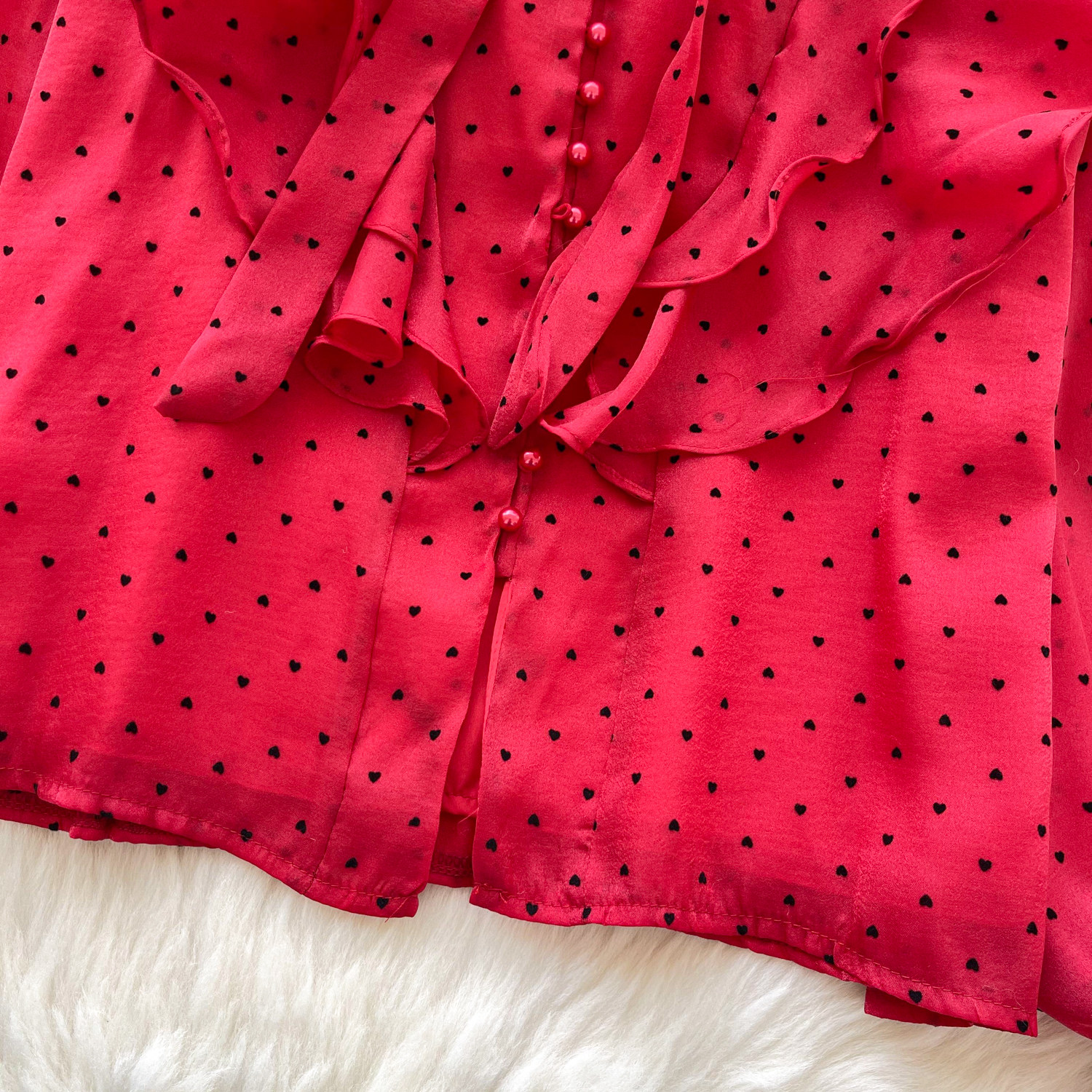 0 Review for Ruffled Patchwork Heart-print Chiffon Top