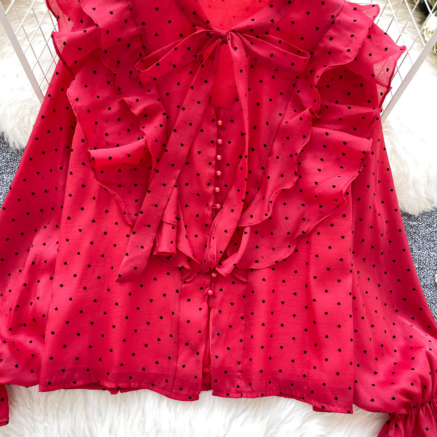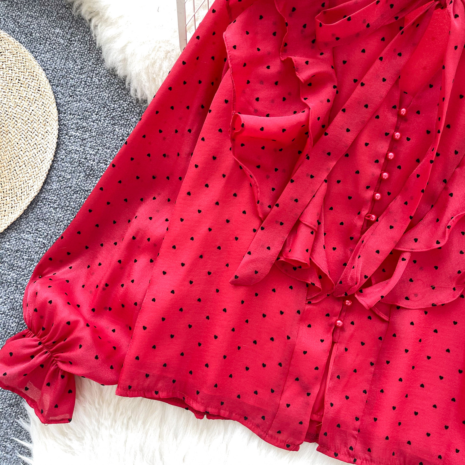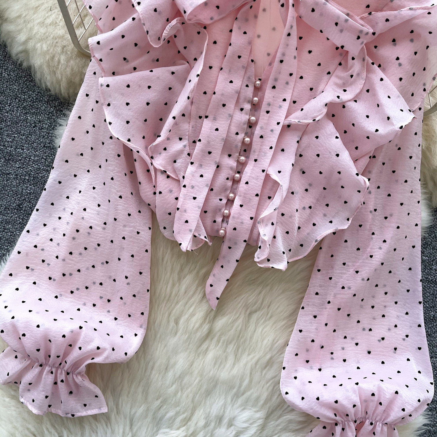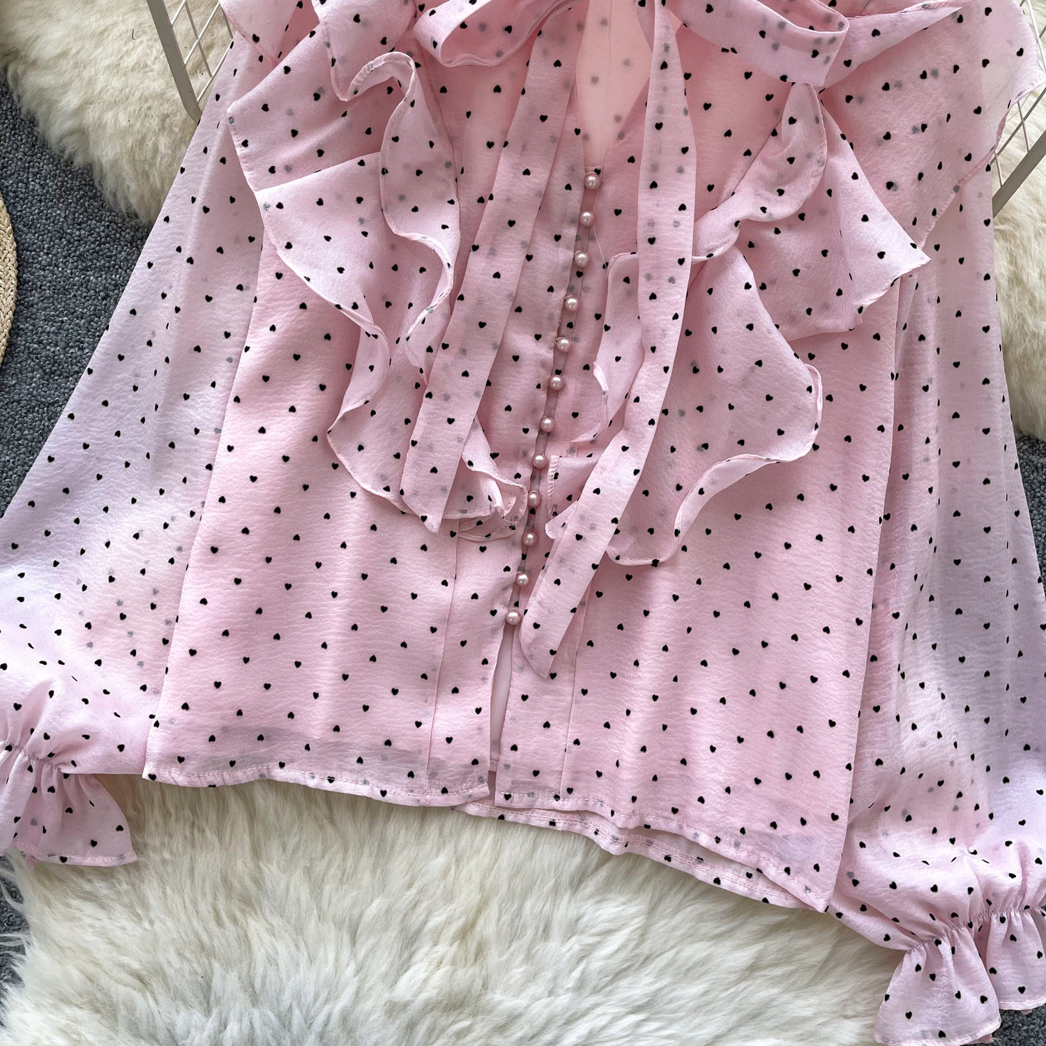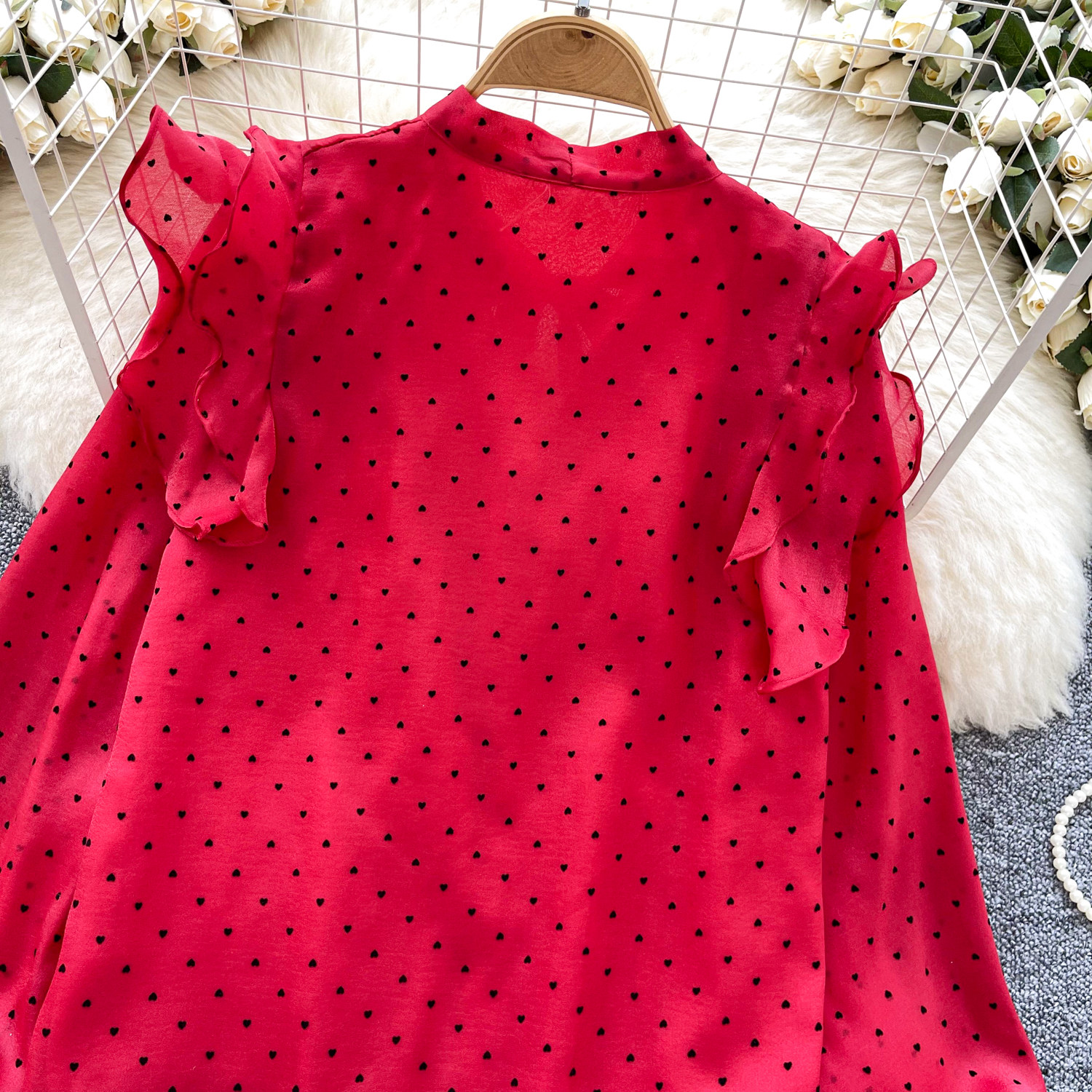 0 Review for Ruffled Patchwork Heart-print Chiffon Top