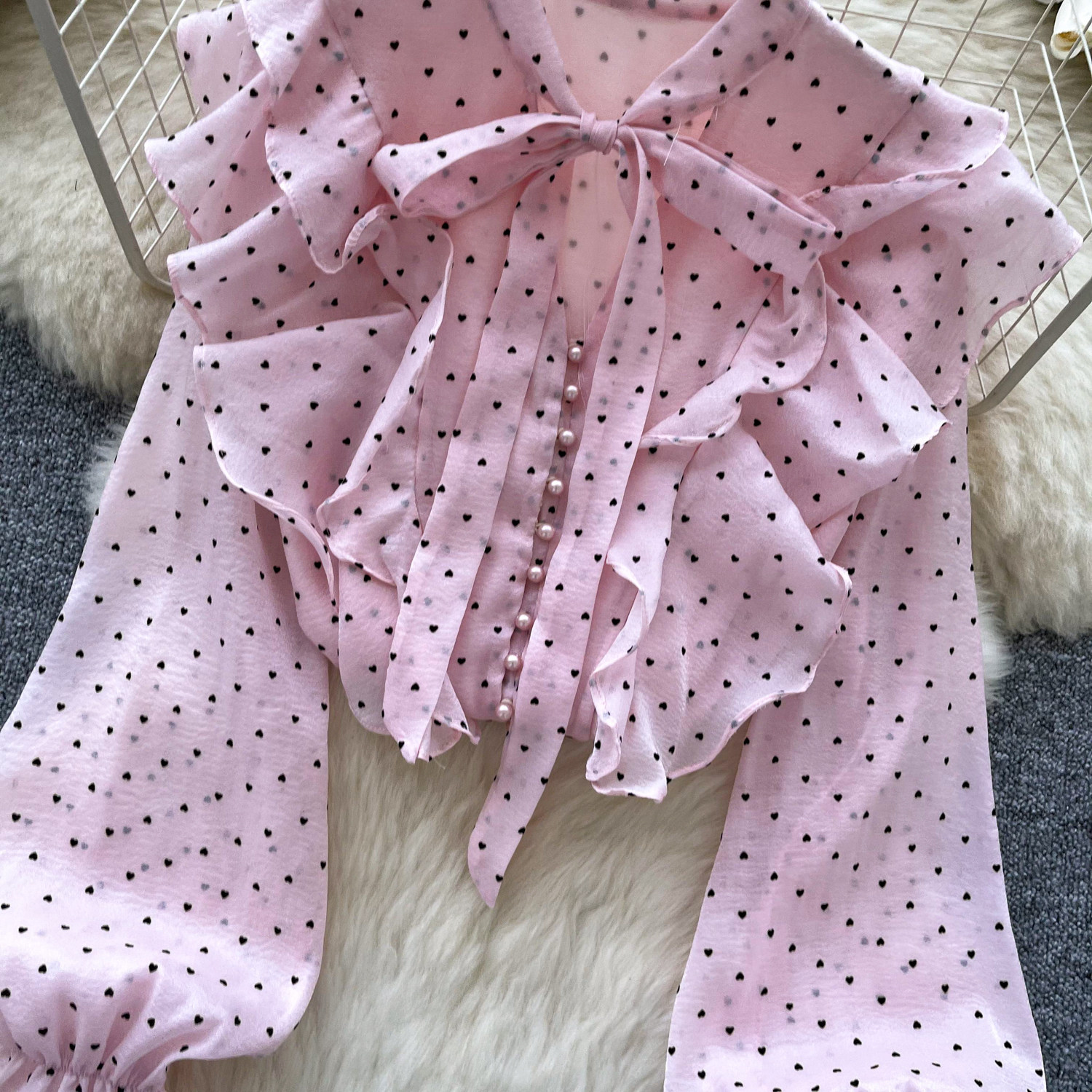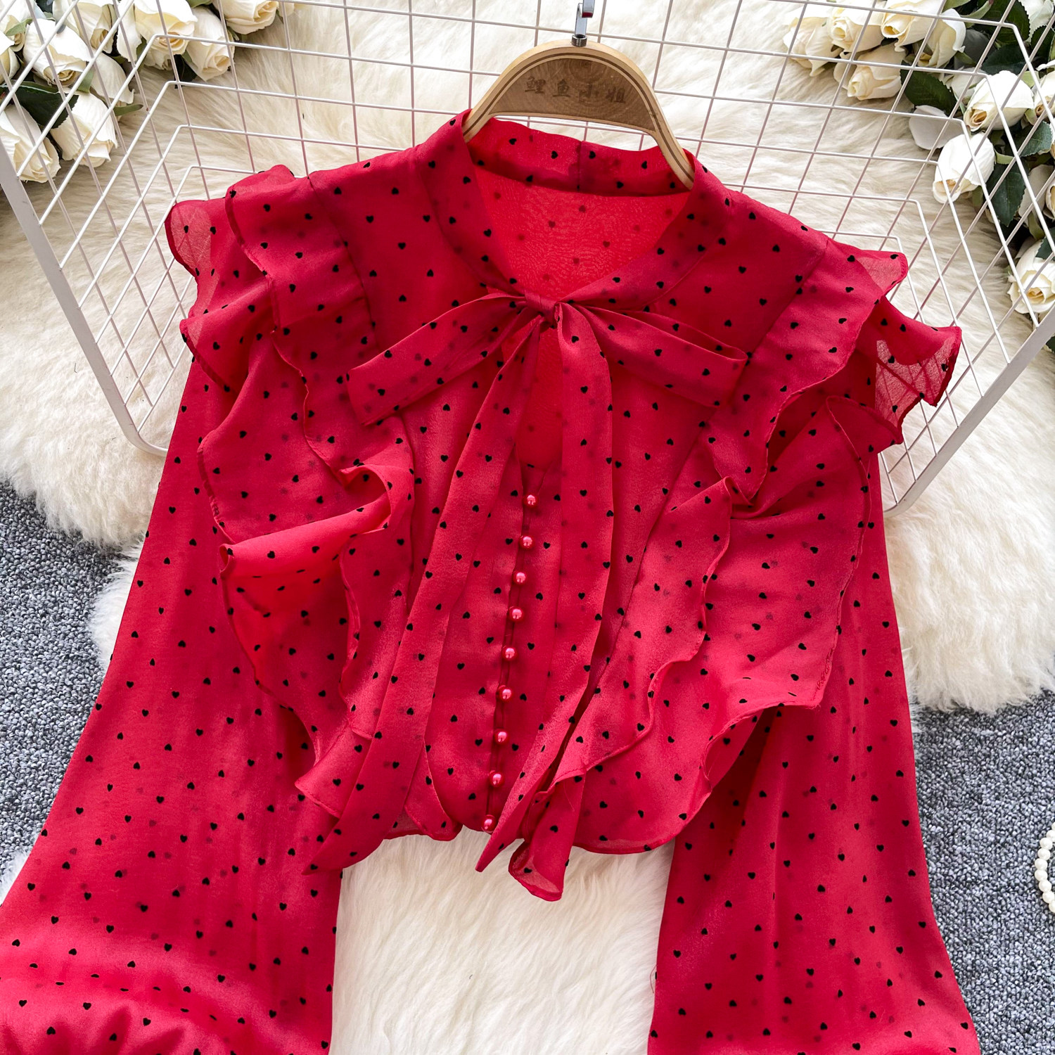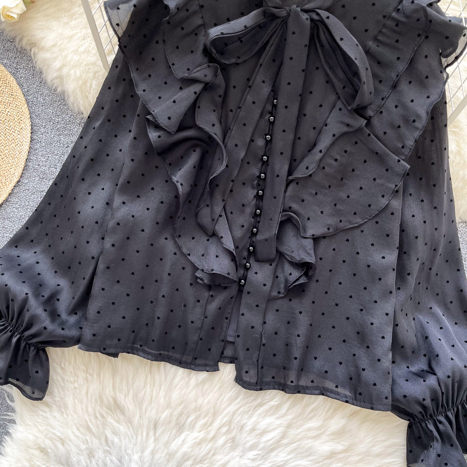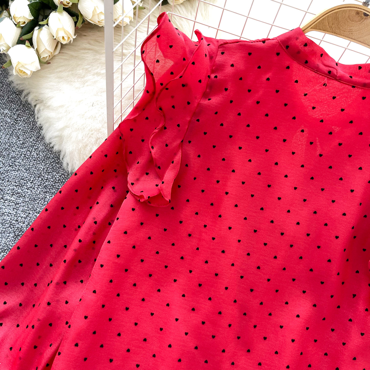 0 Review for Ruffled Patchwork Heart-print Chiffon Top