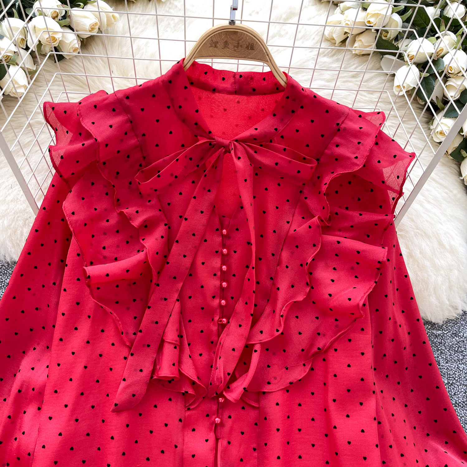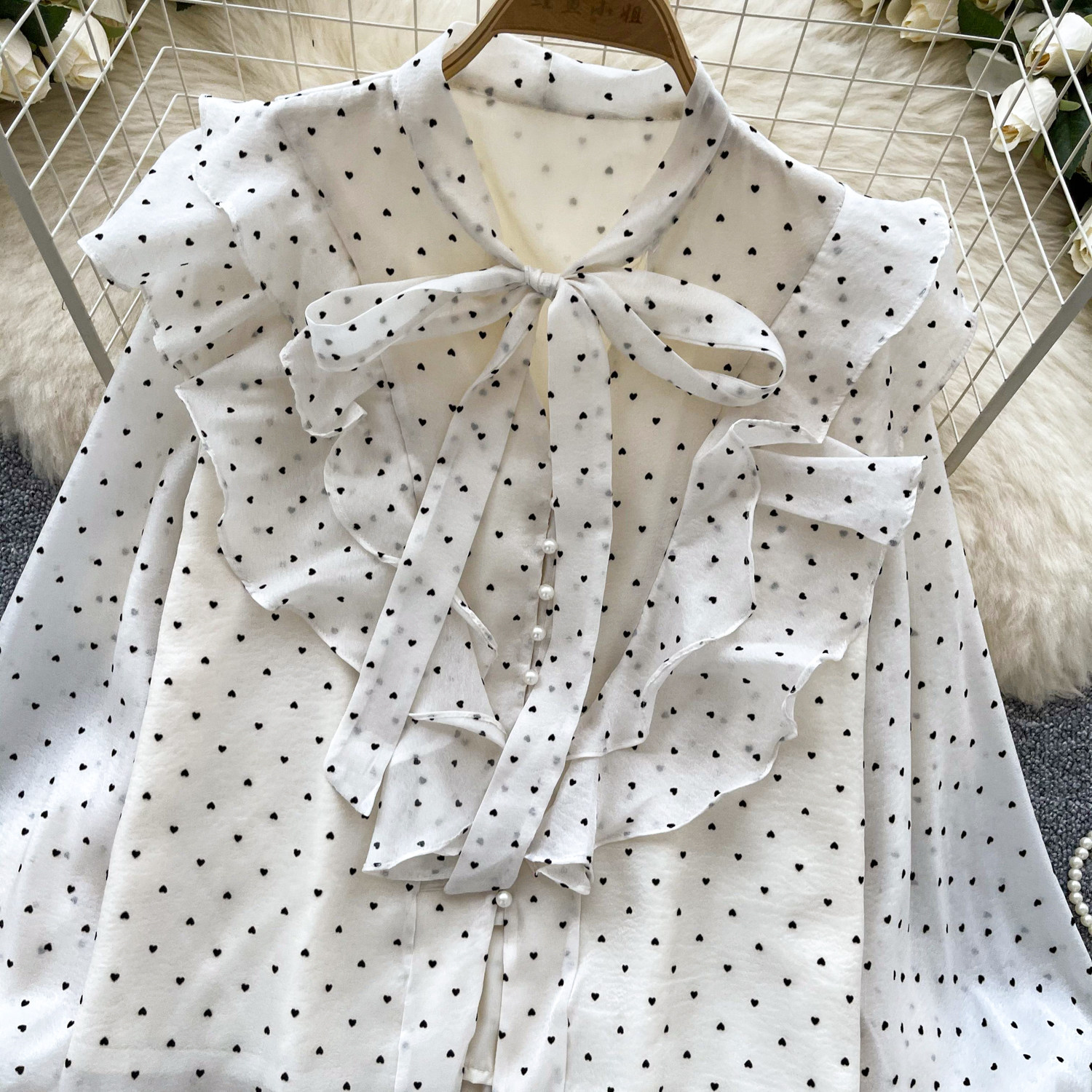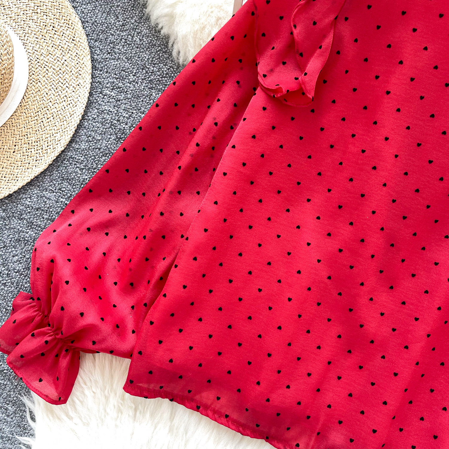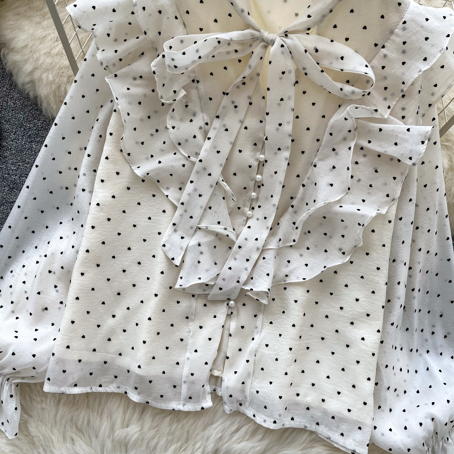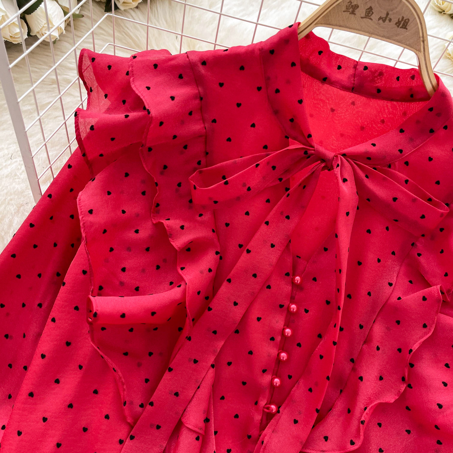 0 Review for Ruffled Patchwork Heart-print Chiffon Top