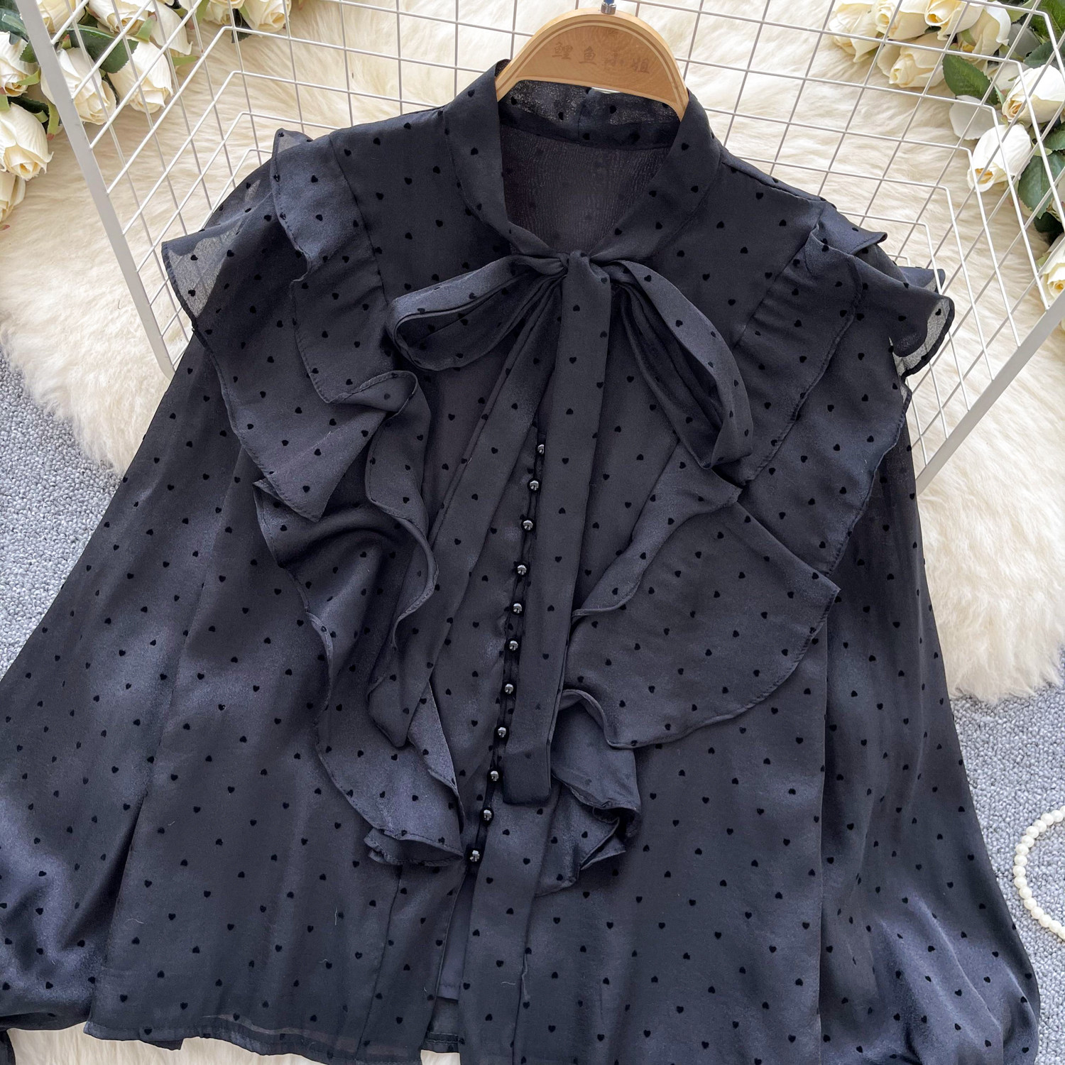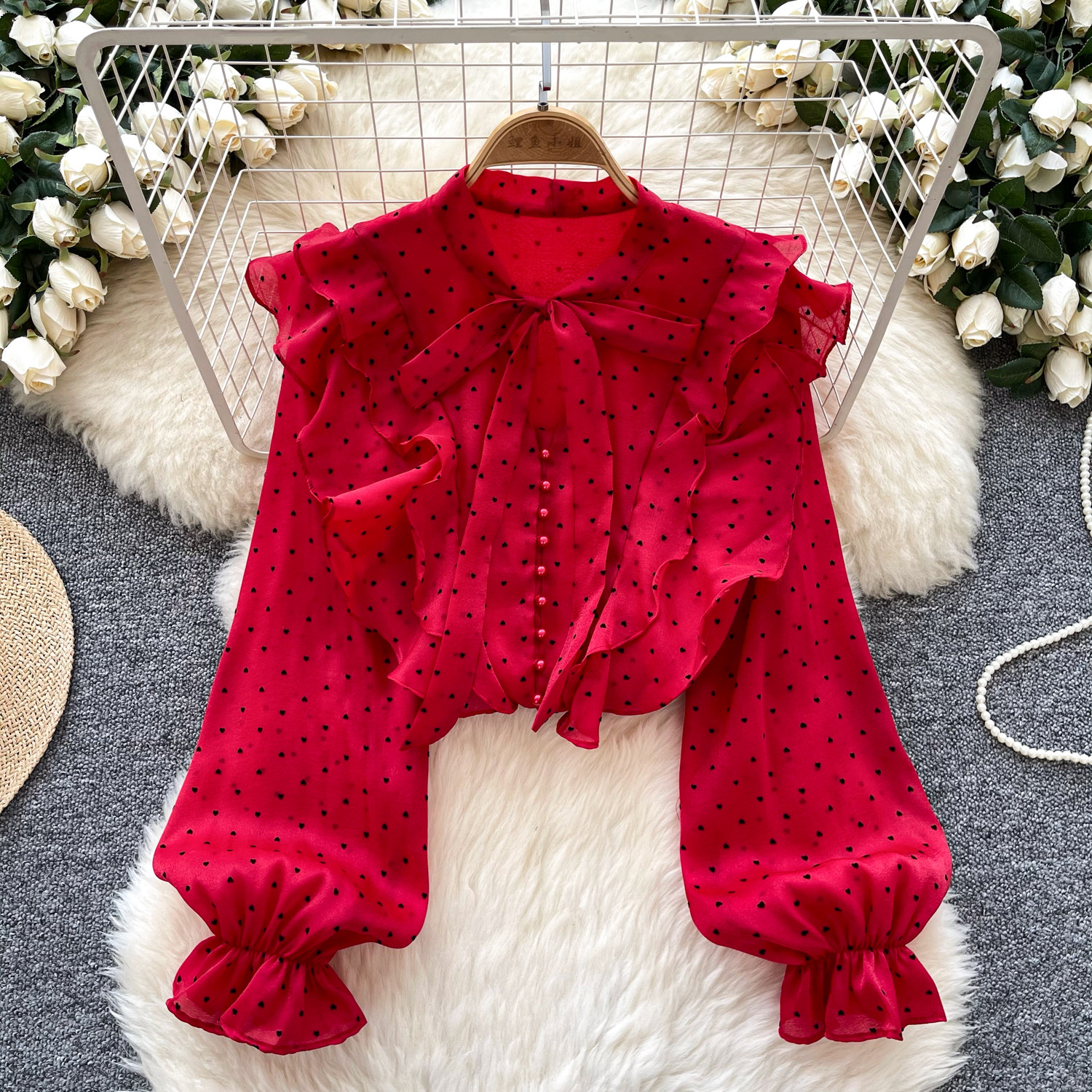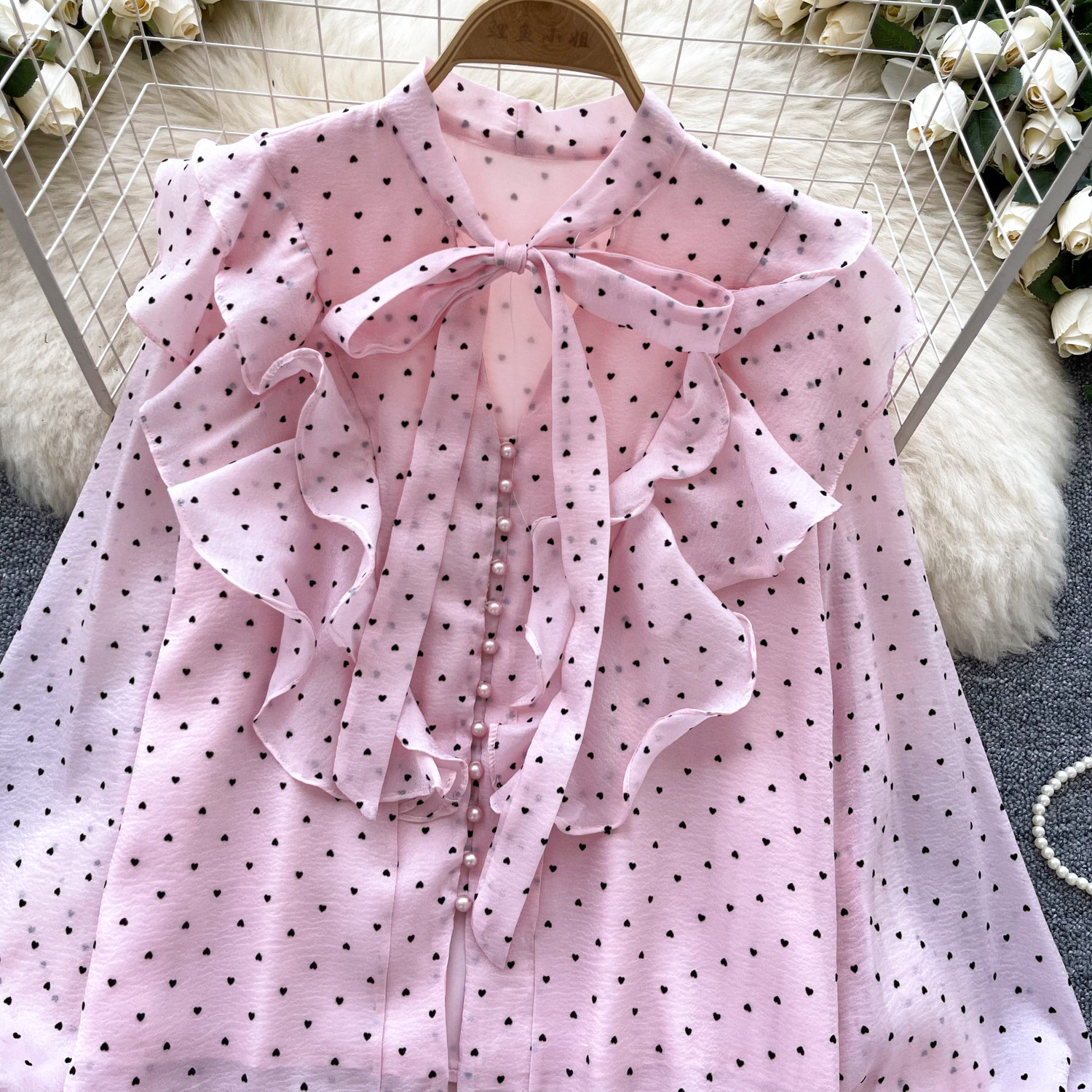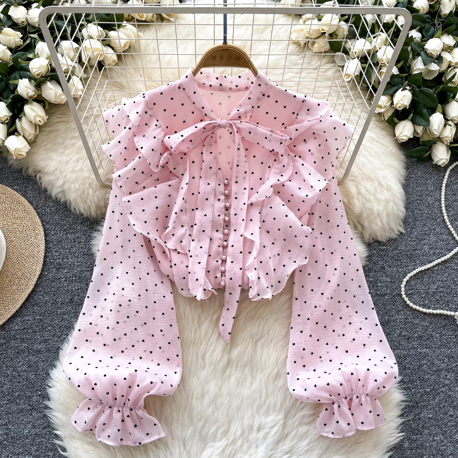 0 Review for Ruffled Patchwork Heart-print Chiffon Top