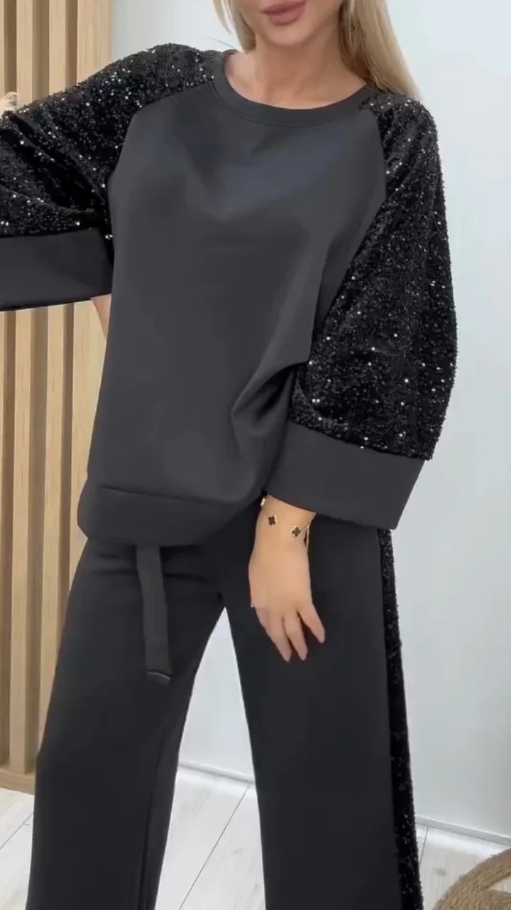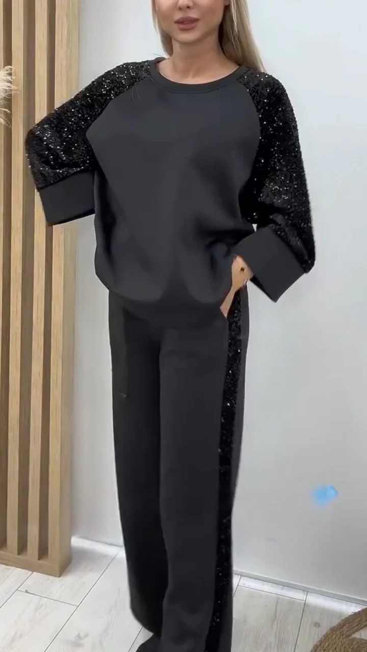 Sequined Patchwork Long-Sleeve Crew-Neck Sweatshirt And Sweatpants Set