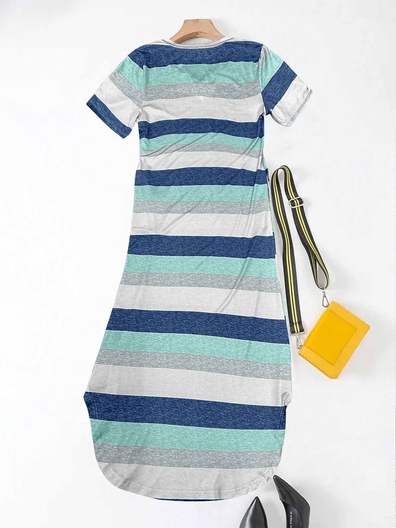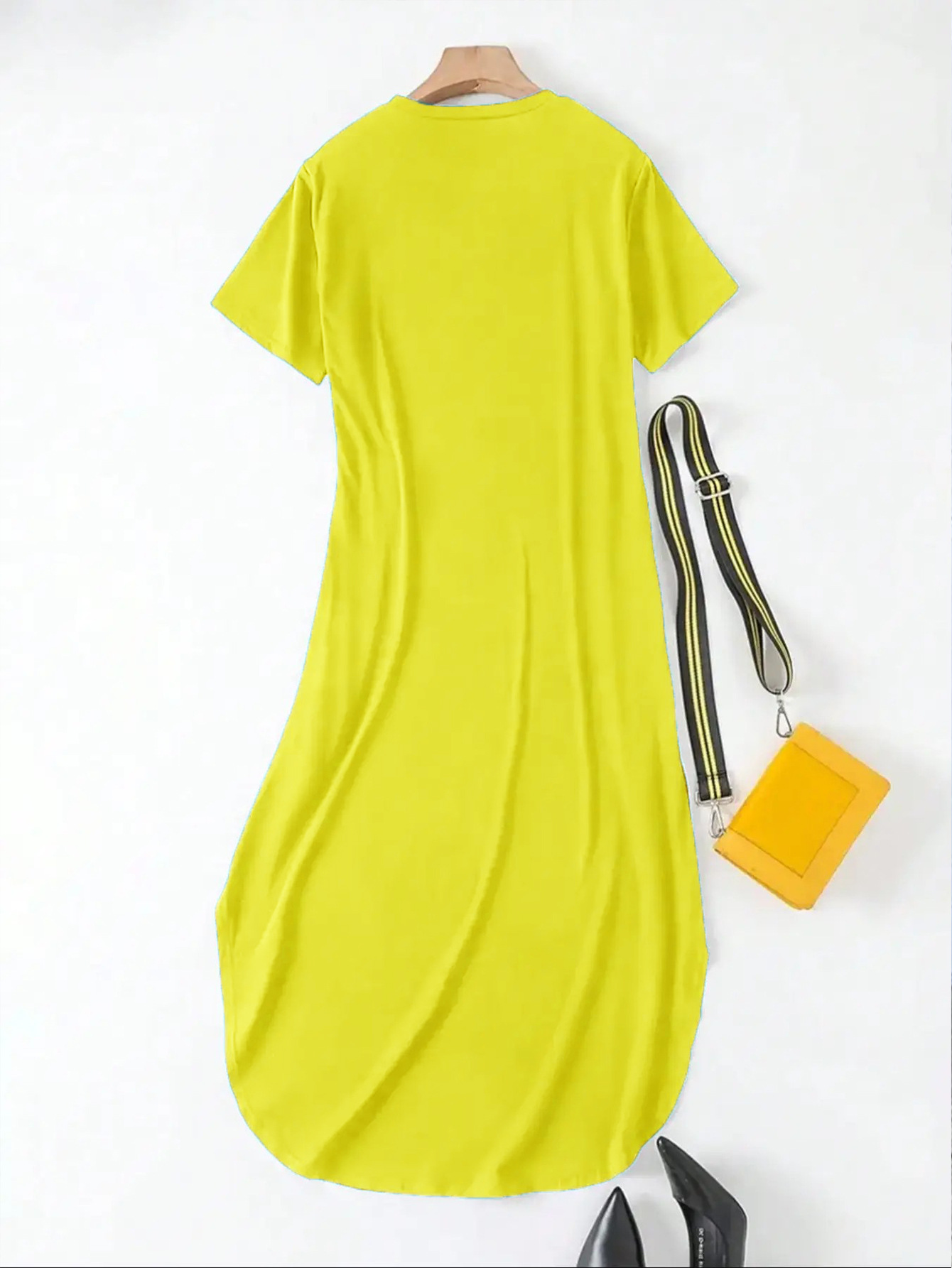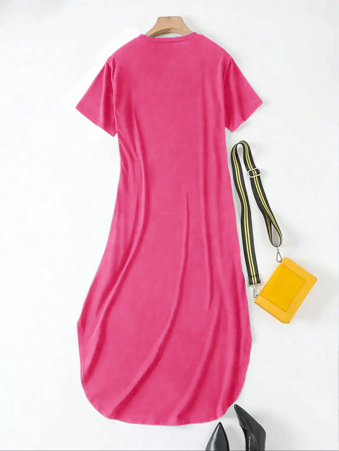 Solid-color Crew-neck Pocket Short-sleeve Dress