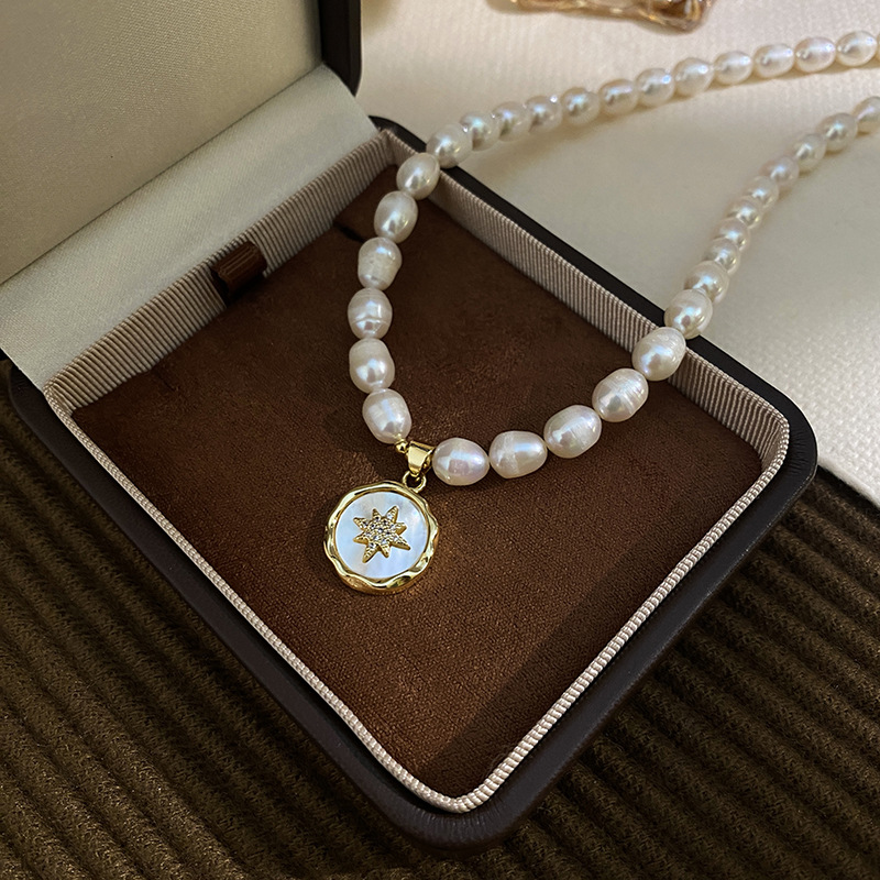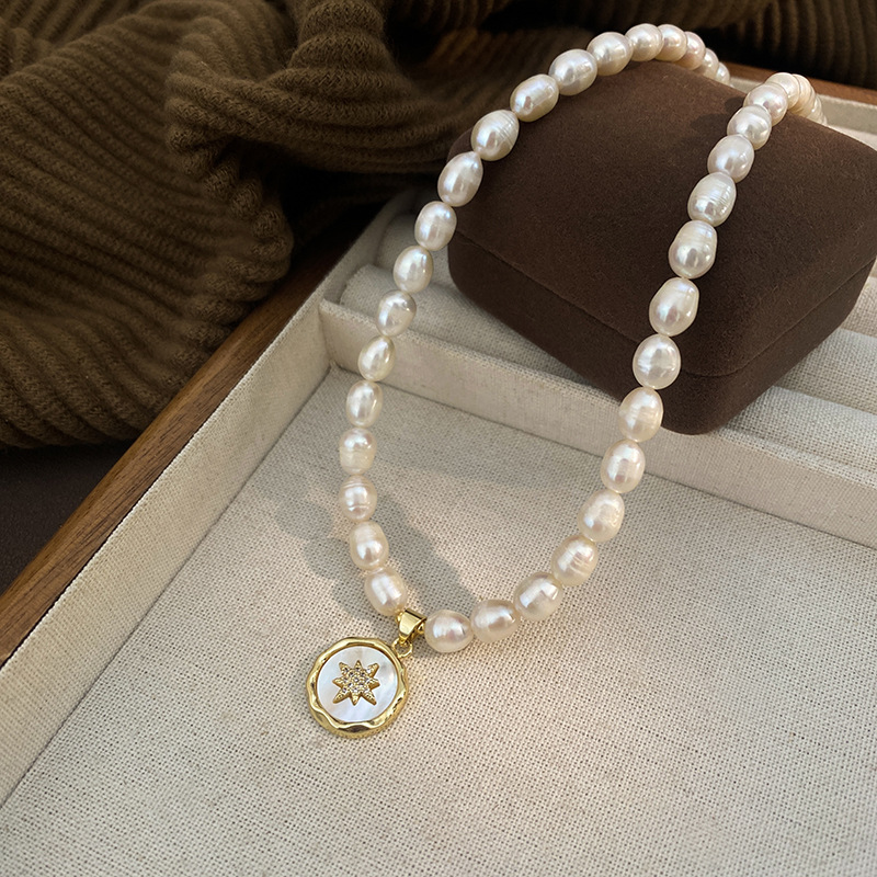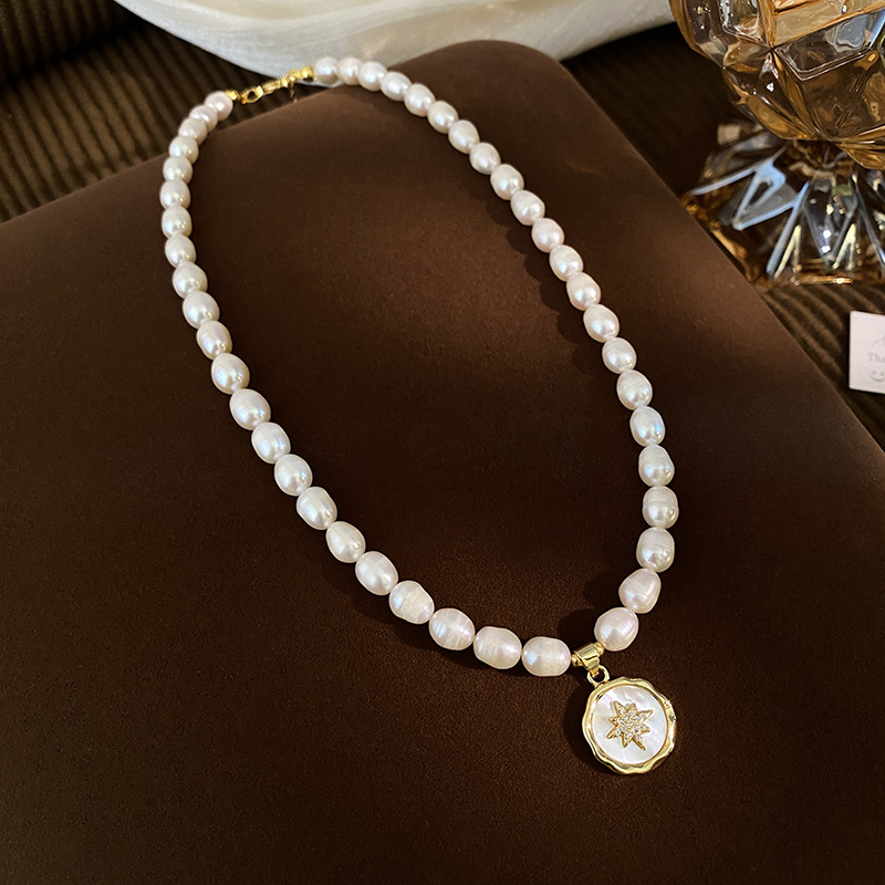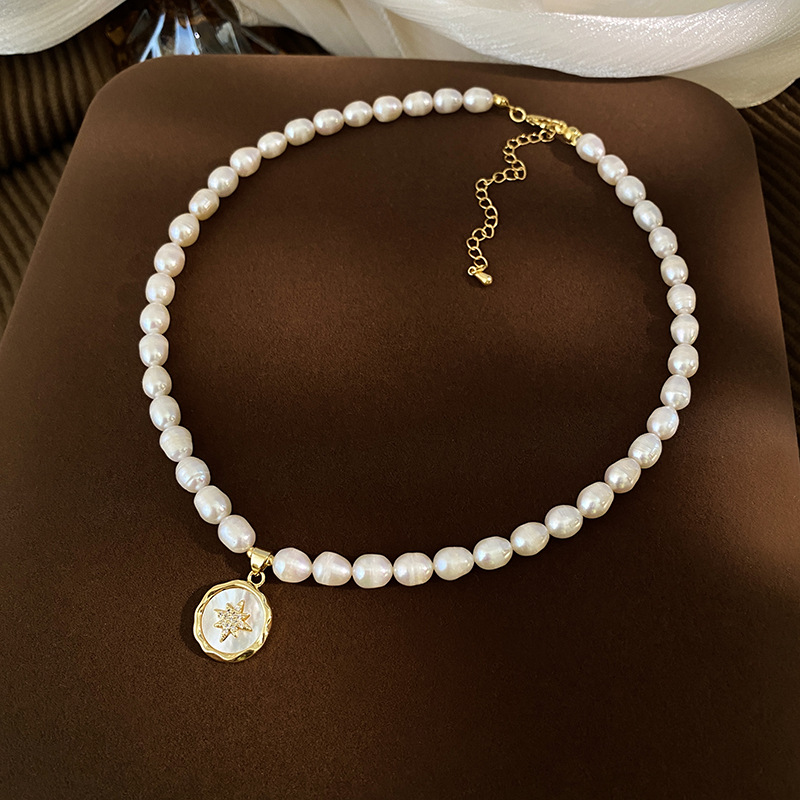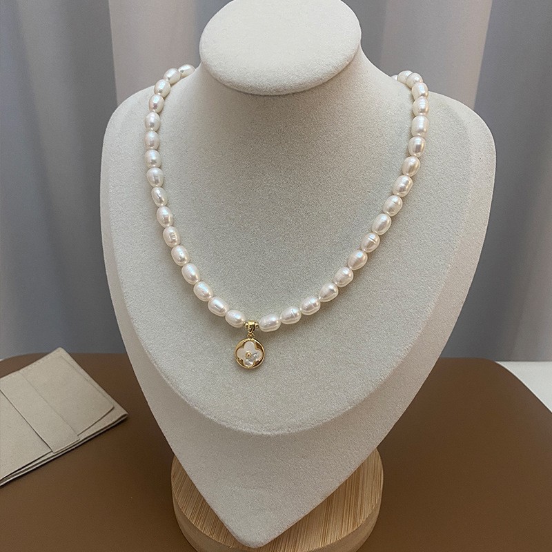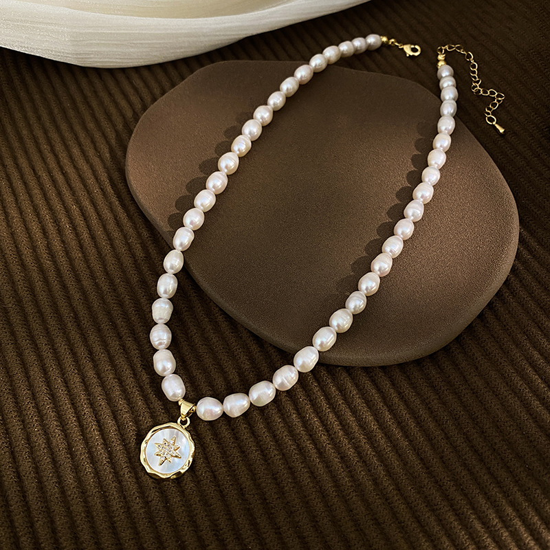 Colors: 6–7 mm rice beads + eight-pointed star badge pendant necklace, 6–7 mm rice beads + four-leaf clover pendant, 6–7 mm rice beads + sun emblem pendant, 5–6 mm rice beads + crown sugar cube pendant, 5–6 mm rice beads + zircon cross-and-star pendant