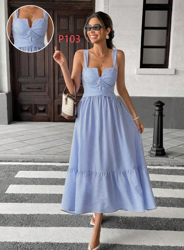 0 Review for V-neck Striped Spaghetti Straps Dress