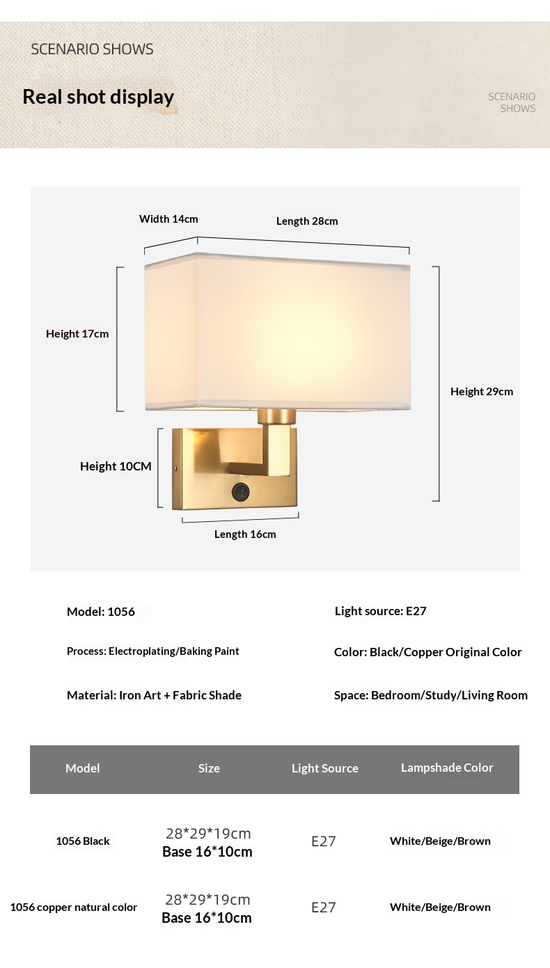 Light color: 1056 black body with white shade, 1056 black body with beige shade, 1056 black body with brown shade, 1056 copper-colored body with white shade, 1056 copper-colored body with beige shade, 1056 copper-colored body with brown shade