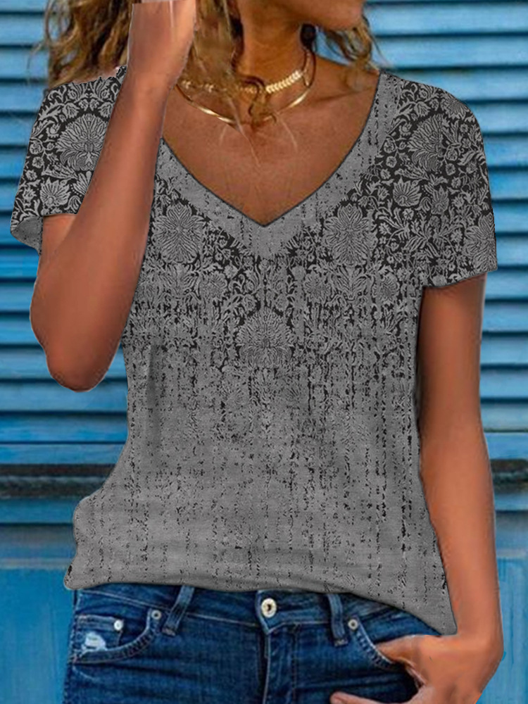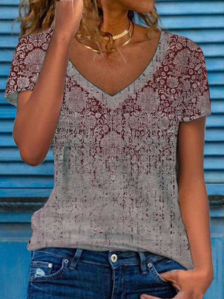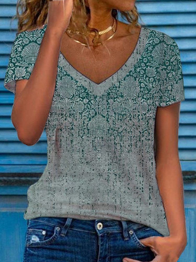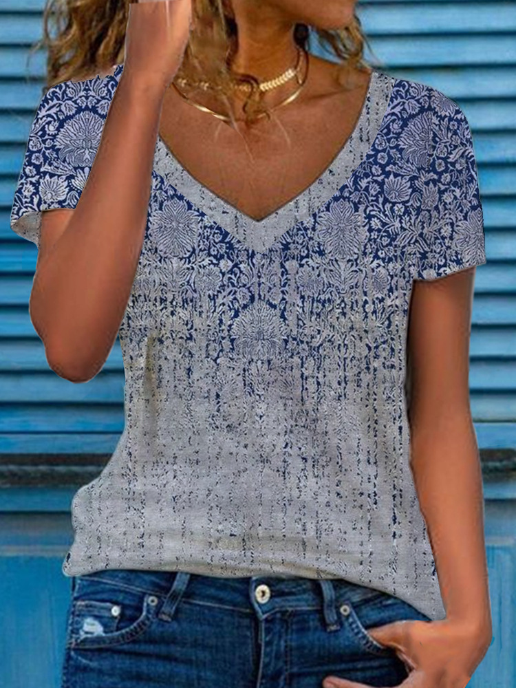 0 Review for Women's Multicolor Floral Print Short-Sleeve V-Neck Top