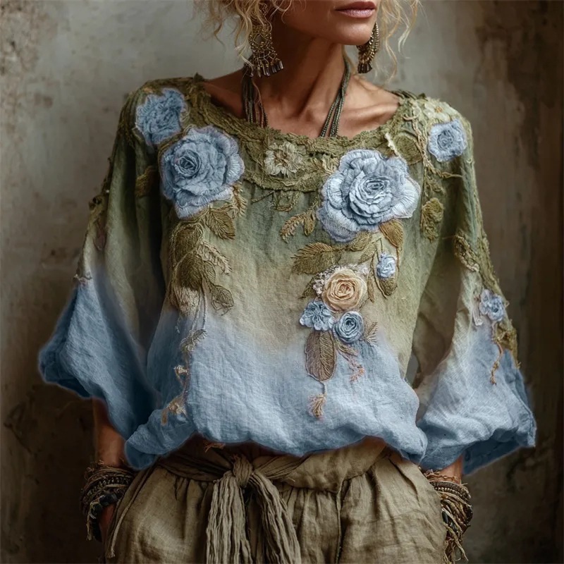 0 Review for Womens 3D-printed Crew-neck Long-sleeve Retro Bohemian Top