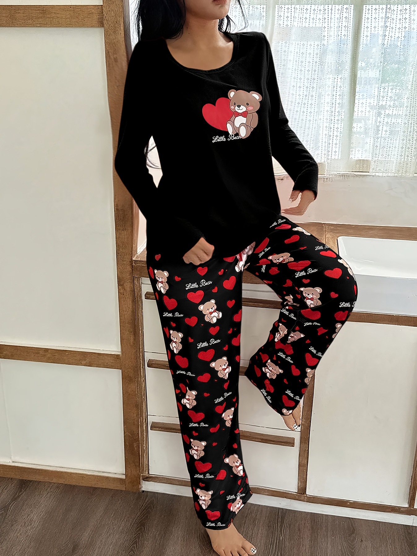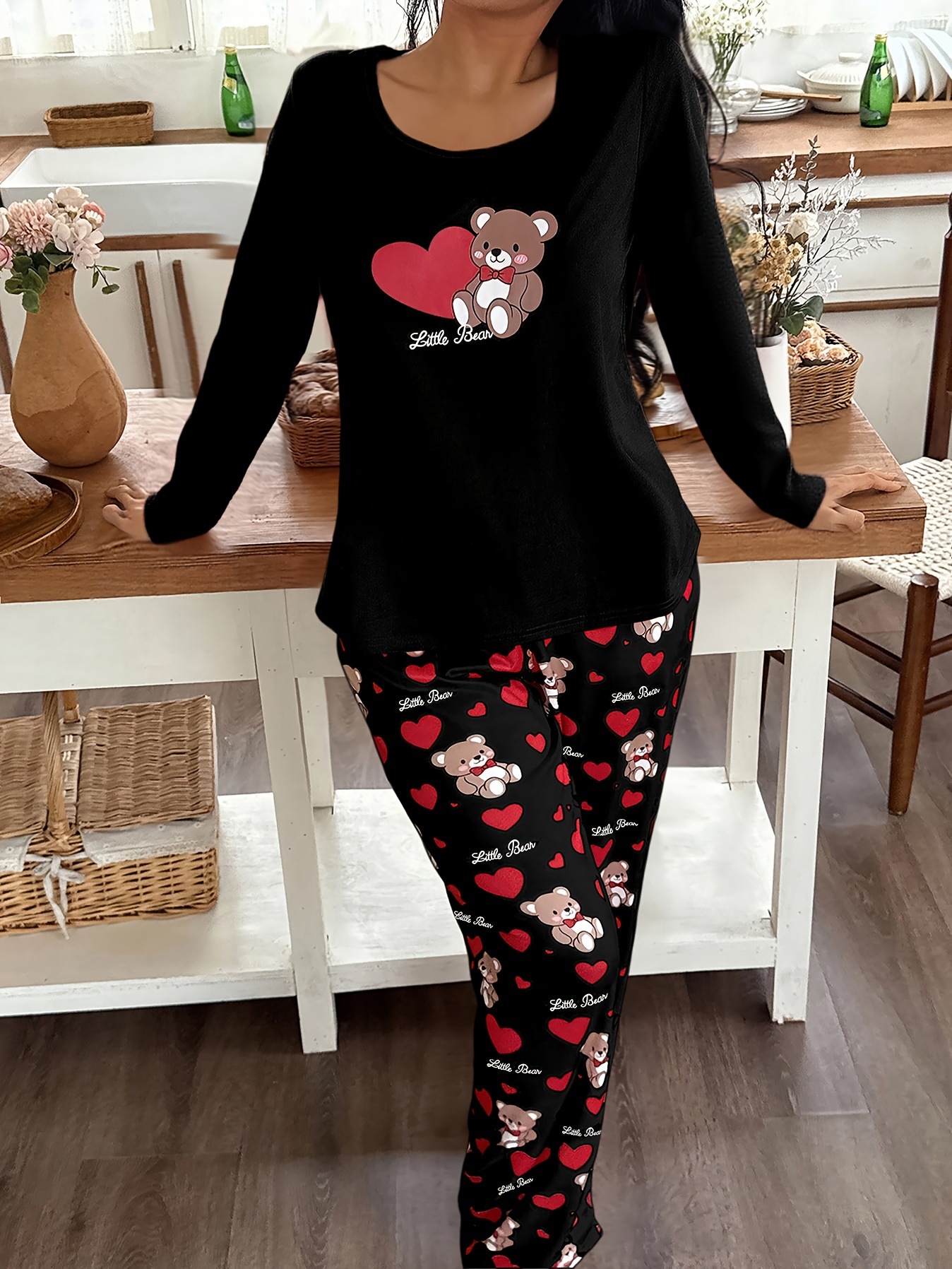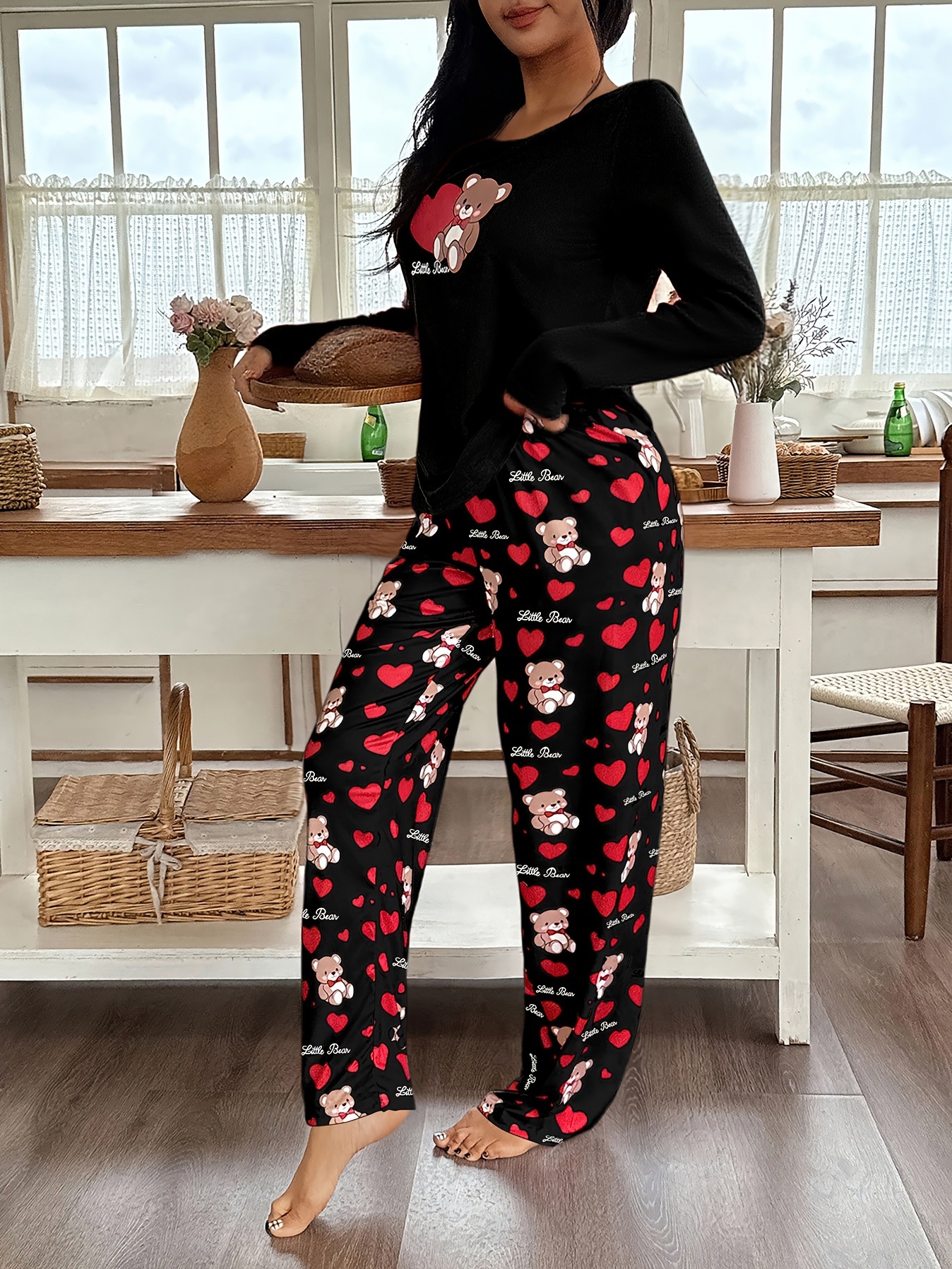 Womens Crew-Neck Bear And Heart Print Long-Sleeve Pajama Set With Long Pants