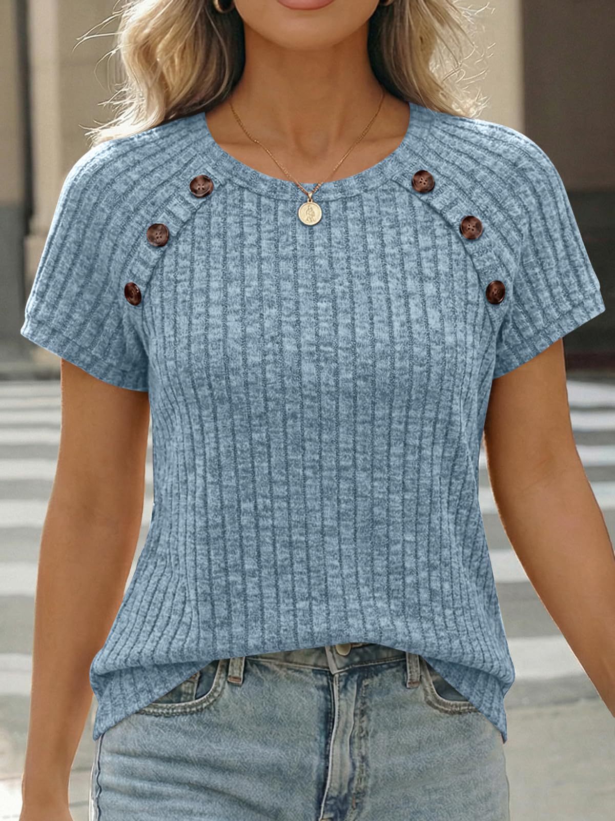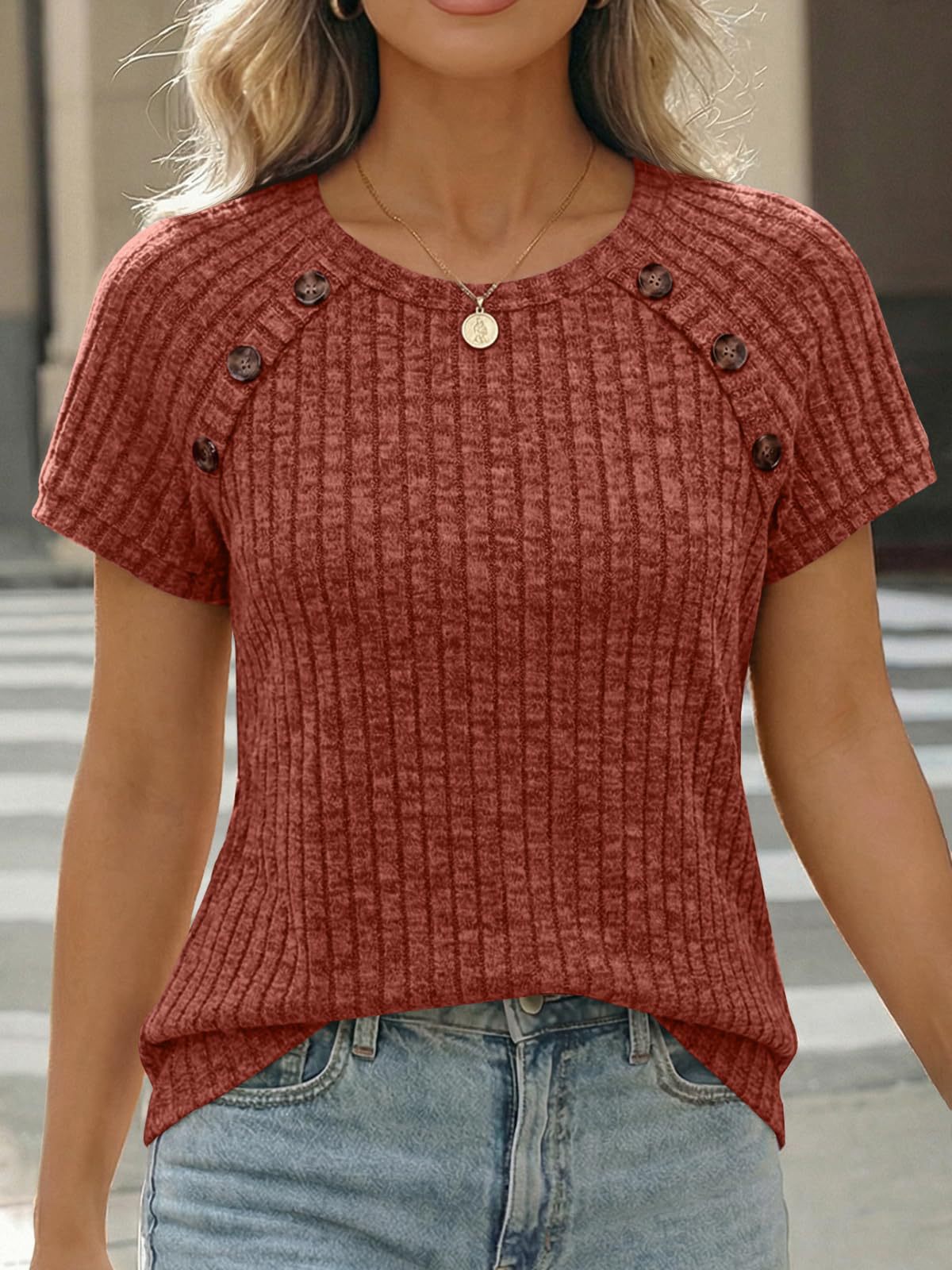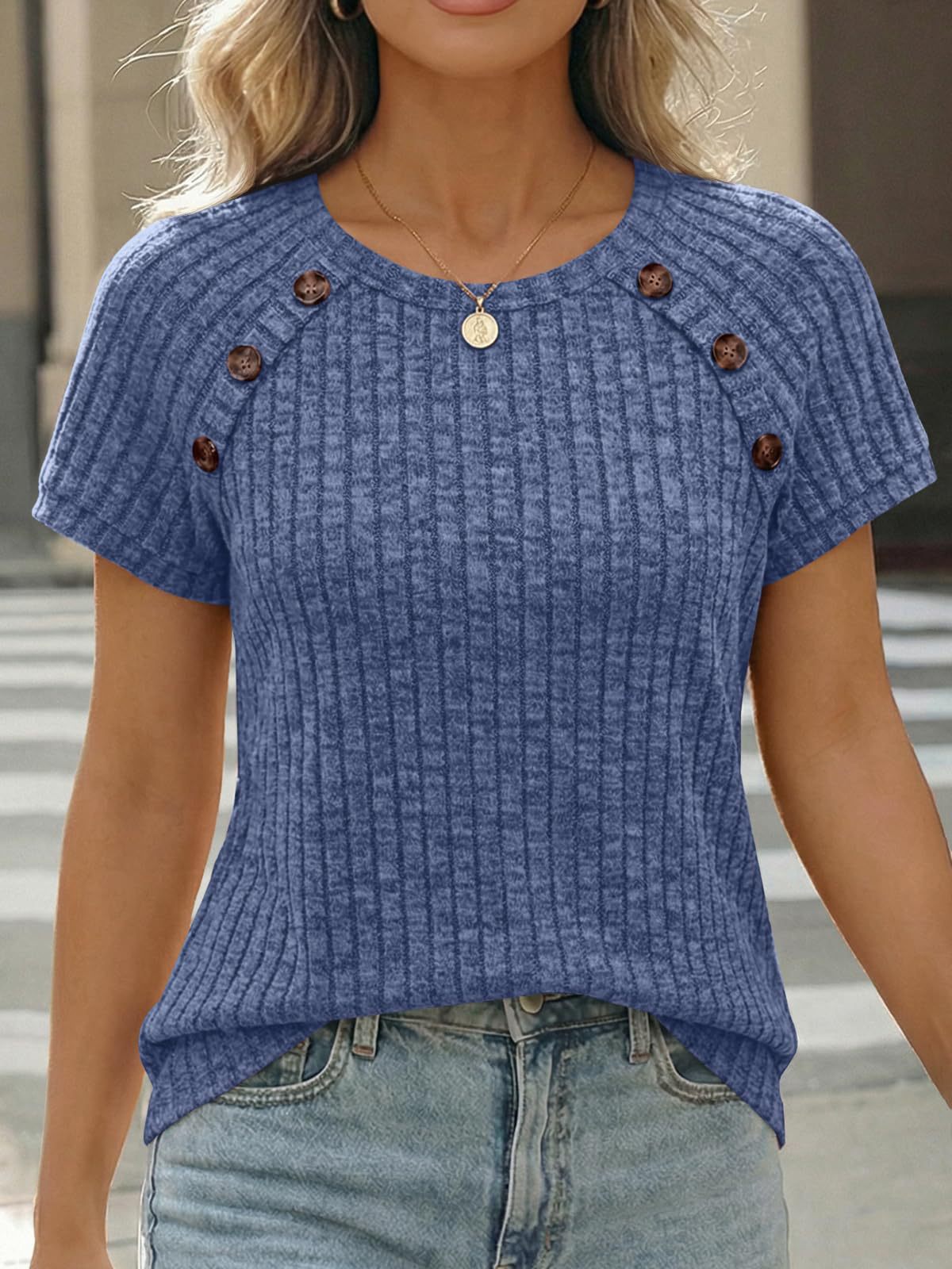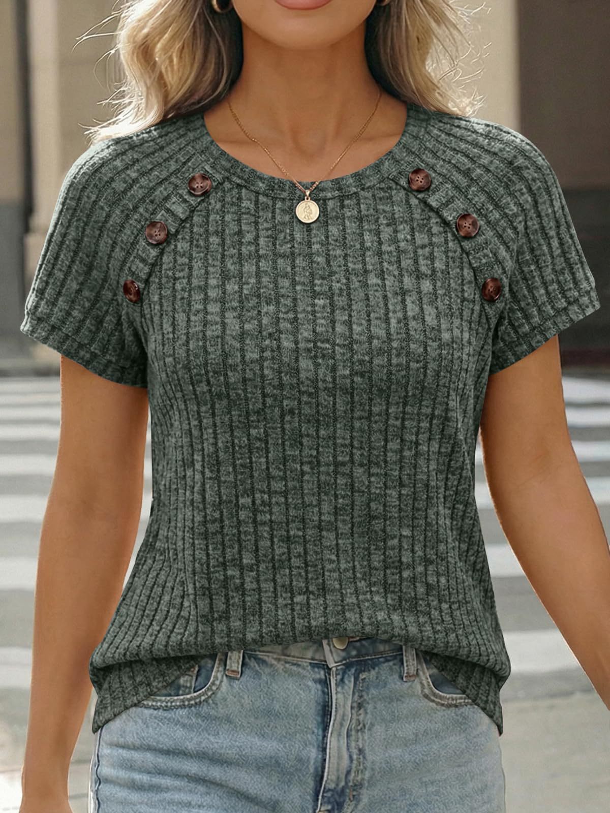 Womens Ribbed Crew-neck Button-panel Short-sleeve Top