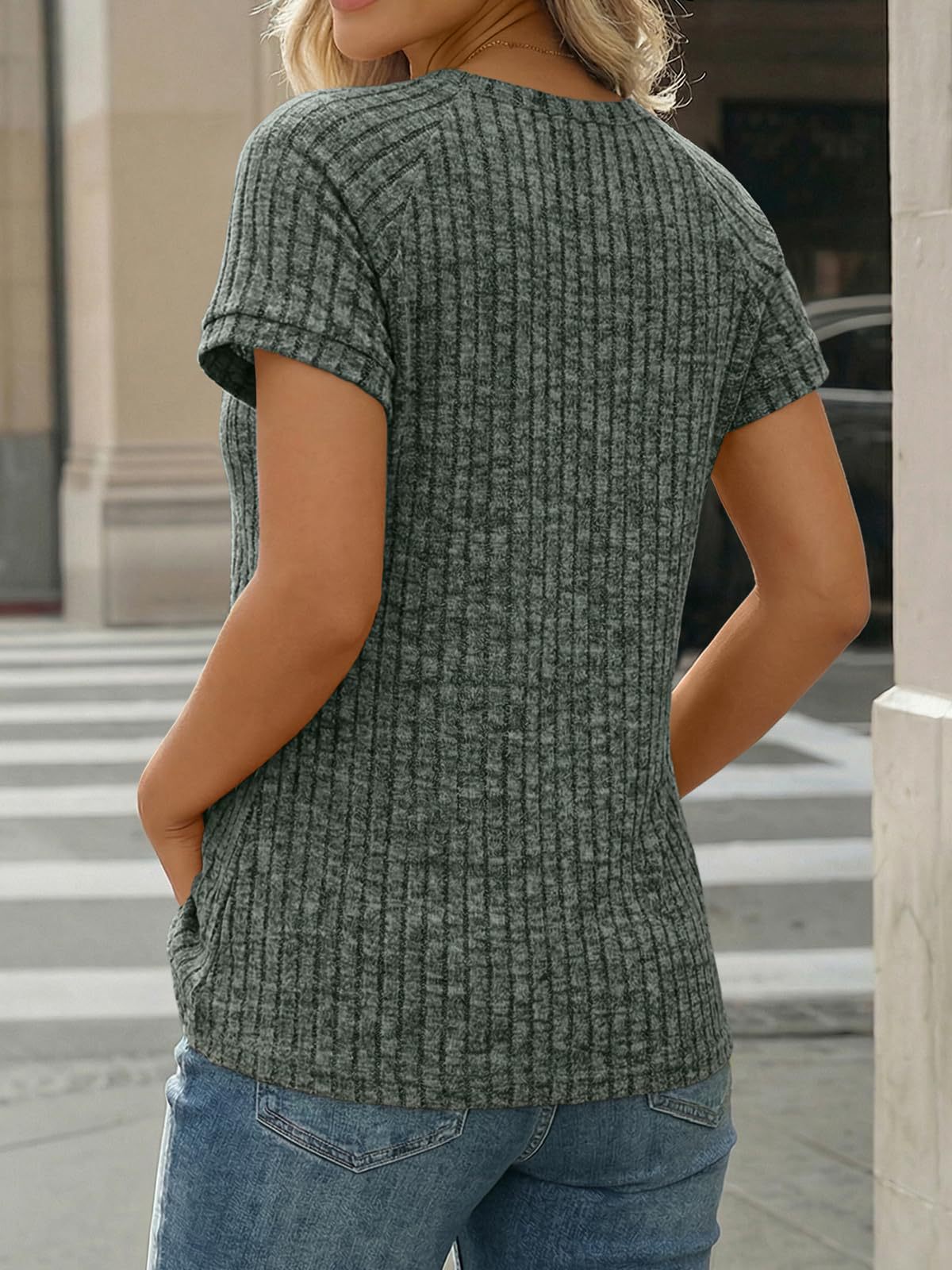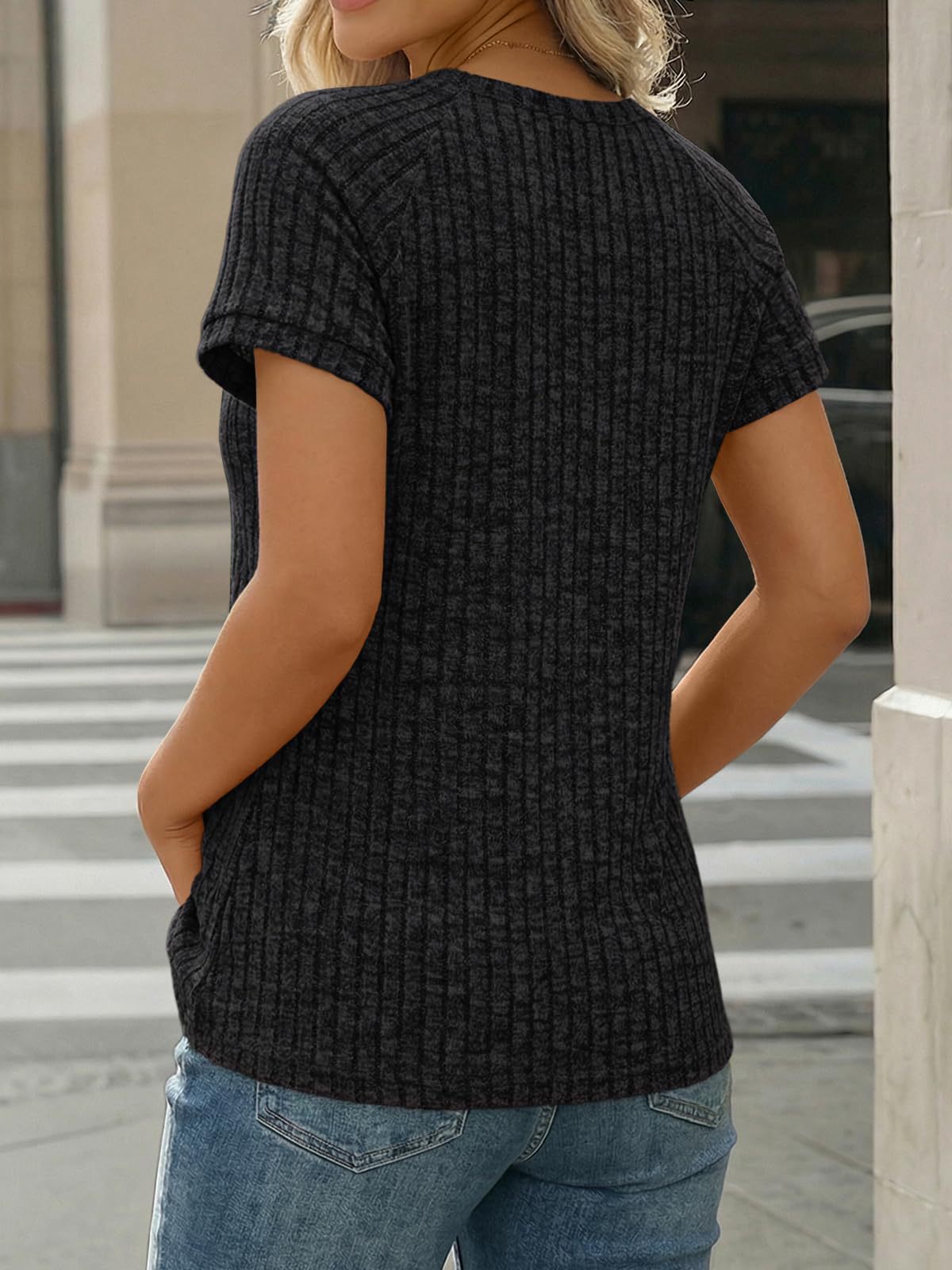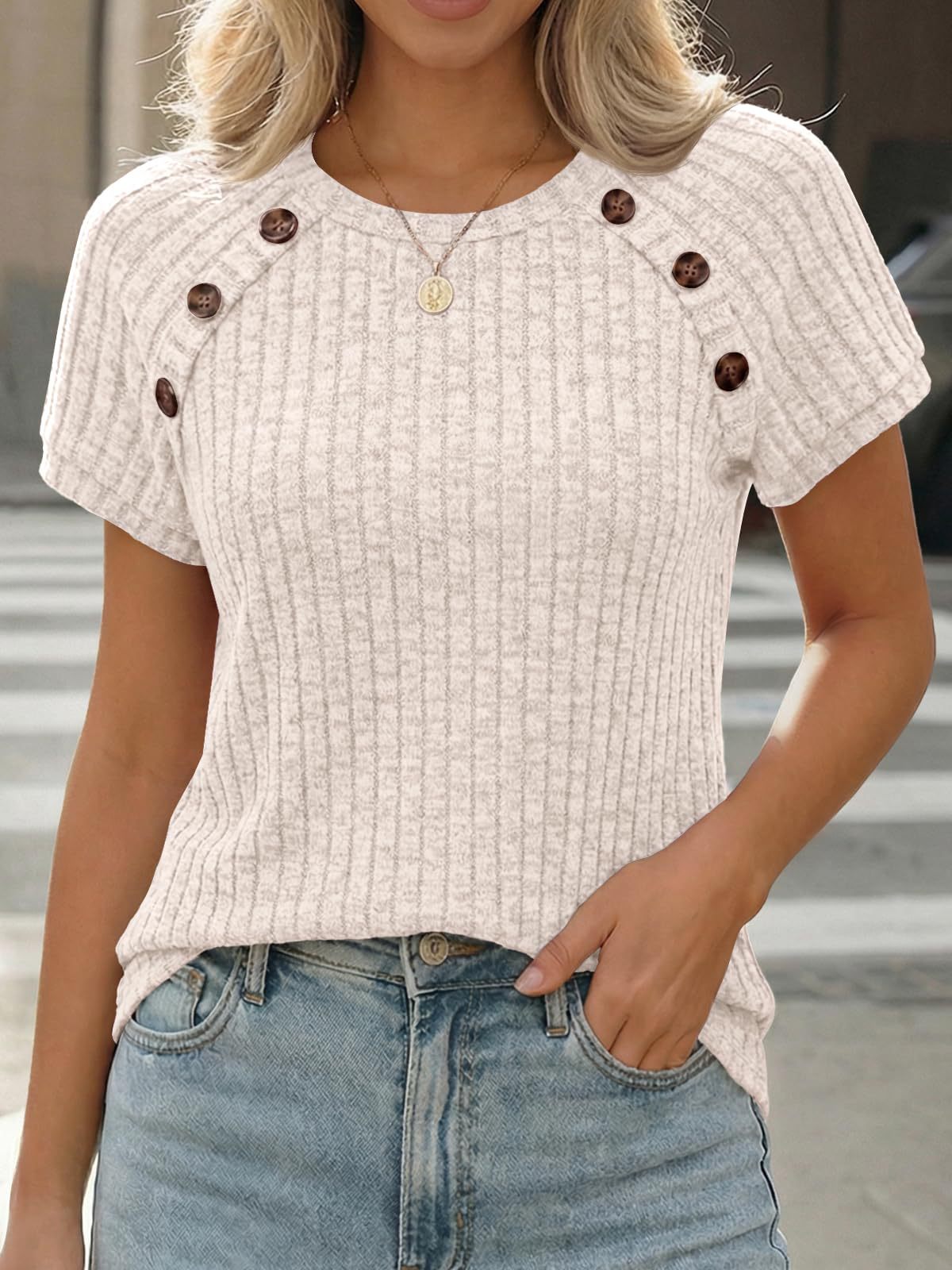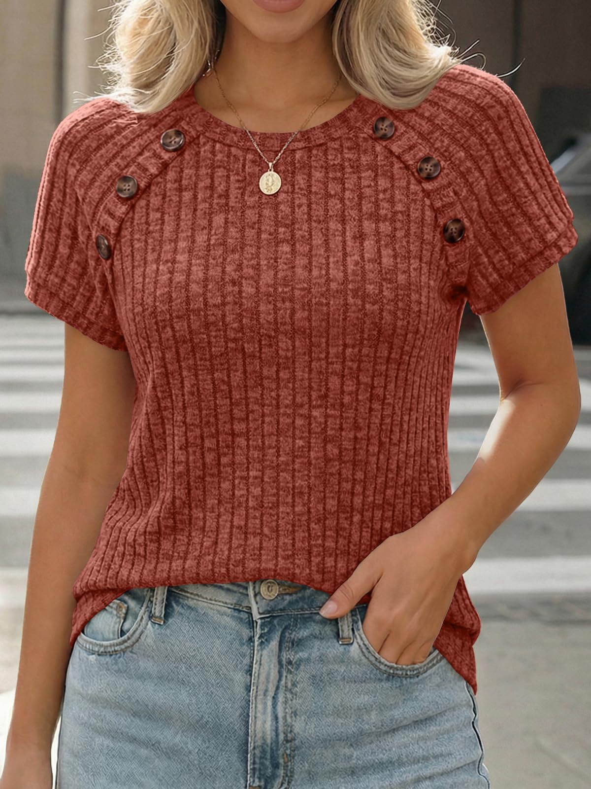 Womens Ribbed Crew-neck Button-panel Short-sleeve Top