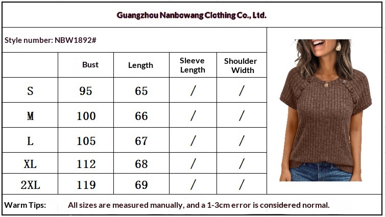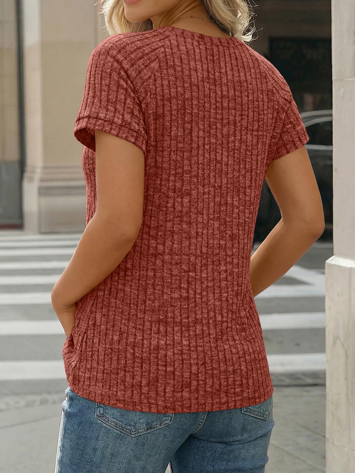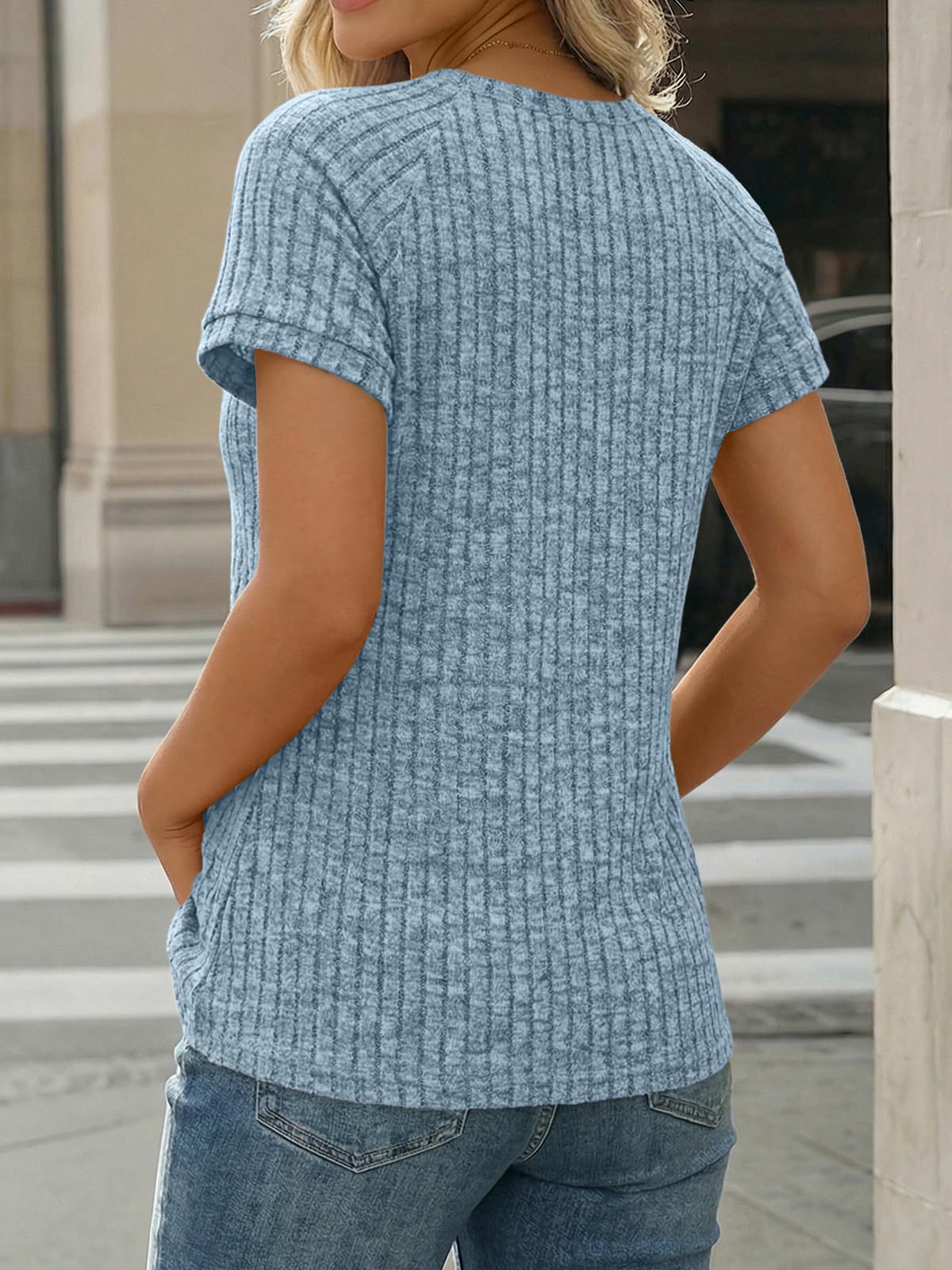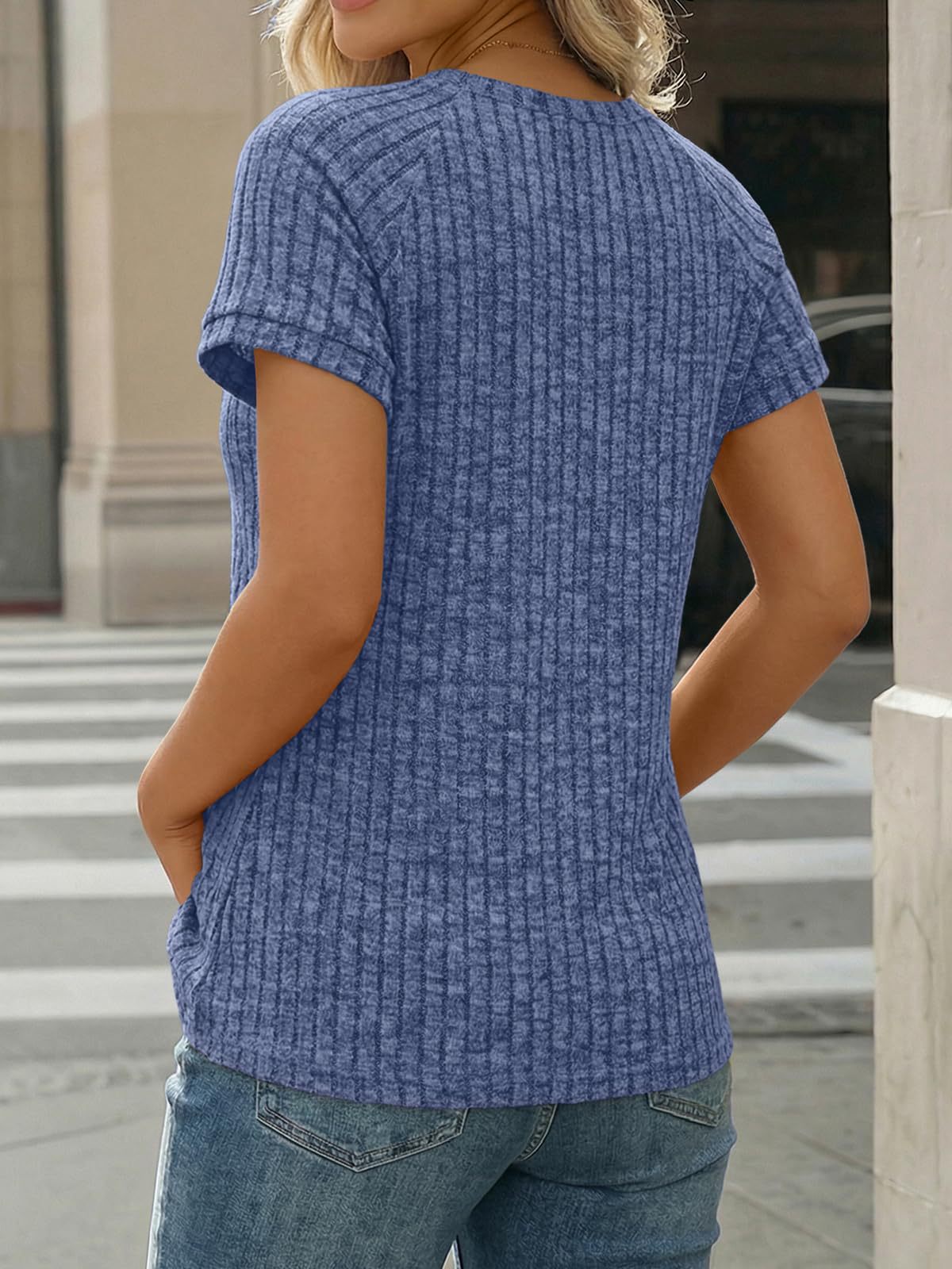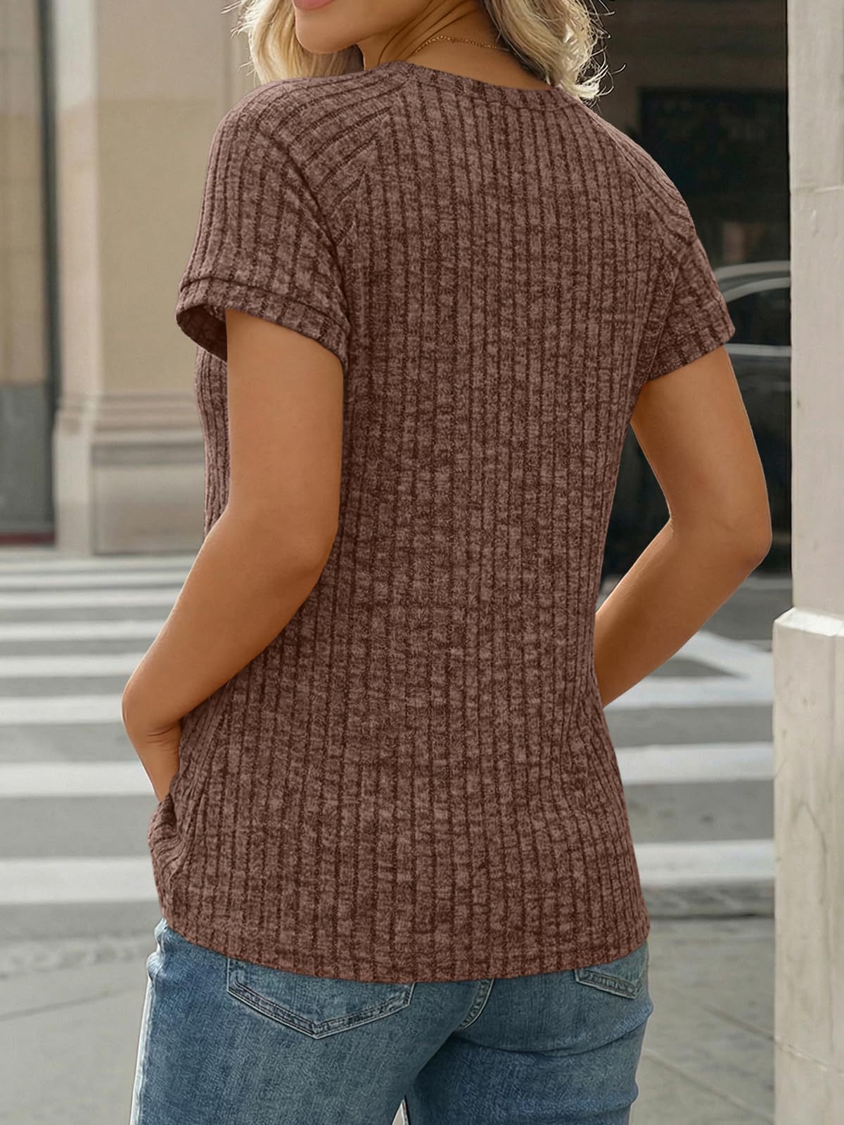 Womens Ribbed Crew-neck Button-panel Short-sleeve Top