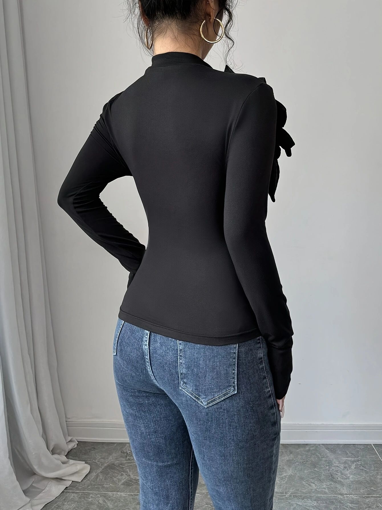 0 Review for Womens Slim-fit Floral High-neck Long-sleeve Top With Diamond Accents