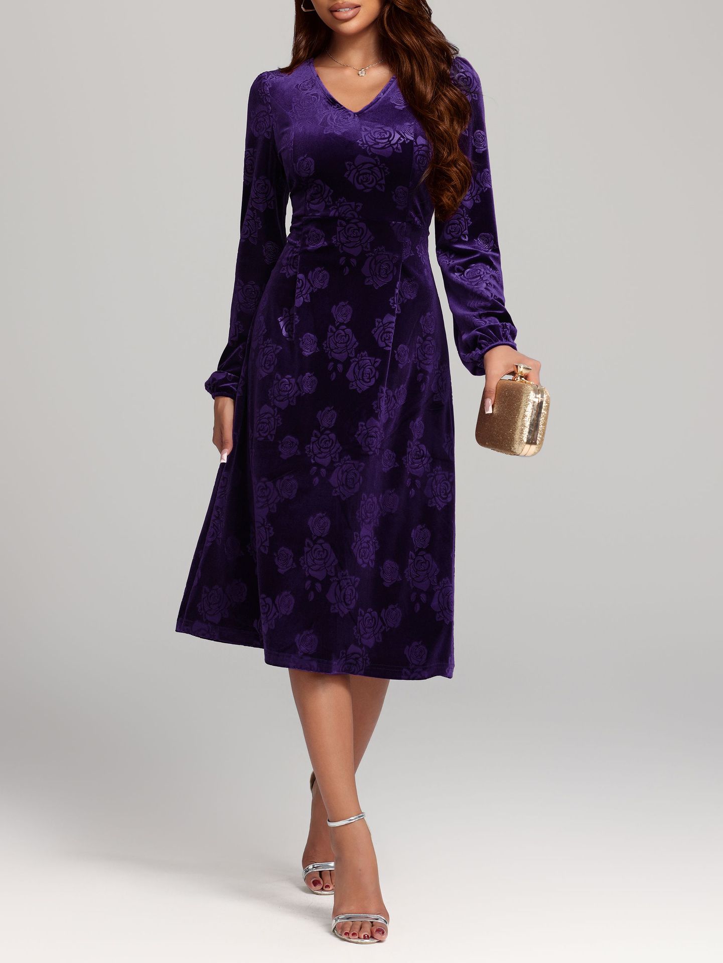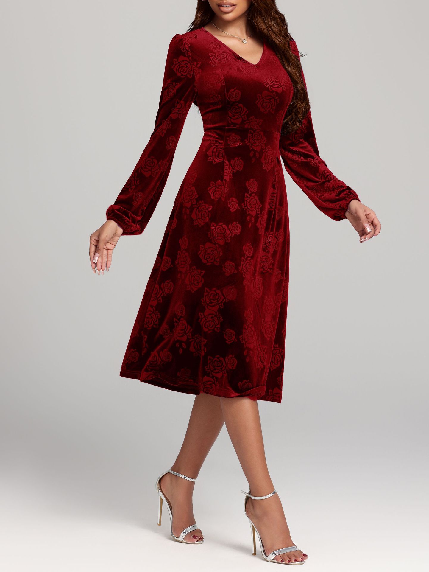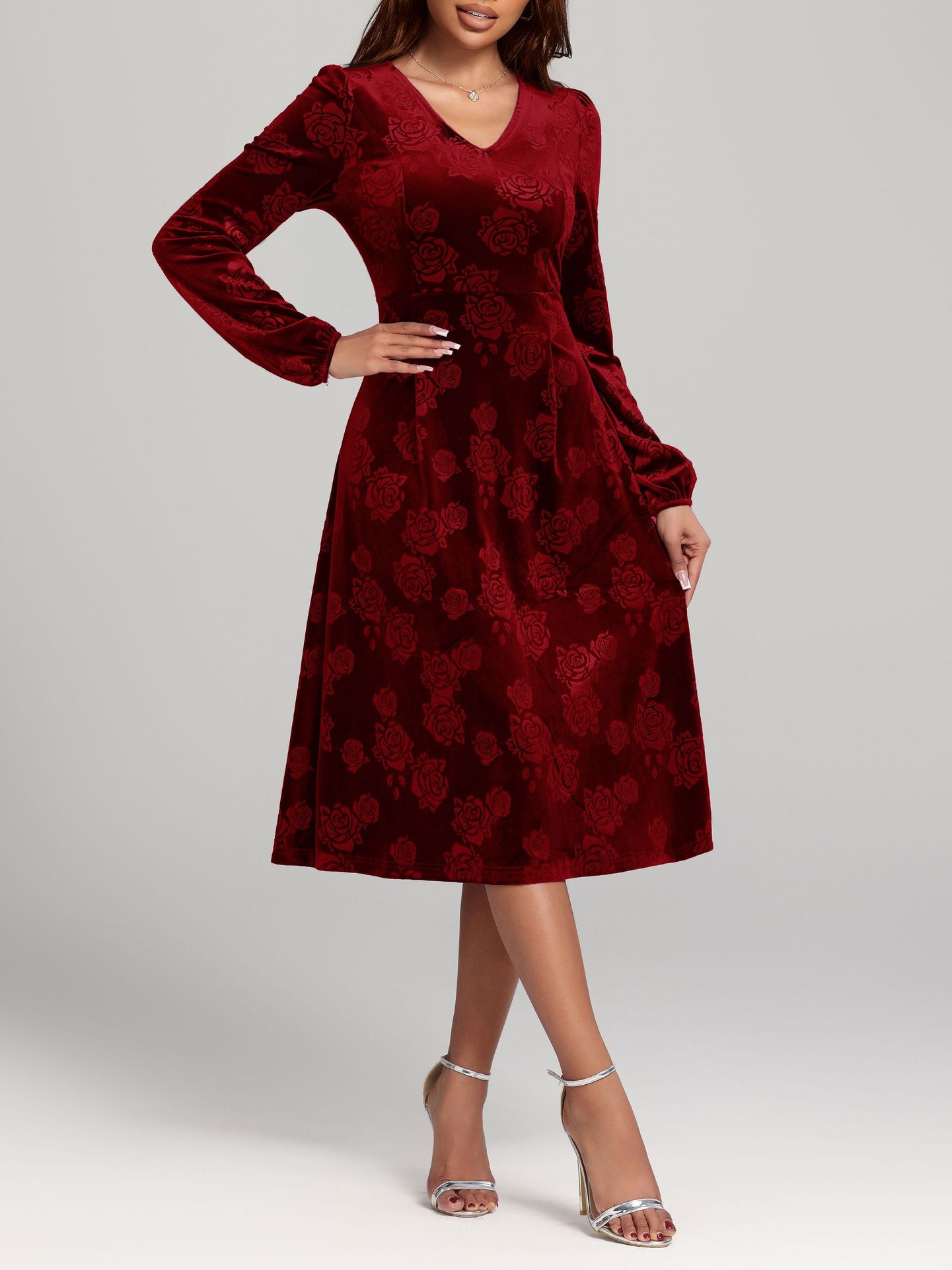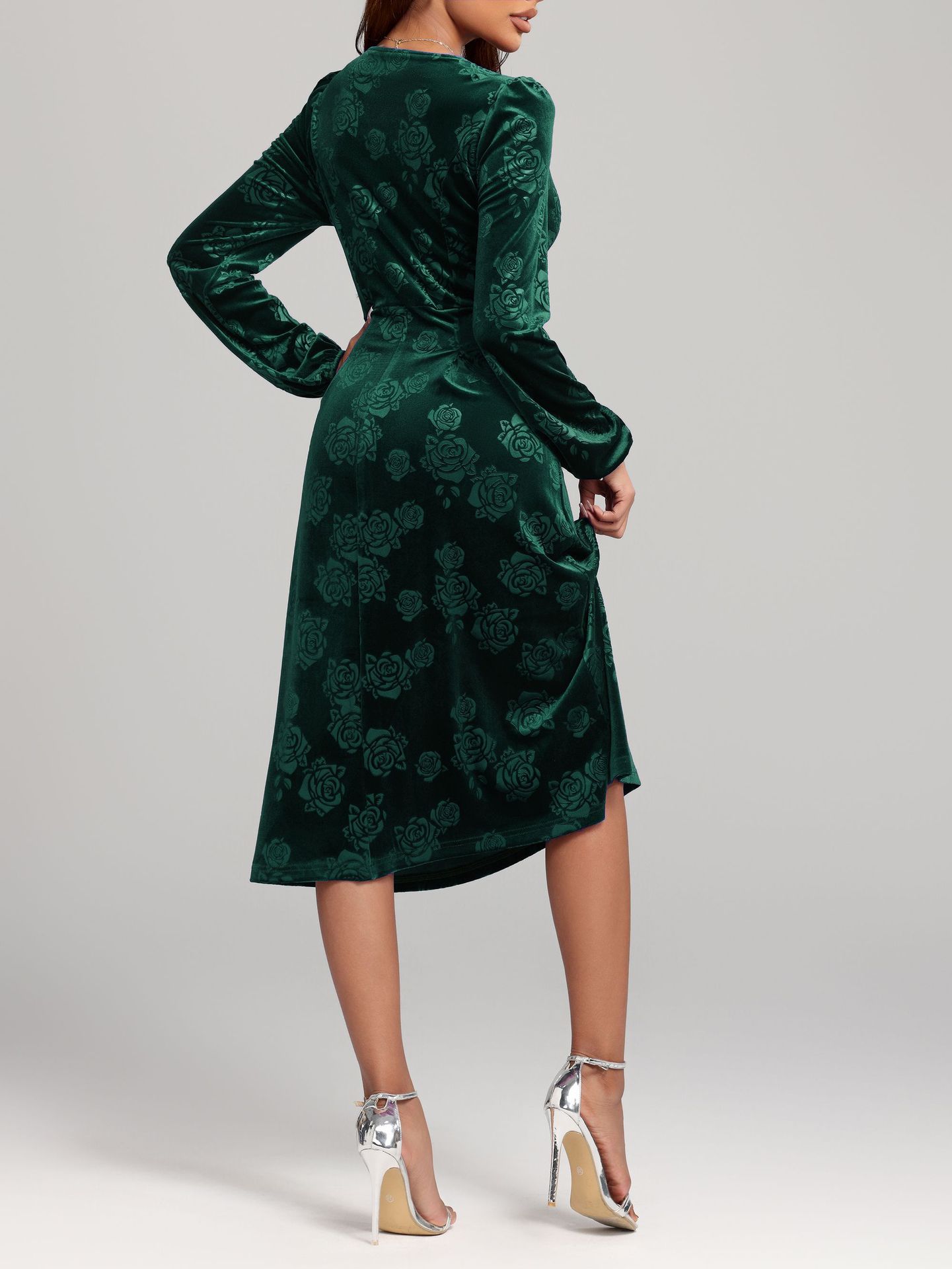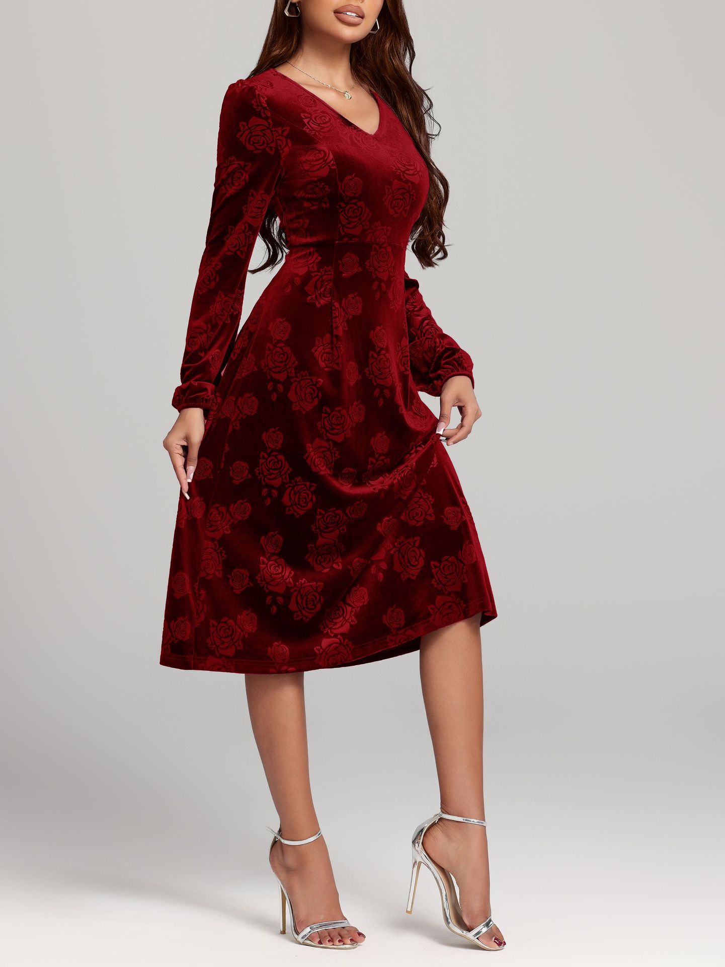 0 Review for Womens Solid-Color Mid-Length Gold Velvet Embossed V-Neck Dress