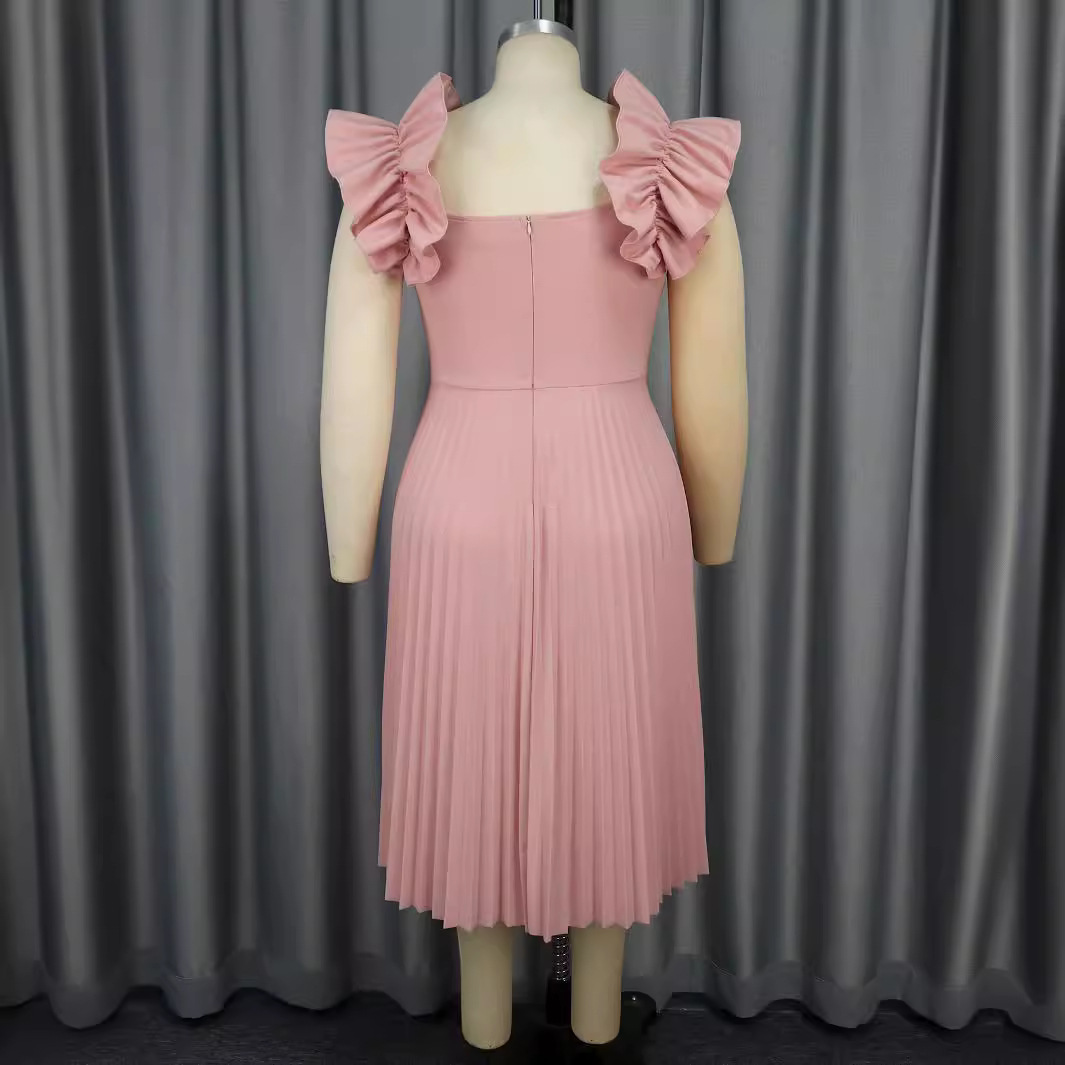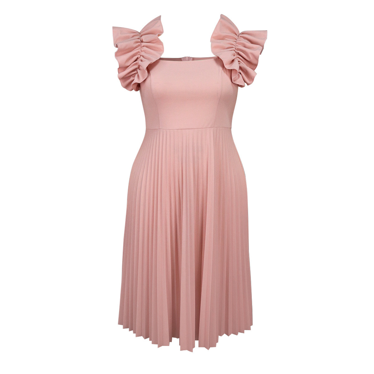 0 Review for Womens Solid-Color Ruffle-Sleeve Square-Neck Pleated Dress