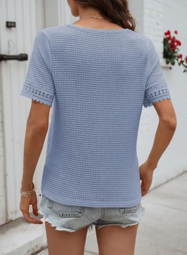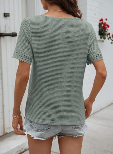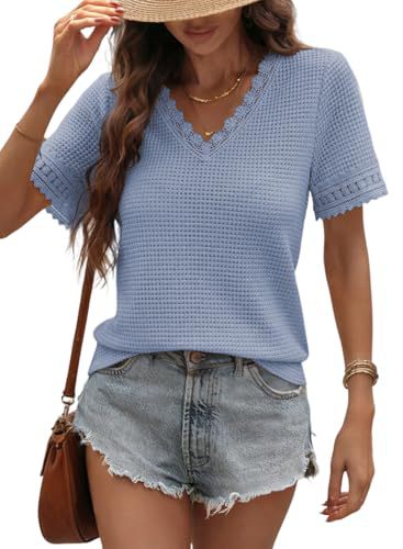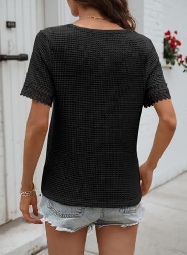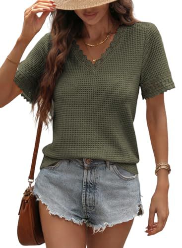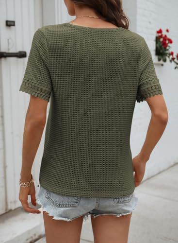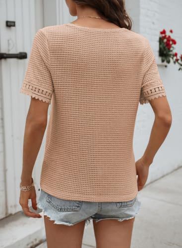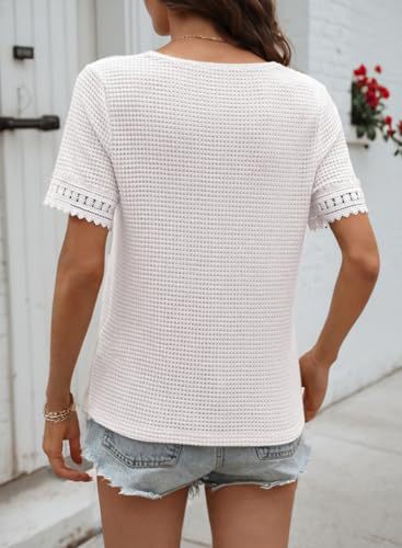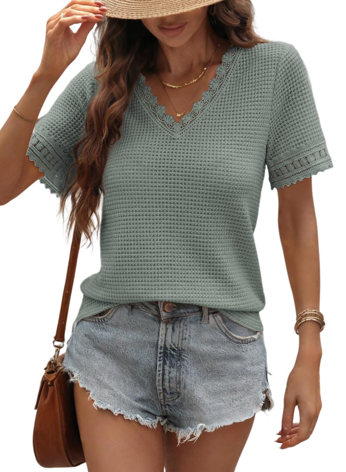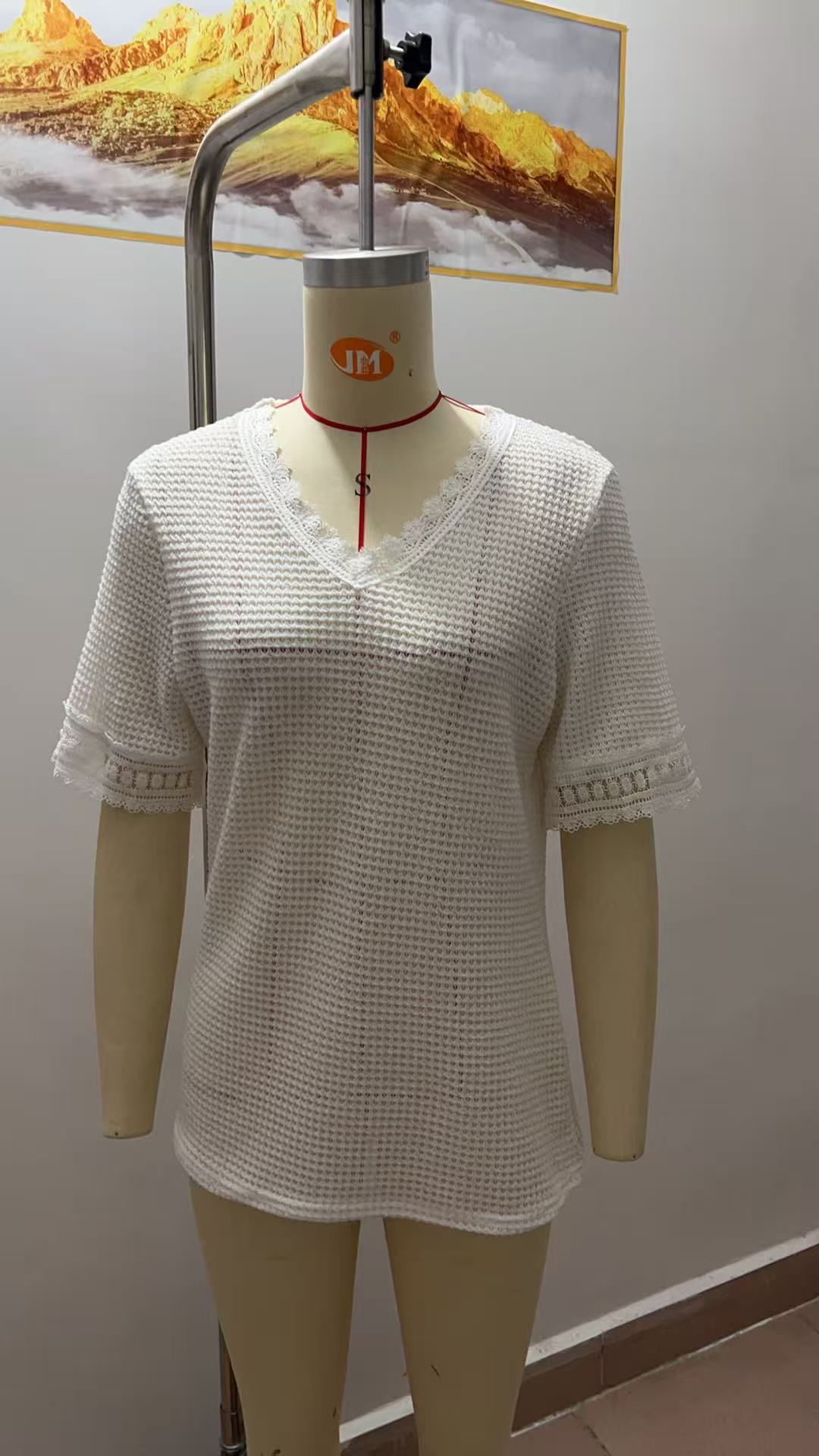 0 Review for Womens V-neck Casual Waffle-knit Lace-panel Short-sleeve Top