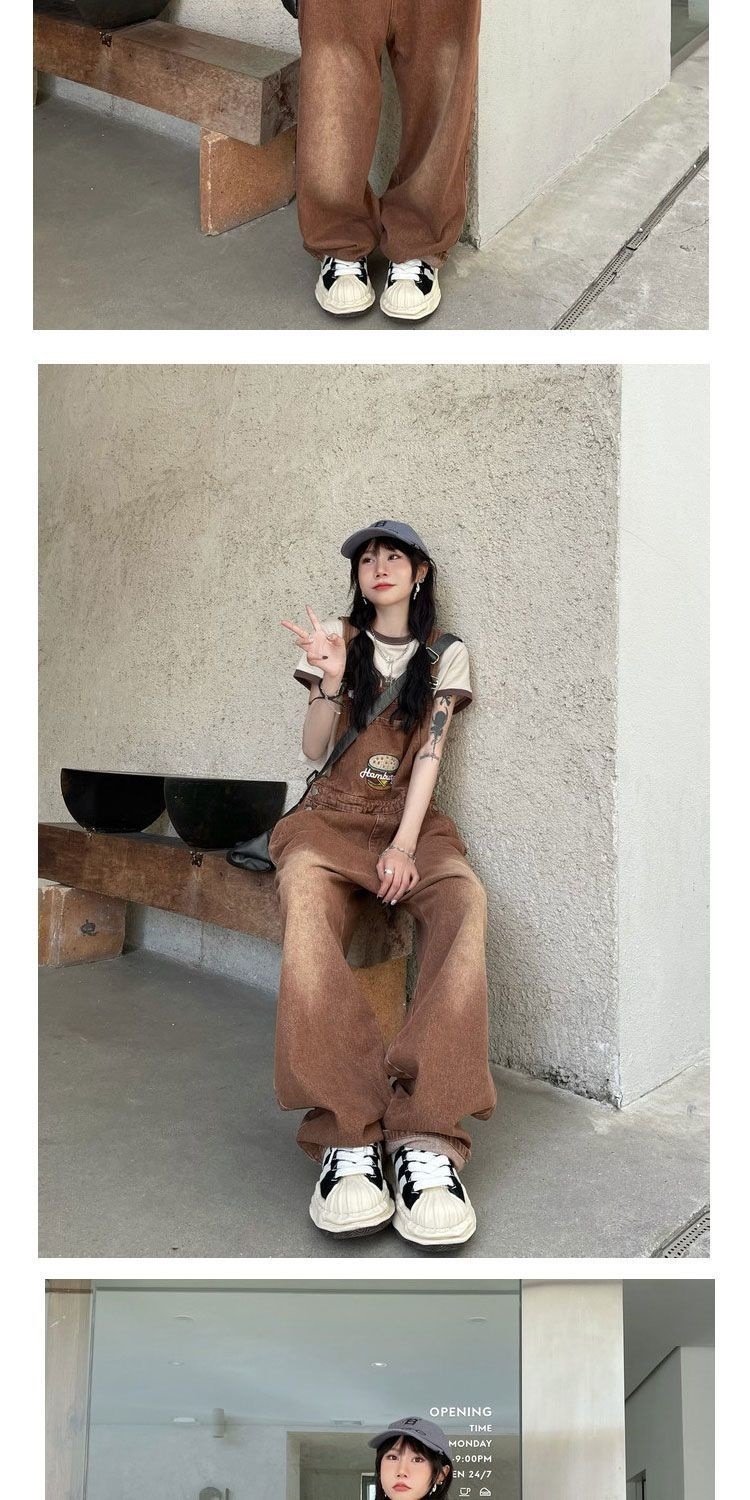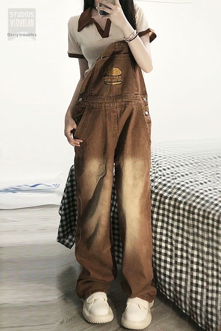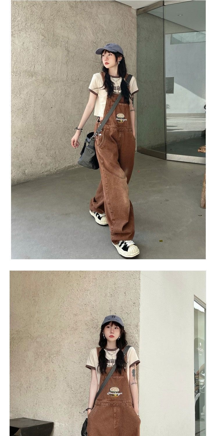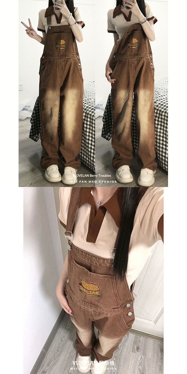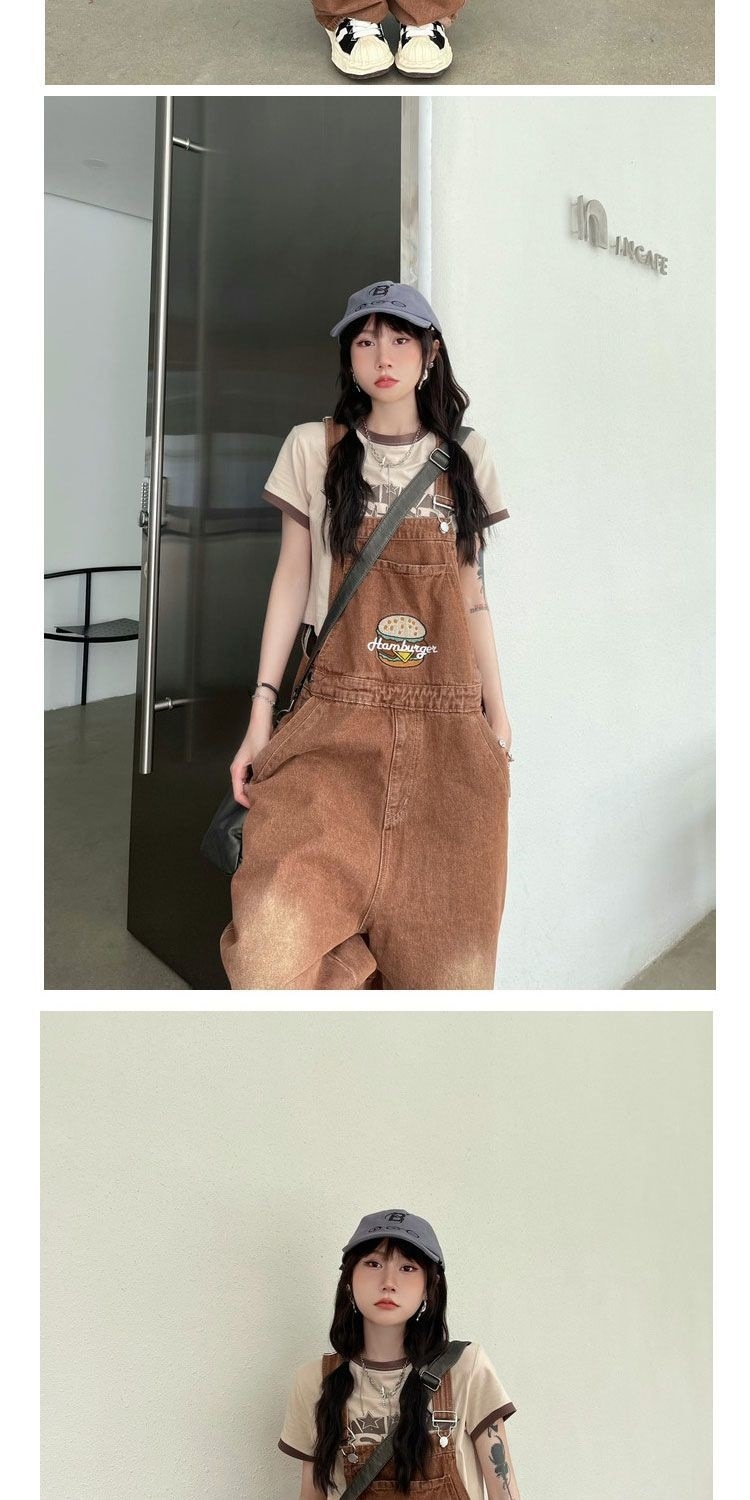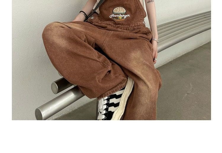 Youthful And Chic American-Style Burger Embroidery Denim Suspender Pants