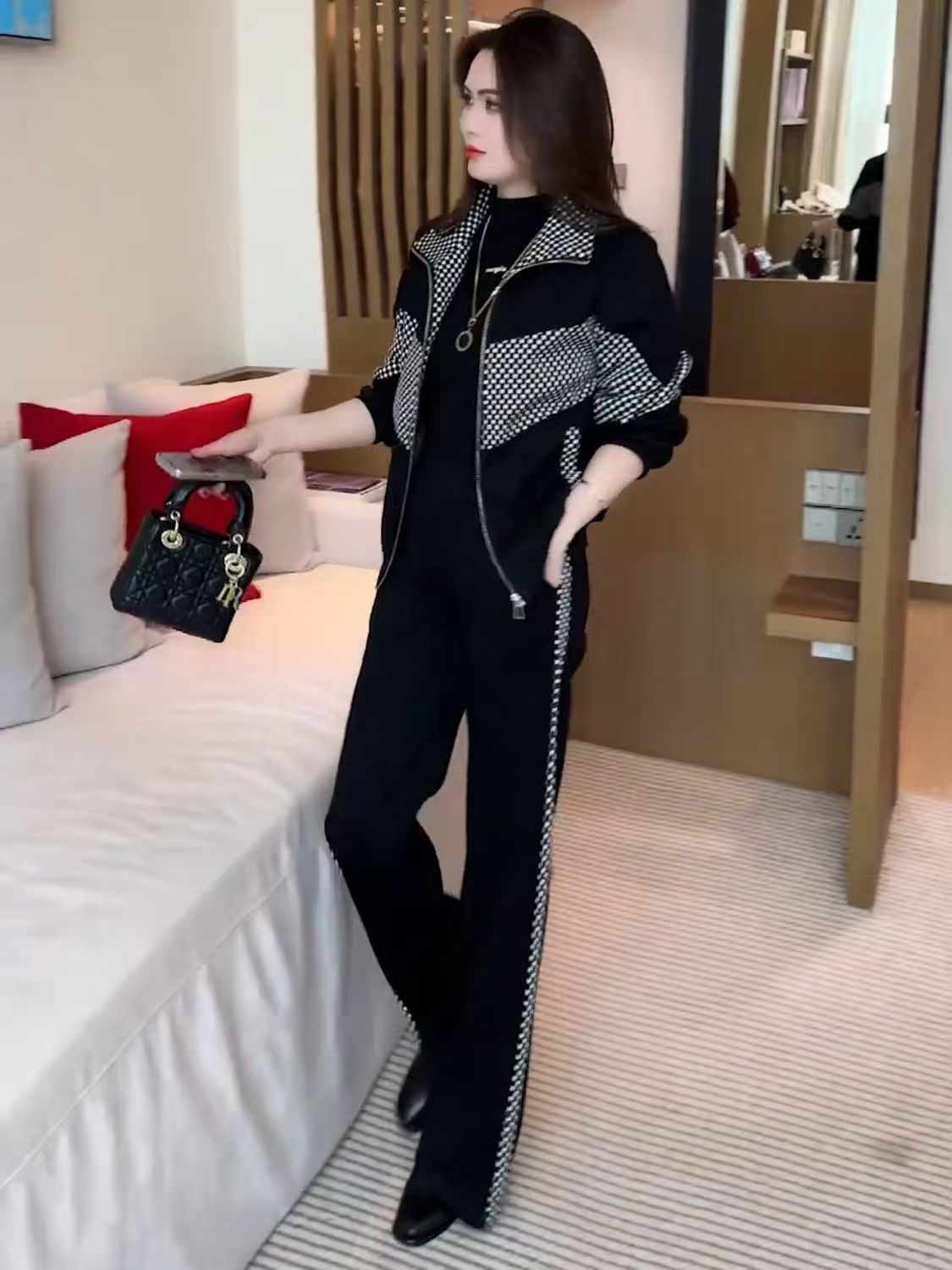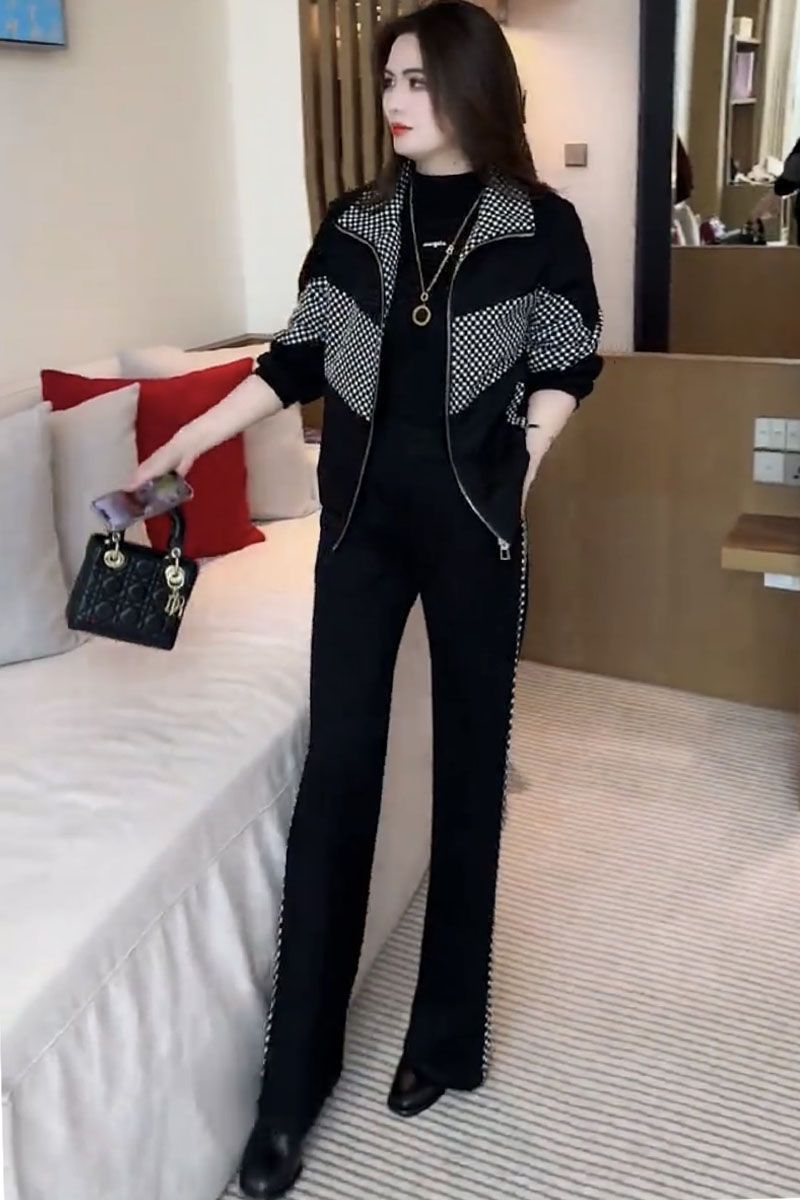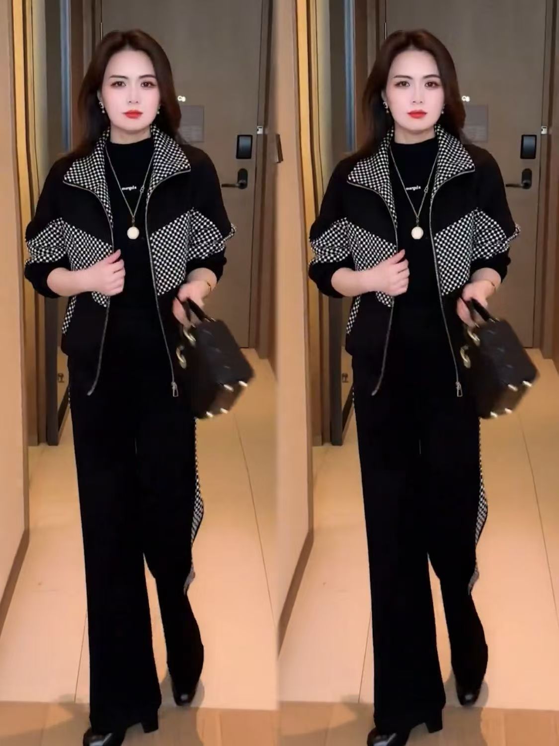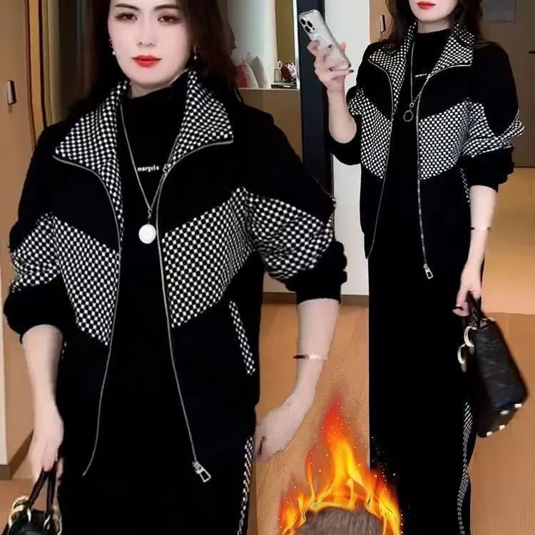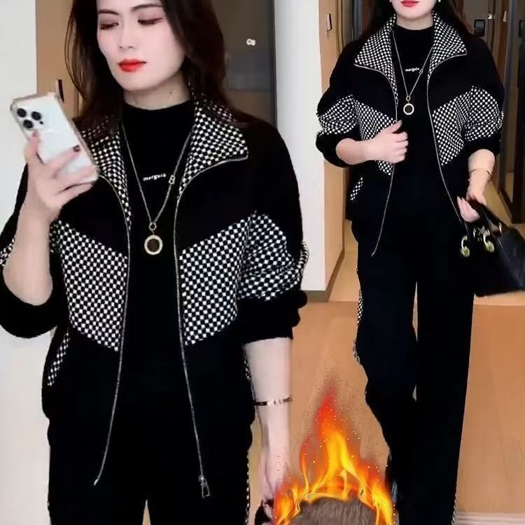 Youthful Patchwork Plaid High-End Western-Style Fleece-Lined Thickened Casual Set